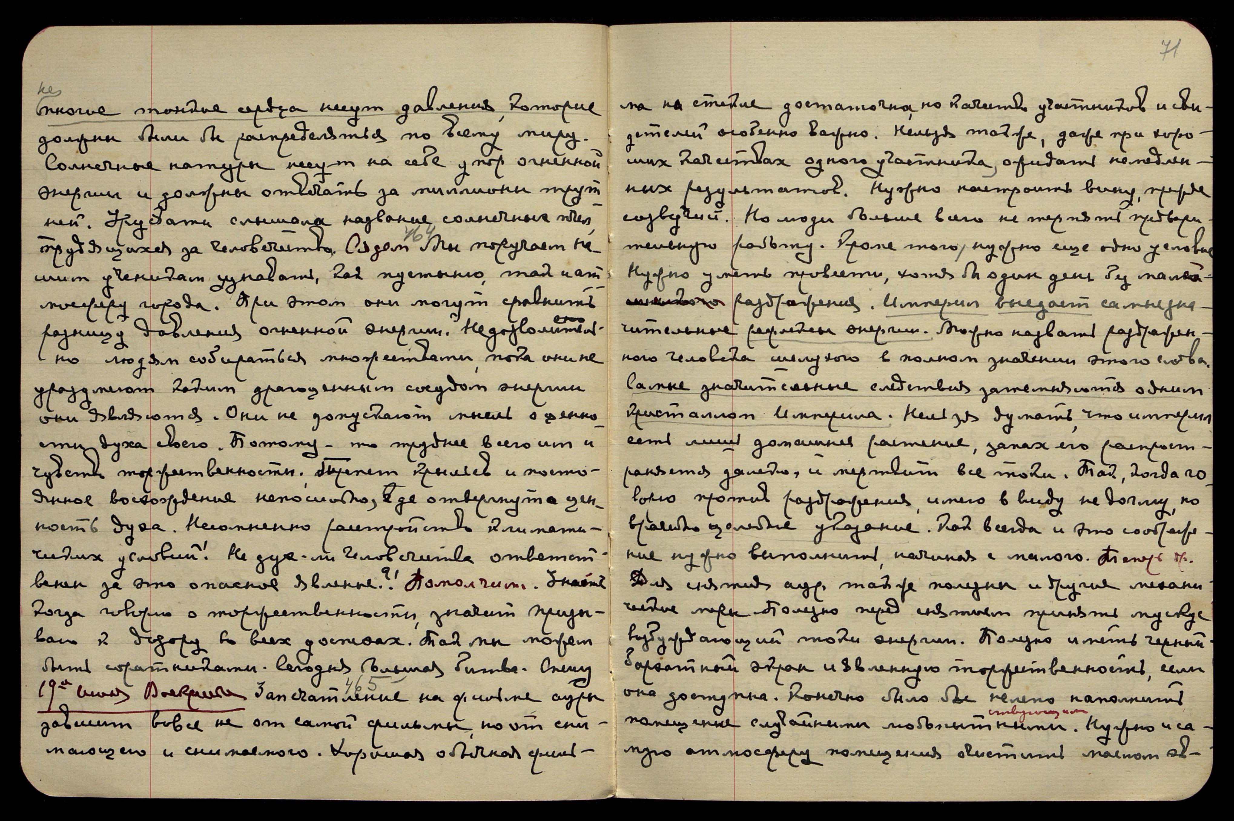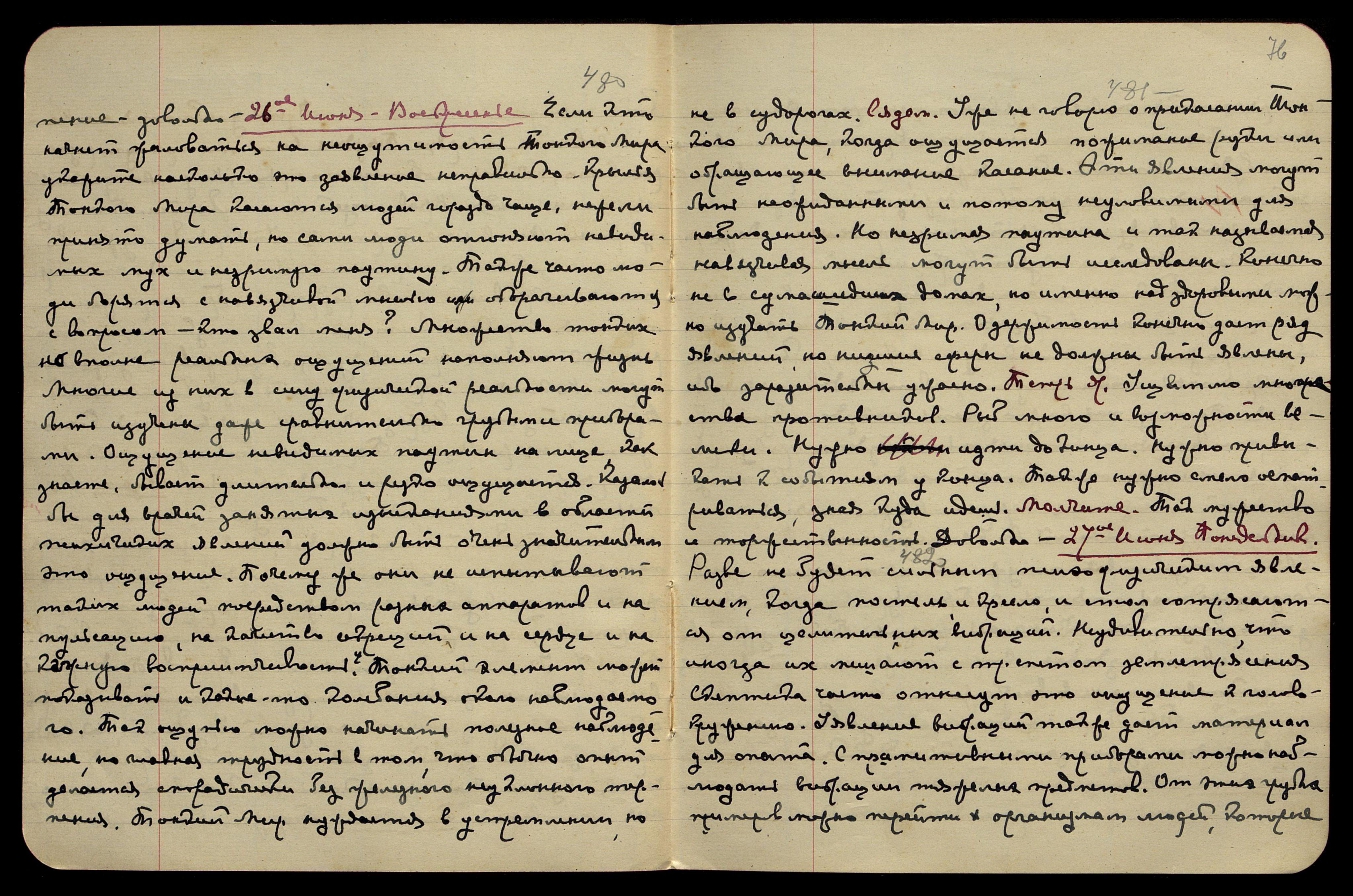 23-ье июня. Четв[ерг]. Утром пришла телеграмма из Ам[ерики], на кот[орую] был дан ответ: "Сообщите требования Института. Предоставьте адвокату достичь успеха любым способом". Довольно. Не следует формально приглашать, он сделает как указано сейчас. Вечер. [Сердце] § 474. Умирание человеческого и животного поколения, как и истощение производитель-