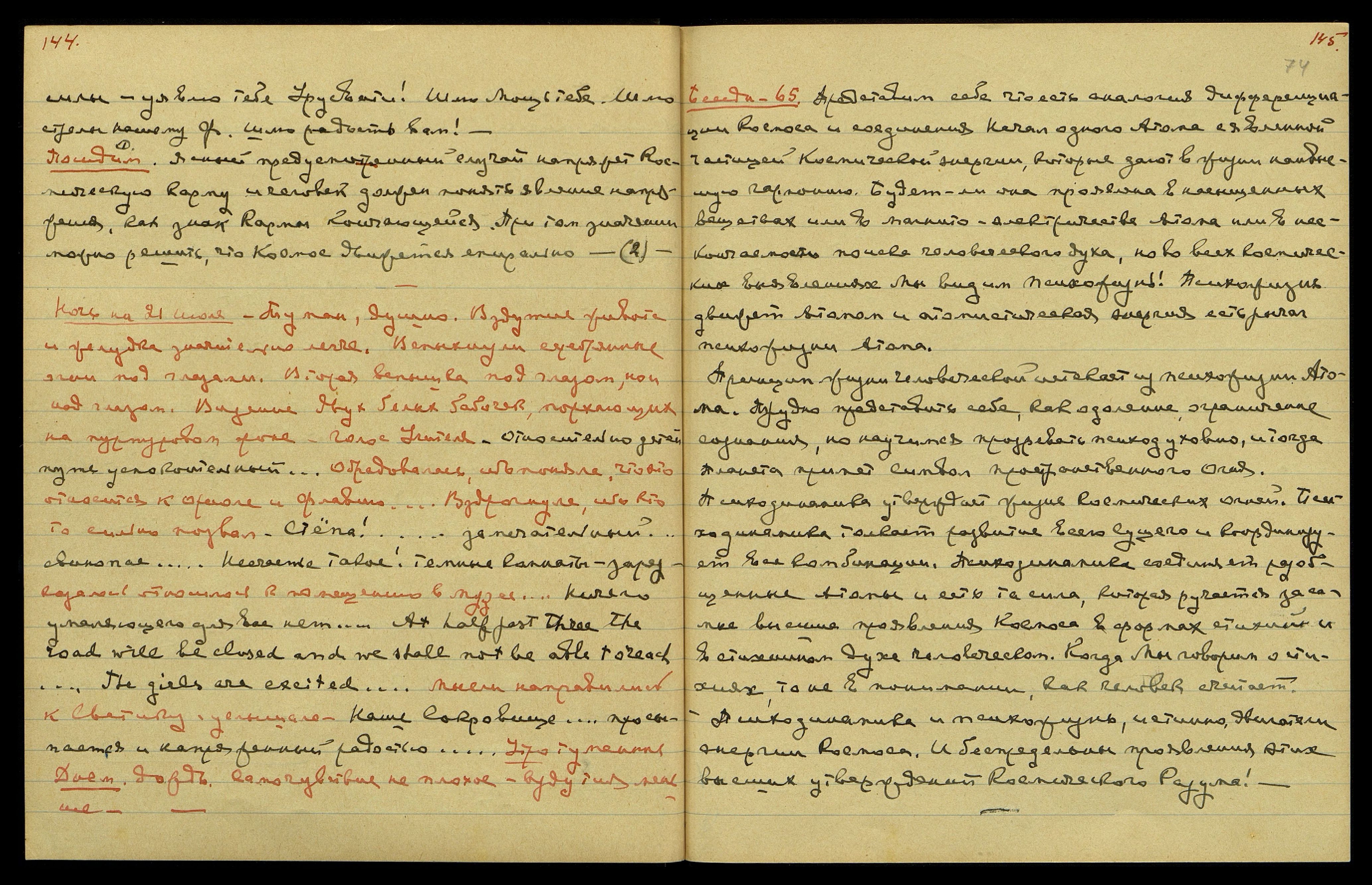 Ночь на 21 июля. Туман, душно. Вздутие живота и желудка значительно легче. Вспыхнули серебряные огни под глазами. Вторая вспышка [не только] под глазом, но и над глазом. Видение двух белых бабочек, порхающих на пурпуровом фоне. Голос Учителя: "Относительно детей путь успокоительный". Обрадовалась, ибо поняла, что это относится к Ориоле и Флавию.* Вздрогнула, ибо кто-то сильно позвал: "Стёпа! ...замечательный... свинопас... Несчастье такое!" "Тёмные комнаты зарезервированы", − казалось, относилось к помещению в музее. "Ничего умаляющего для вас нет... At half part three the road will be closed and we shall not be able to read. The girls are excited... [англ: В половине третьего дорога будет закрыта, и мы не сможем читать. Девочки в восторге...]" Мысли направились к Светику. Услышала: "Наше сокровище... просыпается и напряжённый радостью..." Утро туманное.