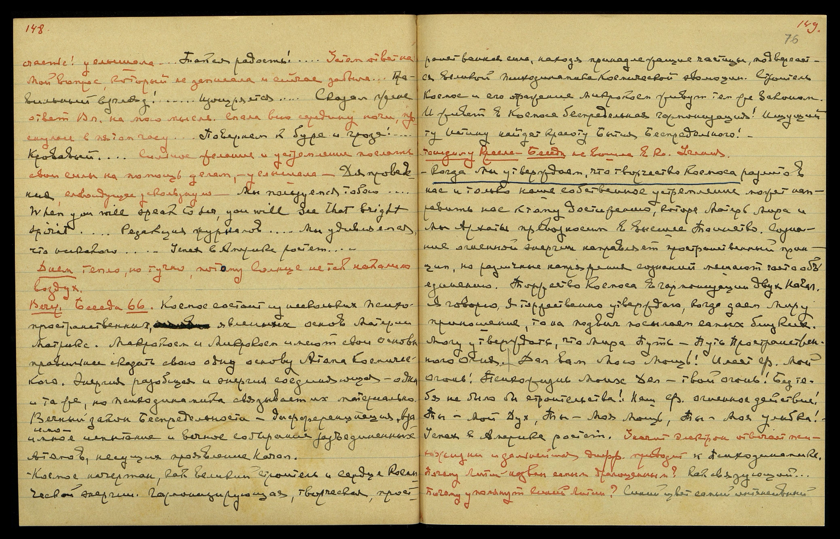 счастье! Услышала: "Такая радость!" Затем ответ на мой вопрос, который не записала и сейчас забыла. "Правильный взгляд! Изощряется..." "Сказал жене", − ответ Владыки на мою мысль. Спала всю середину ночи, проснулась в пятом часу. "Повернём к буре и грозе! Кровавый..." Сильное желание и устремление послать свои силы на помощь делам. Услышала: "Для проведения...", − слово идущее ускользнуло. "Мы пользуемся тобою... When you will speak to her, you will see that bright spirit... [англ: Когда вы заговорите с ней, вы увидите этот светлый дух...] Редакция журналов... Мы удивляемся, что никакого... Успех в Америке растёт..."
