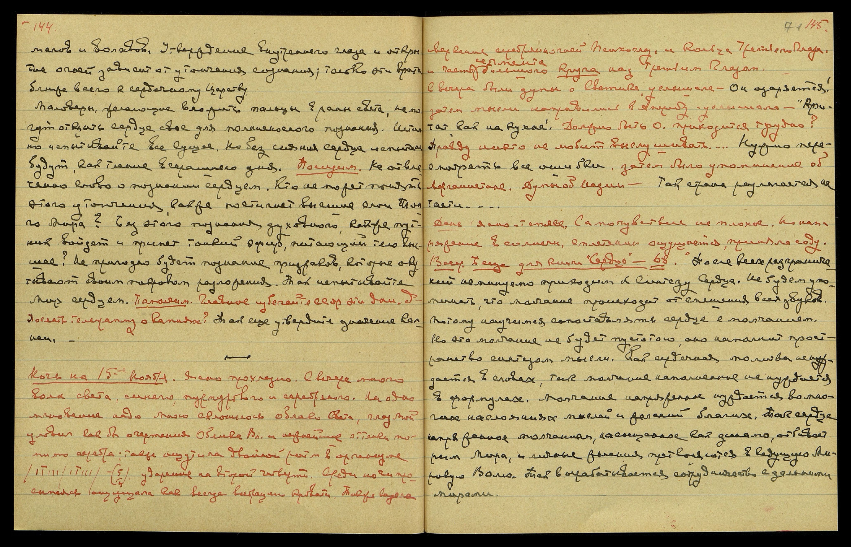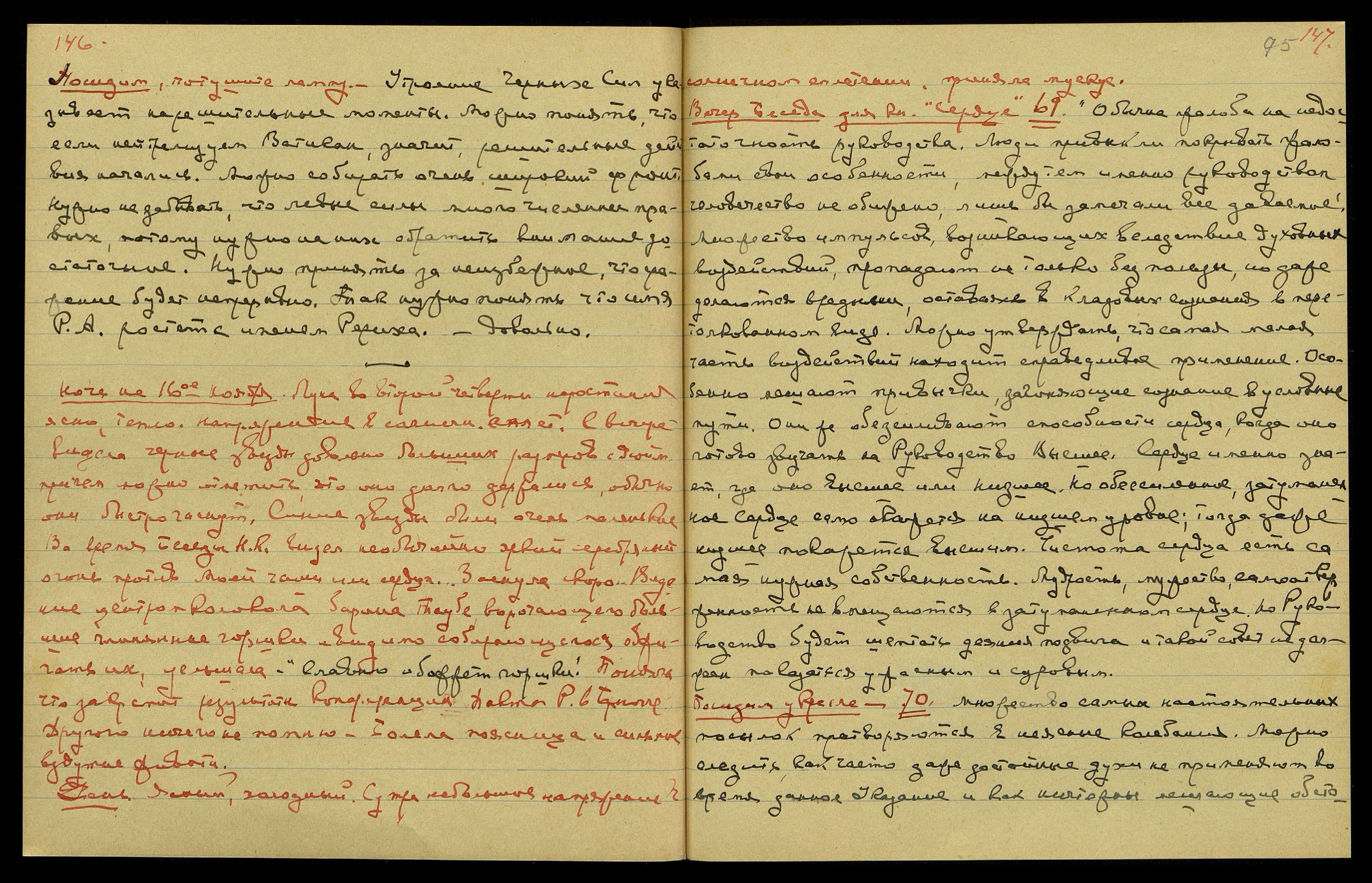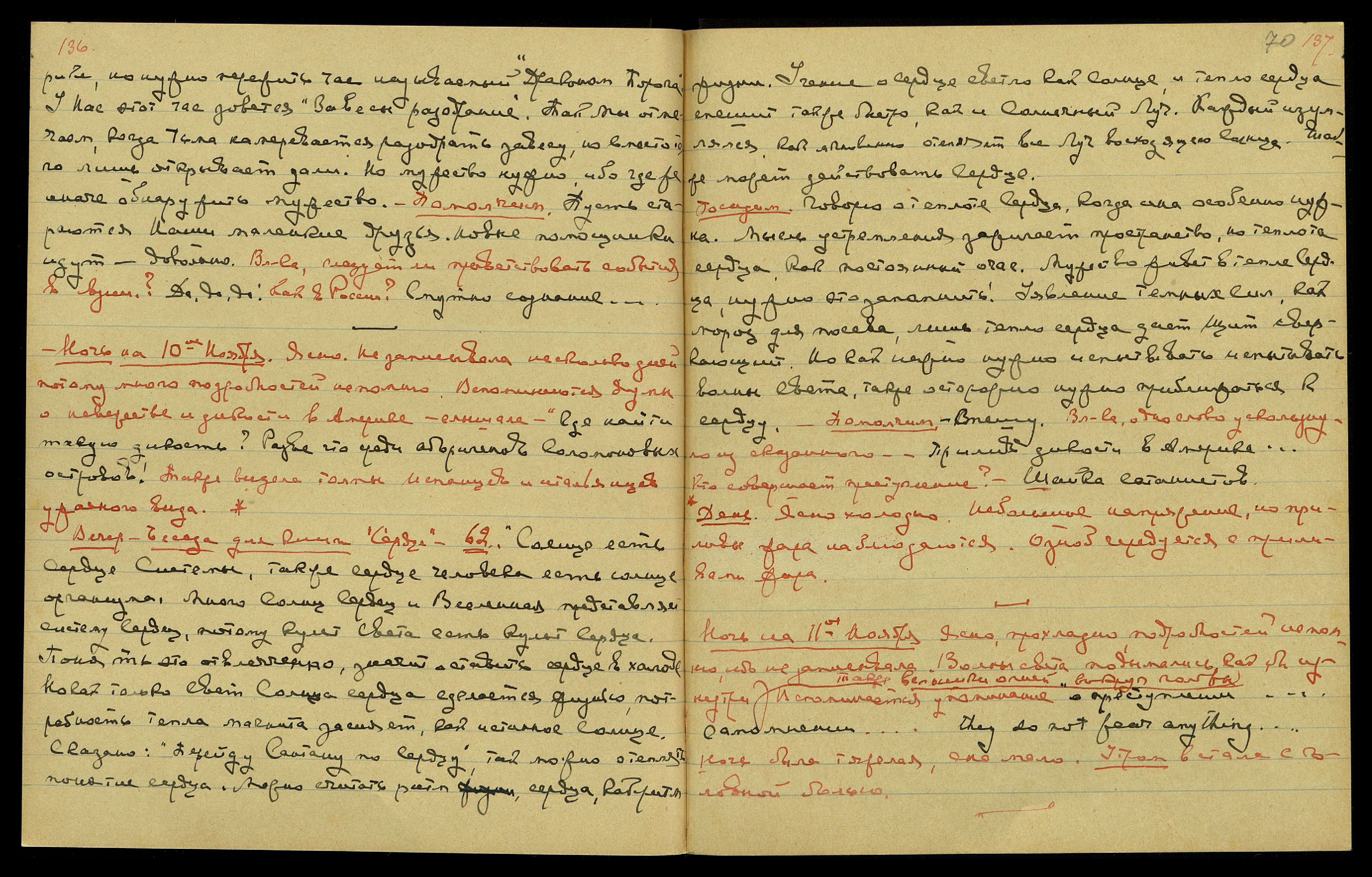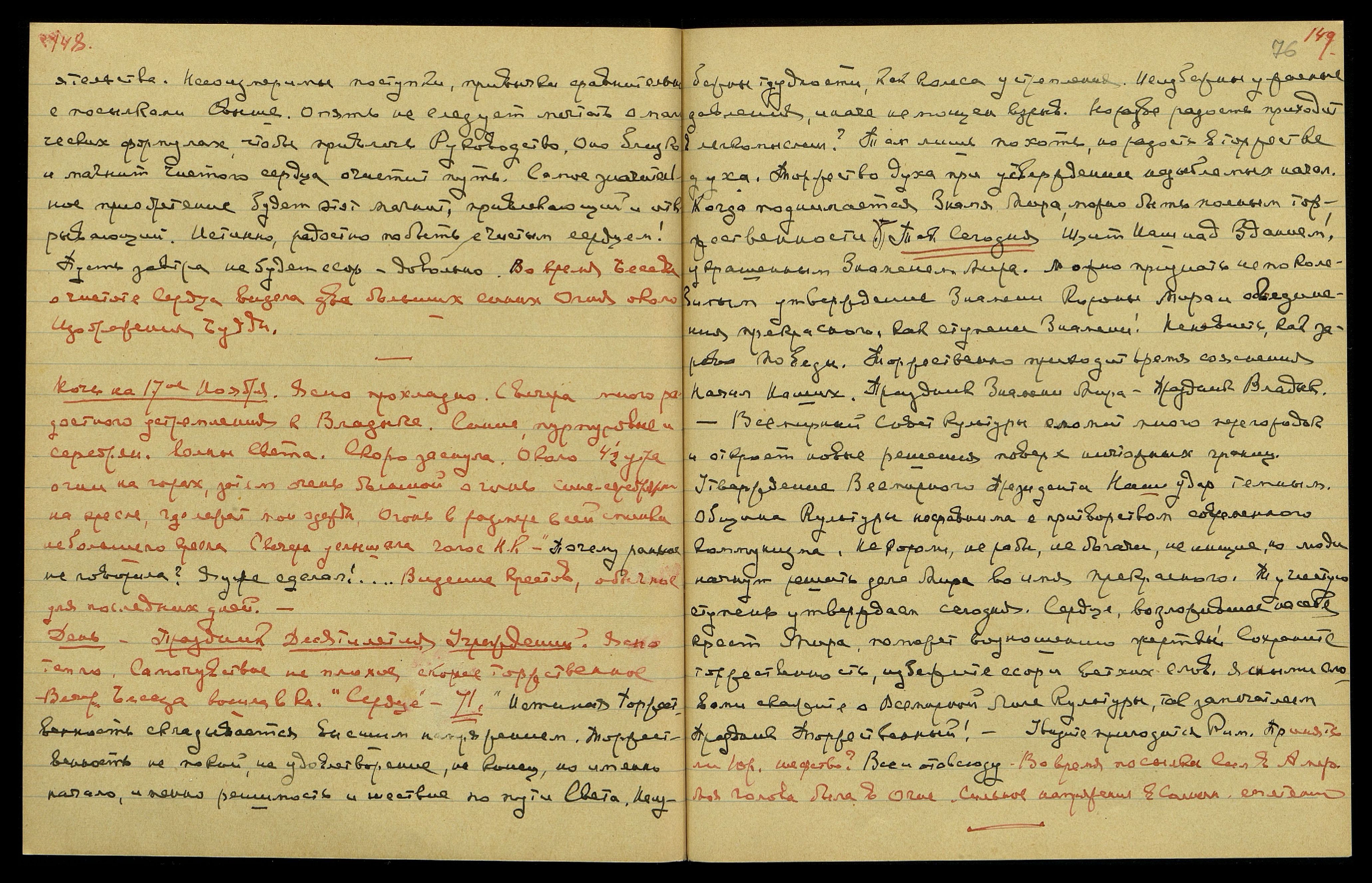 Ночь на 17-ое ноября. Ясно прохладно. С вечера много радостного устремления к Владыке. Синие, пурпуровые и серебрян[ые] волны света. Скоро заснула. Около 4 1/2 утра огни на горах, затем очень большой огонь сине-серебрян[ый] на кресле, где лежат мои одежды. Огонь в размере всей спинки небольшого кресла. С вечера услышала голос Н[иколая] К[онстантиновича]: