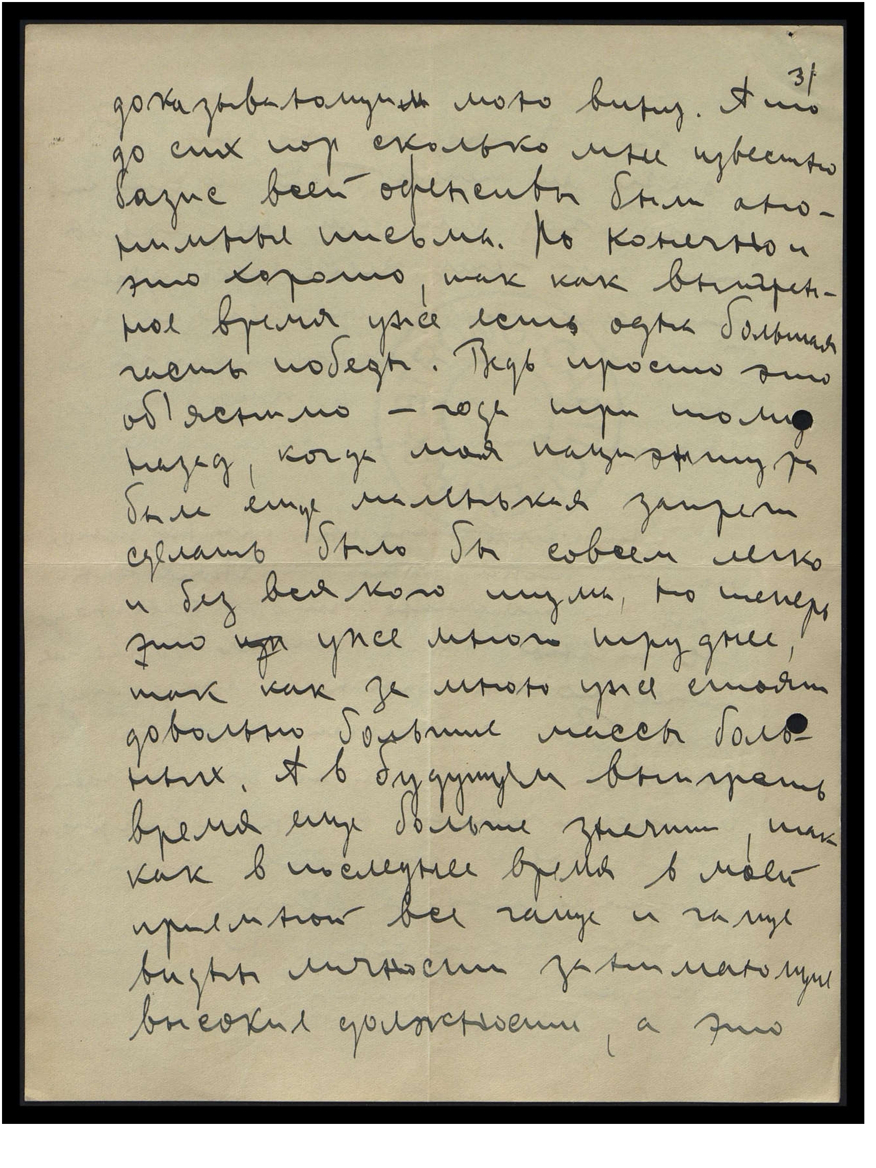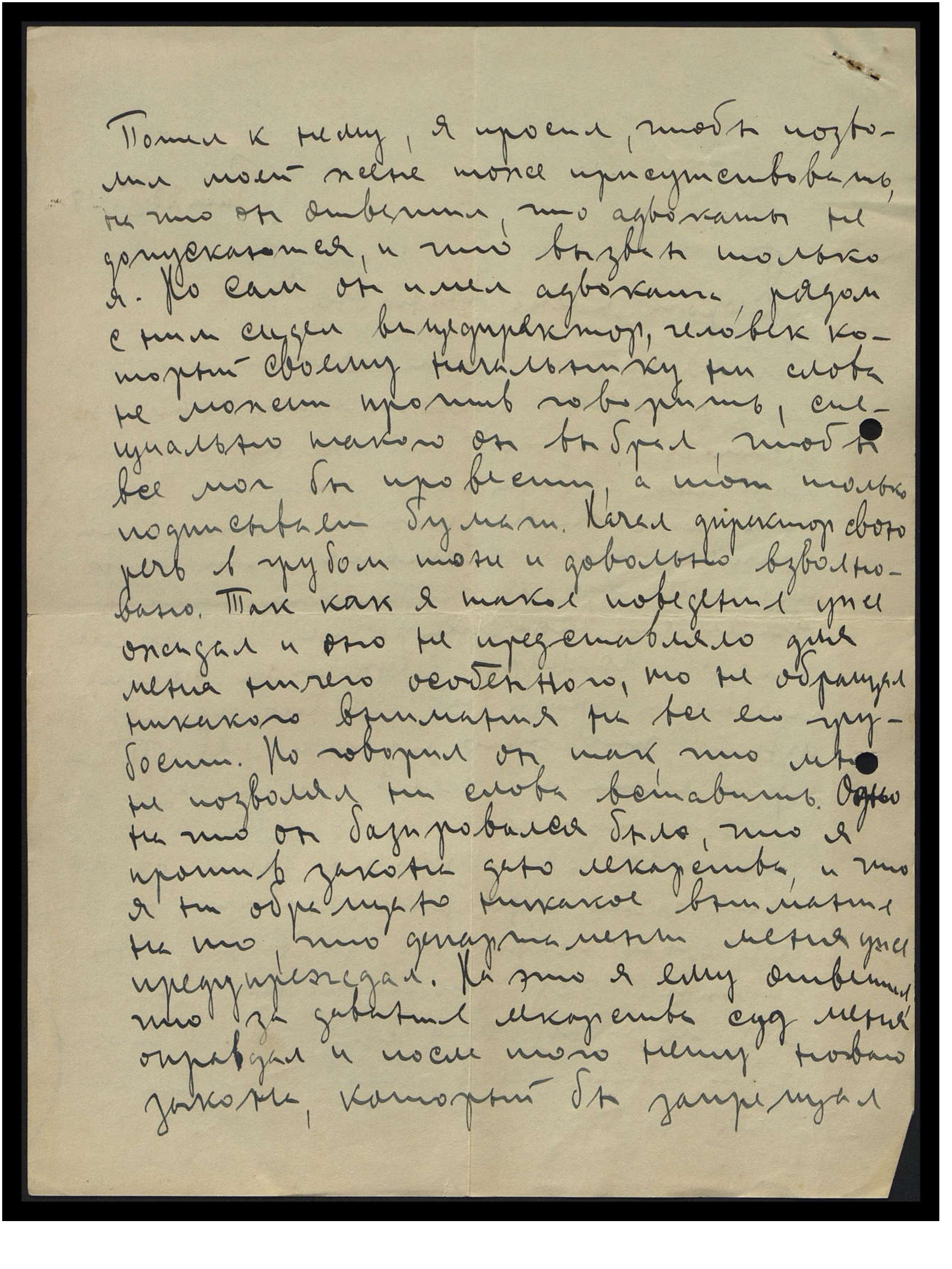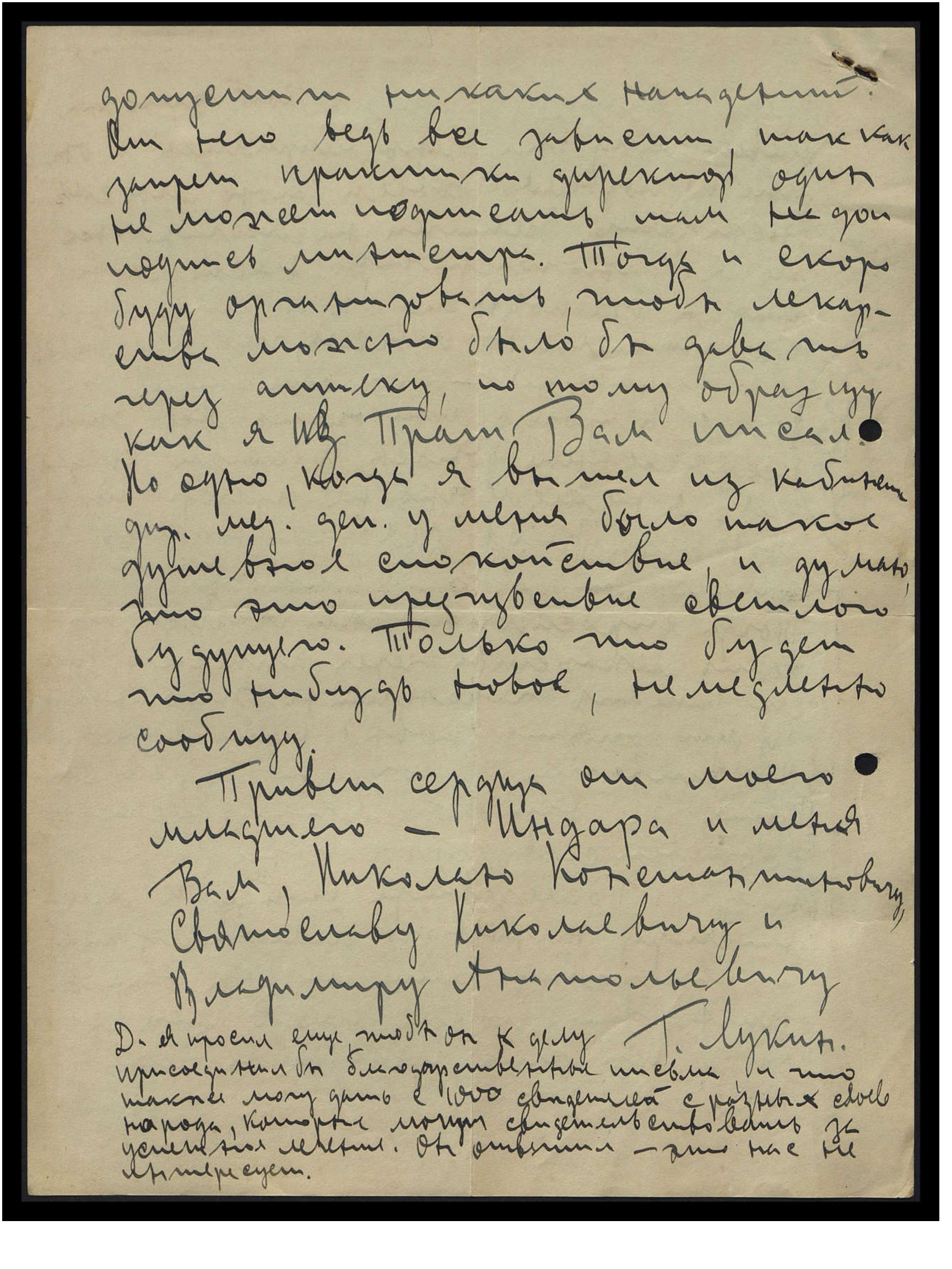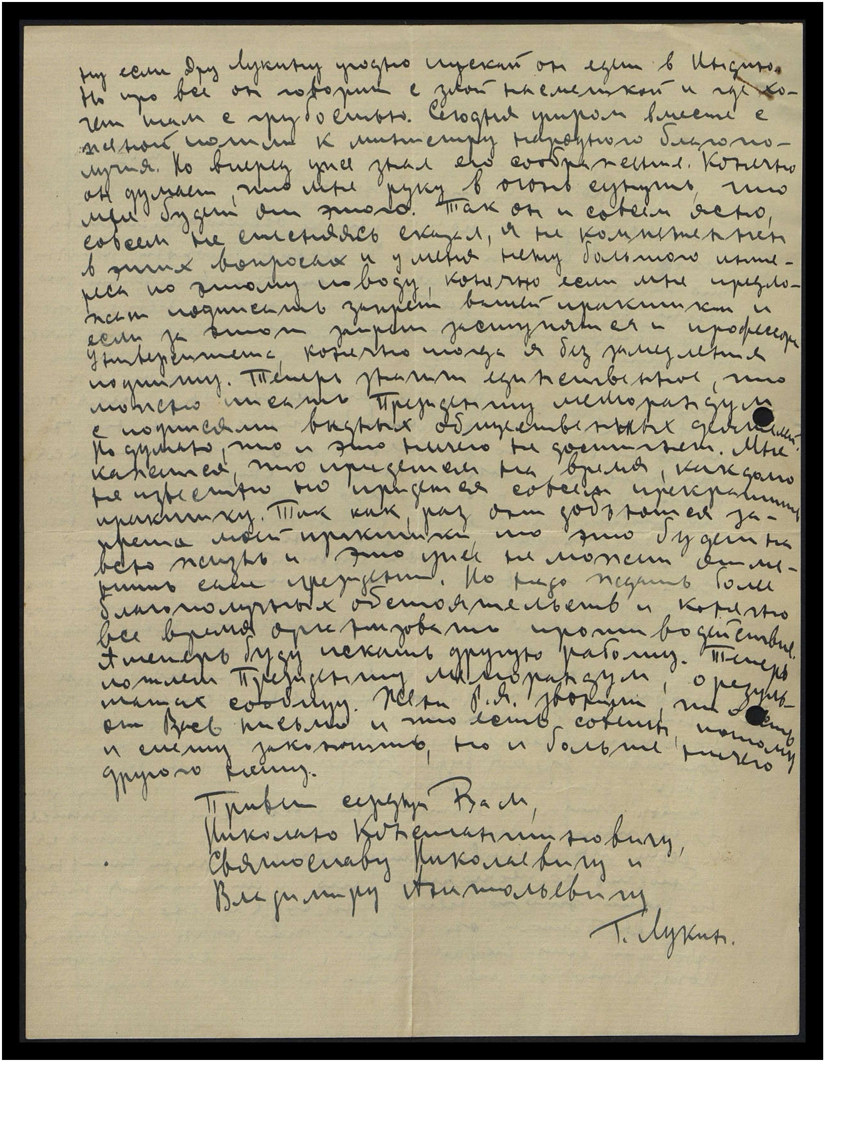 ну, если Д-ру Лукину угодно, пускай он едет в Индию. Но про всё он говорил со злой насмешкой и где хочет, там с грубостью. Сегодня утром вместе с женой пошли к министру народного благополучия. Но вперёд уже знал его соображения. Конечно, он думает, — "Что мне руку в огонь сунуть, что мне будет от этого?" Так он совсем ясно, совсем не стесняясь, сказал: "Я не компетентен в этих вопросах, и у меня нету большого интереса по этому поводу, конечно, если мне предложат подписать запрет вашей практики, и, если за этот запрет заступятся и профессора Университета, конечно, тогда я без замедления подпишу". Теперь, значит, единственное, что можно - писать Президенту меморандум с подписями видных общественных деятелей. Но думаю, что и это ничего не достигнет. Мне кажется, что придётся на время, как долго — неизвестно, но придётся совсем прекратить практику. Так как, раз они добьются запрета моей практики, то это будет на всю жизнь, и это уже не может отменить сам президент. Но надо ждать более благополучных обстоятельств и, конечно, всё время организовать противодействие. А теперь буду искать другую работу. Теперь пошлём Президенту меморандум, о результатах сообщу. Жена Р[ихарда] Я[ковлевича] говорит, что есть от Вас письмо, и что есть советы, потому и спешу закончить, но и больше ничего другого нету.