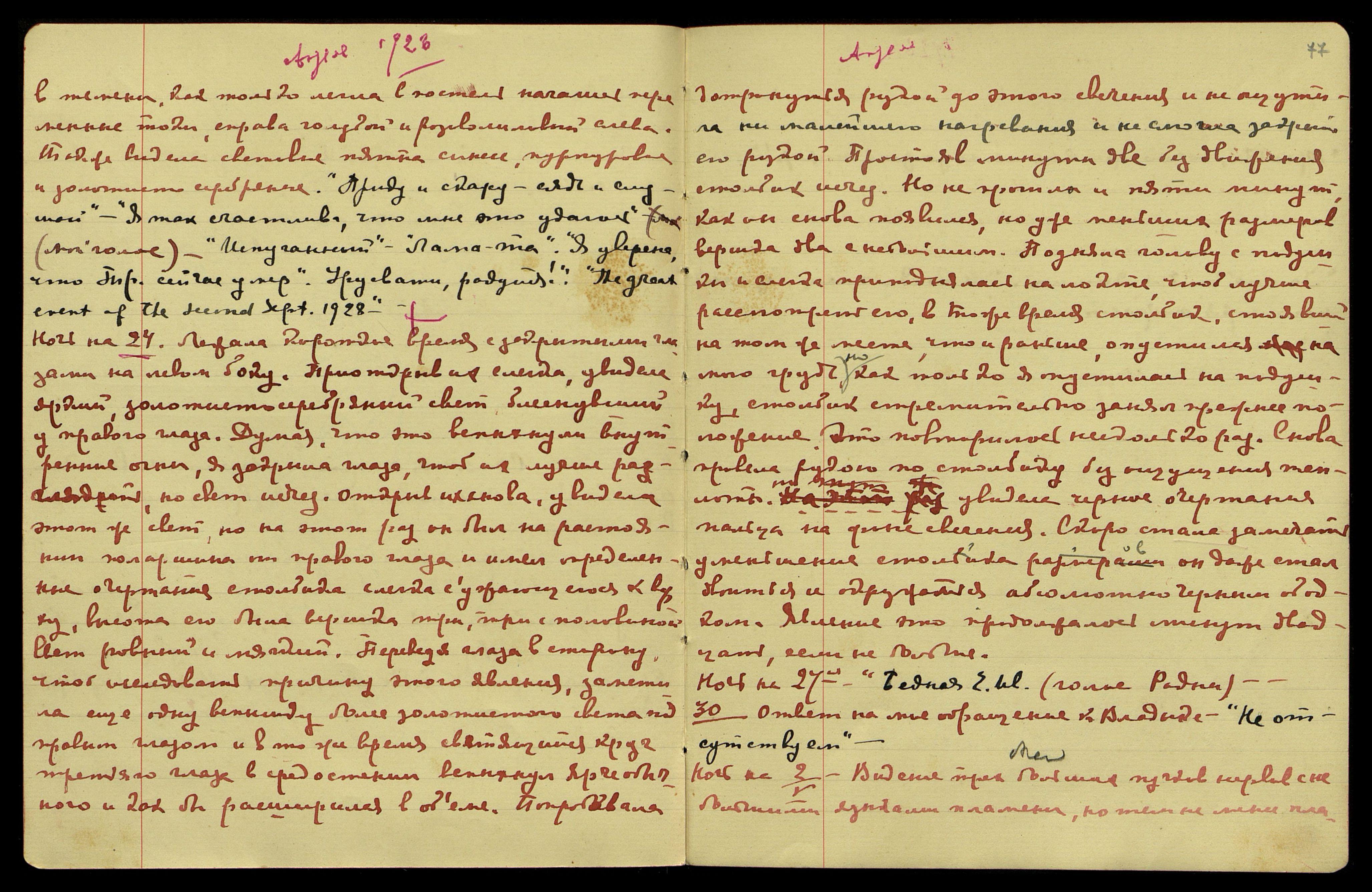 Ночь на 20-ое [06.1928]. Видение розово-лилового огня дважды.