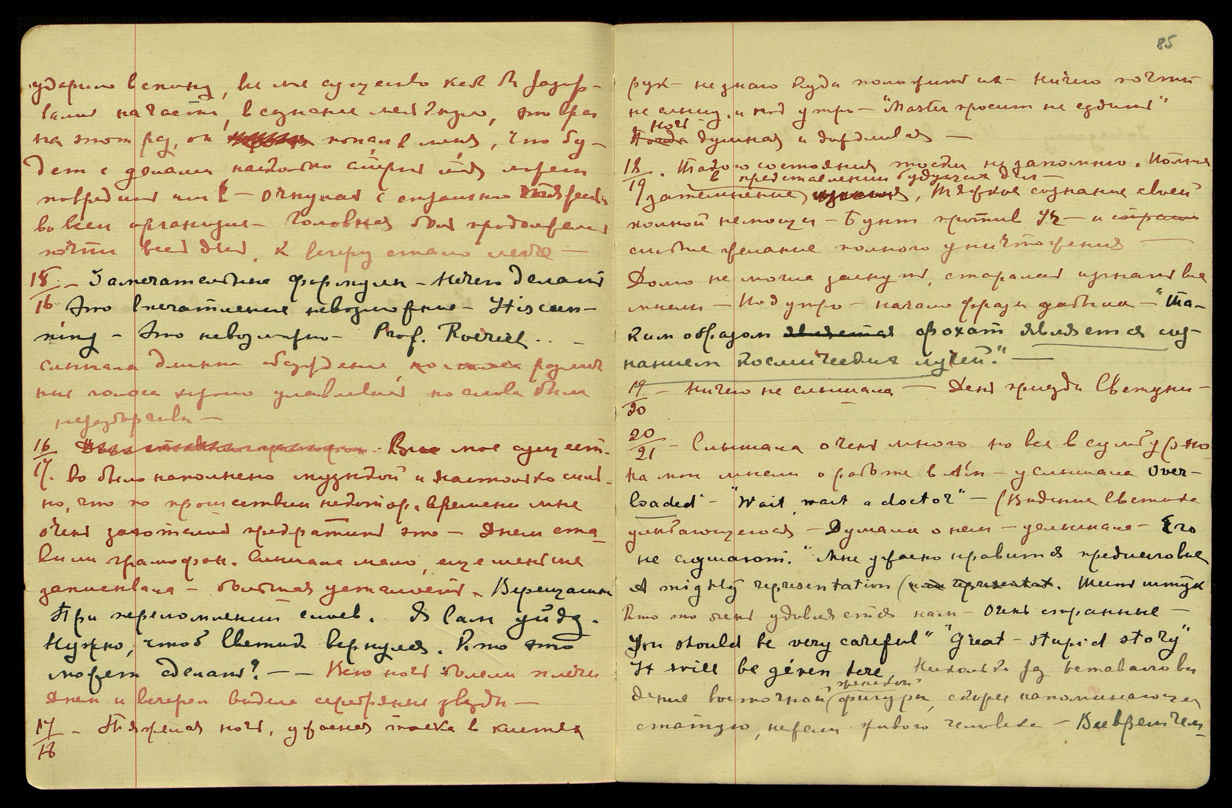 12.[07.1928]. "Guvarow! − I [англ.: Я] − ... stein [нем.: камень] Моего брата. И когда он вступил? Что у них с собакой? Да, бедные вы. Он хотел ехать в Калифорнию. Давайте, давайте! Я толкаю вас, вытащу. Я!!! Ужасно убивает! Сравнительно с 21-м... dazzling colours [англ.: ослепительные цвета]! Половинчатая. Опять! Скажите, пожалуйста! Делёжку устроить. Пристают! Путем безумия".
