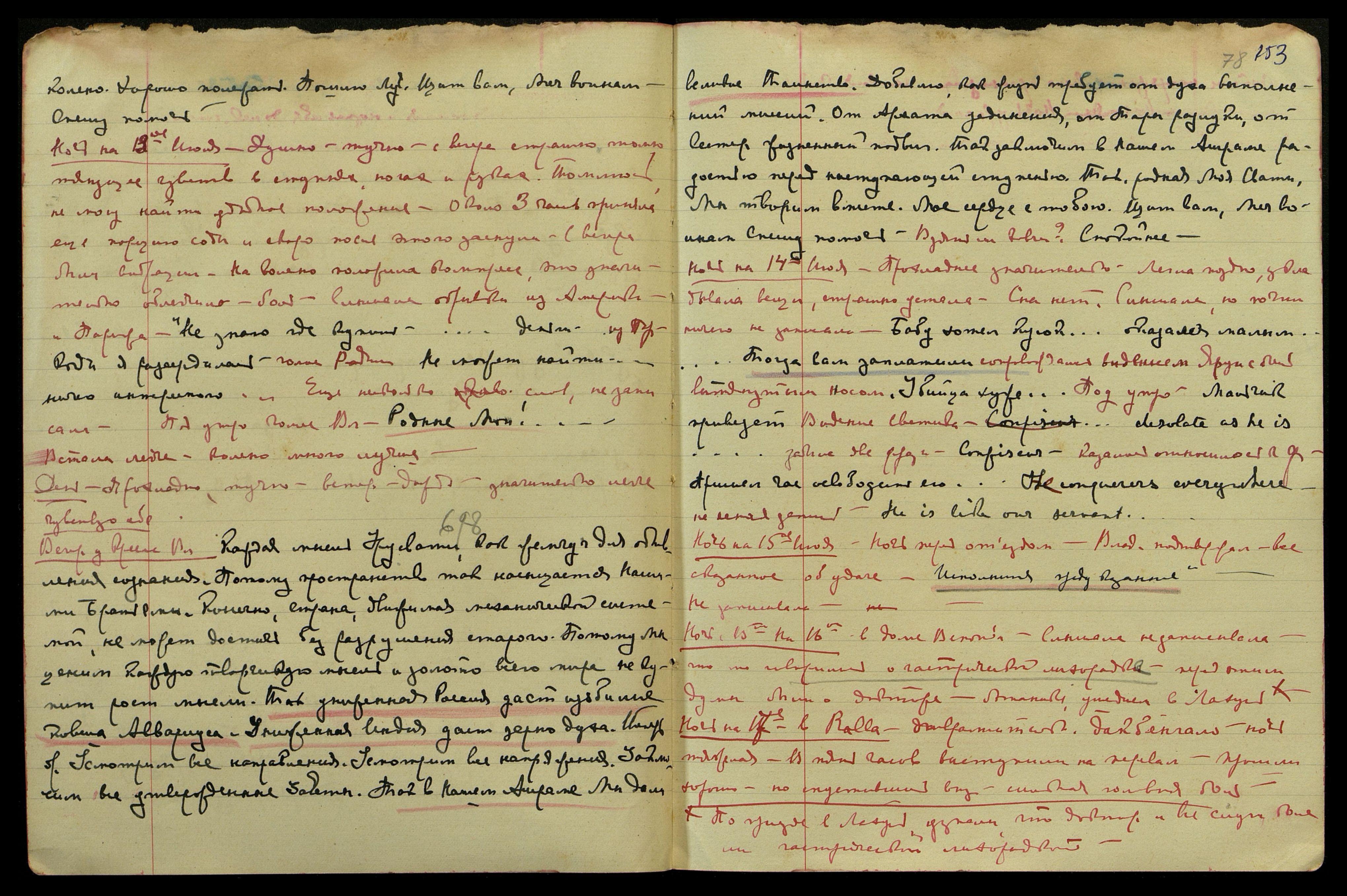 Ночь на 14-е июля. Прохладнее значительно. Легла поздно, укладывала вещи, страшно устала. Сна нет. Слышала, но почти ничего не записала. "Бабу хотел кусок... оказался малым... Тогда вам заплатили". Сопровождалось видением Яруи с очень вытянутым носом. "Убийца хуже..." Под утро. "Мальчик привезёт". Видение Светика. "Desolate as he is... [англ.: Как бы он ни был одинок...]" Забыла две фразы. "Confiseur [фр.: Кондитер]". Казалось относилось к Ф[уяме]. "Пришёл час освободить его... The conquerors everywhere... [англ.: Завоеватели повсюду...]" Не ясная запись. "He is like our servant... [англ.: Он подобен нашему слуге...]"