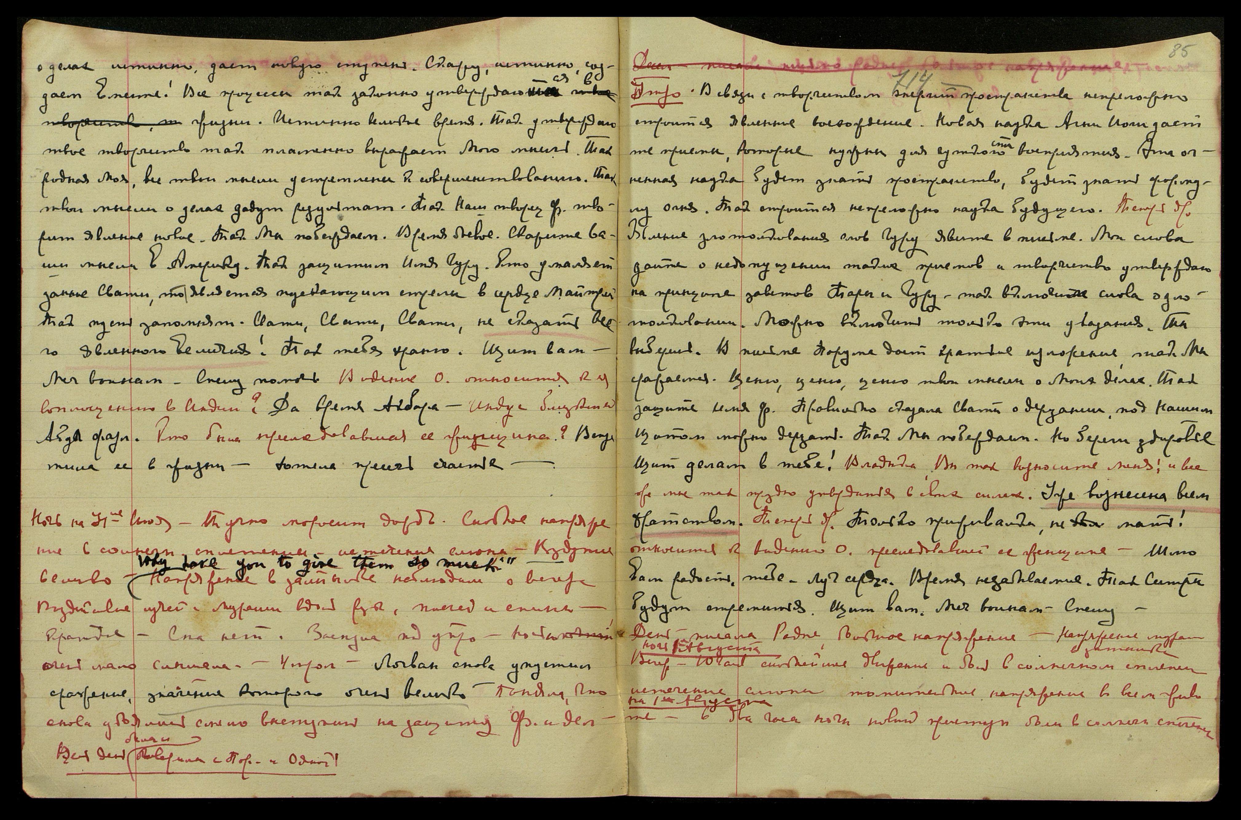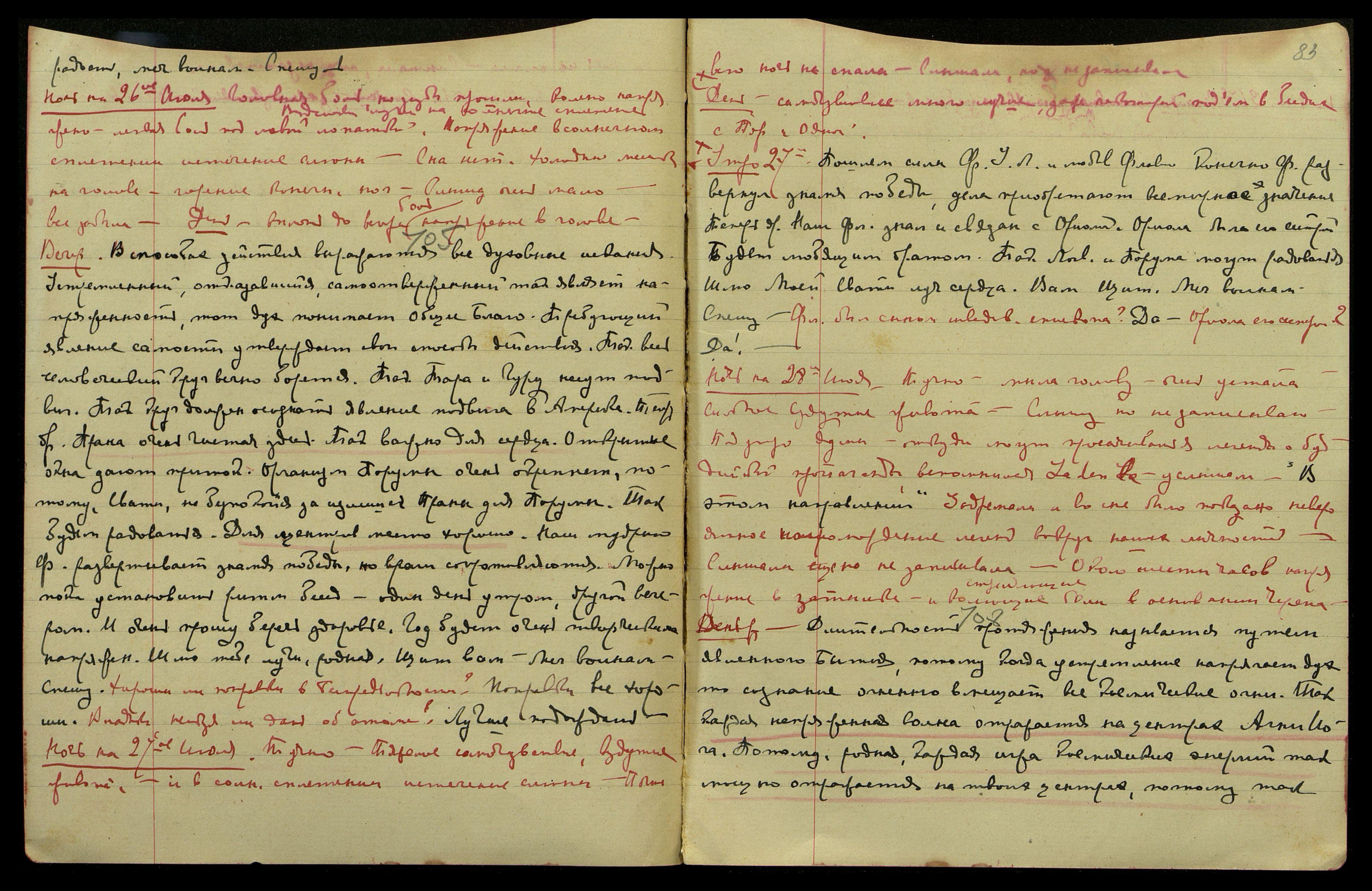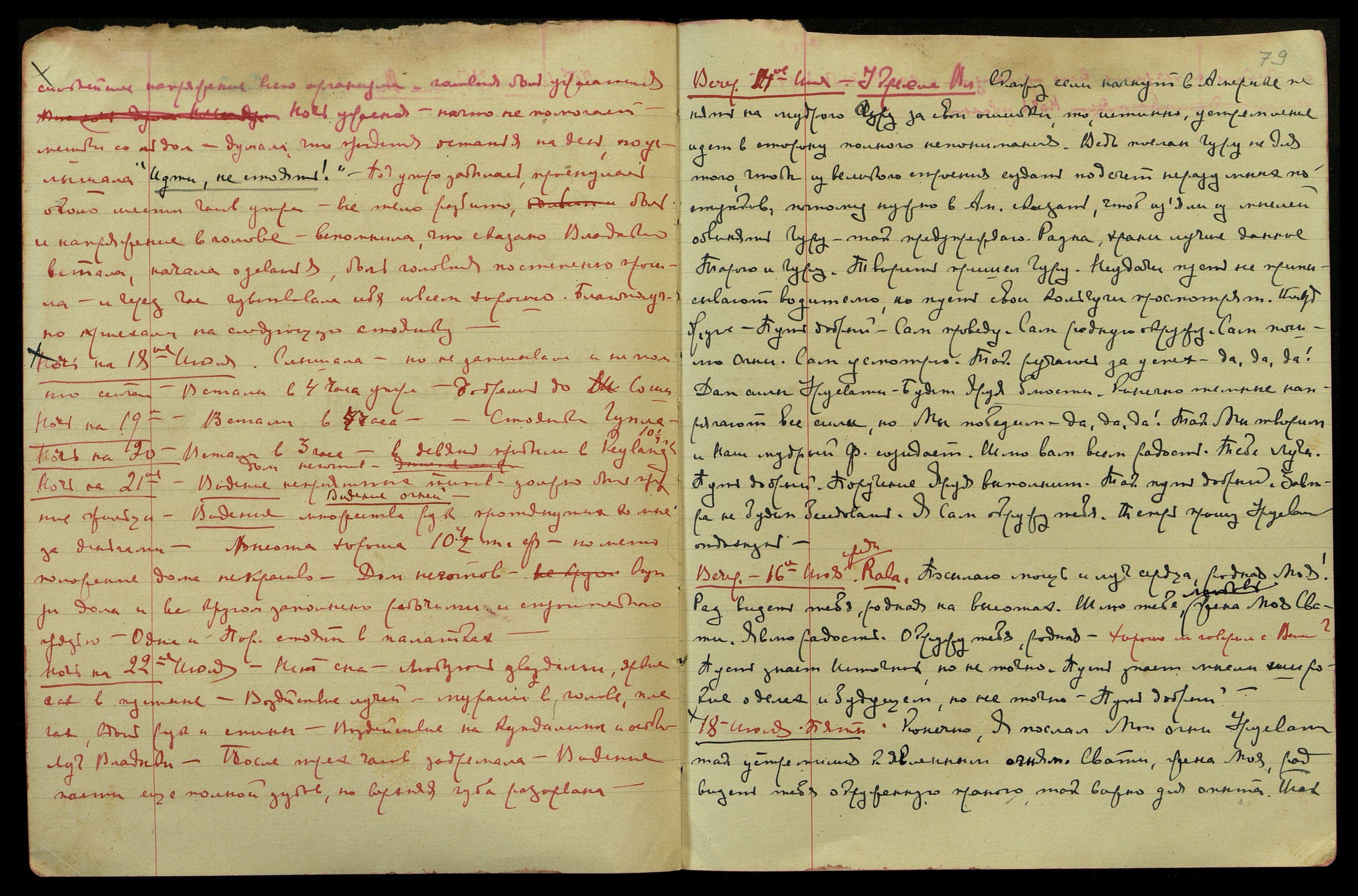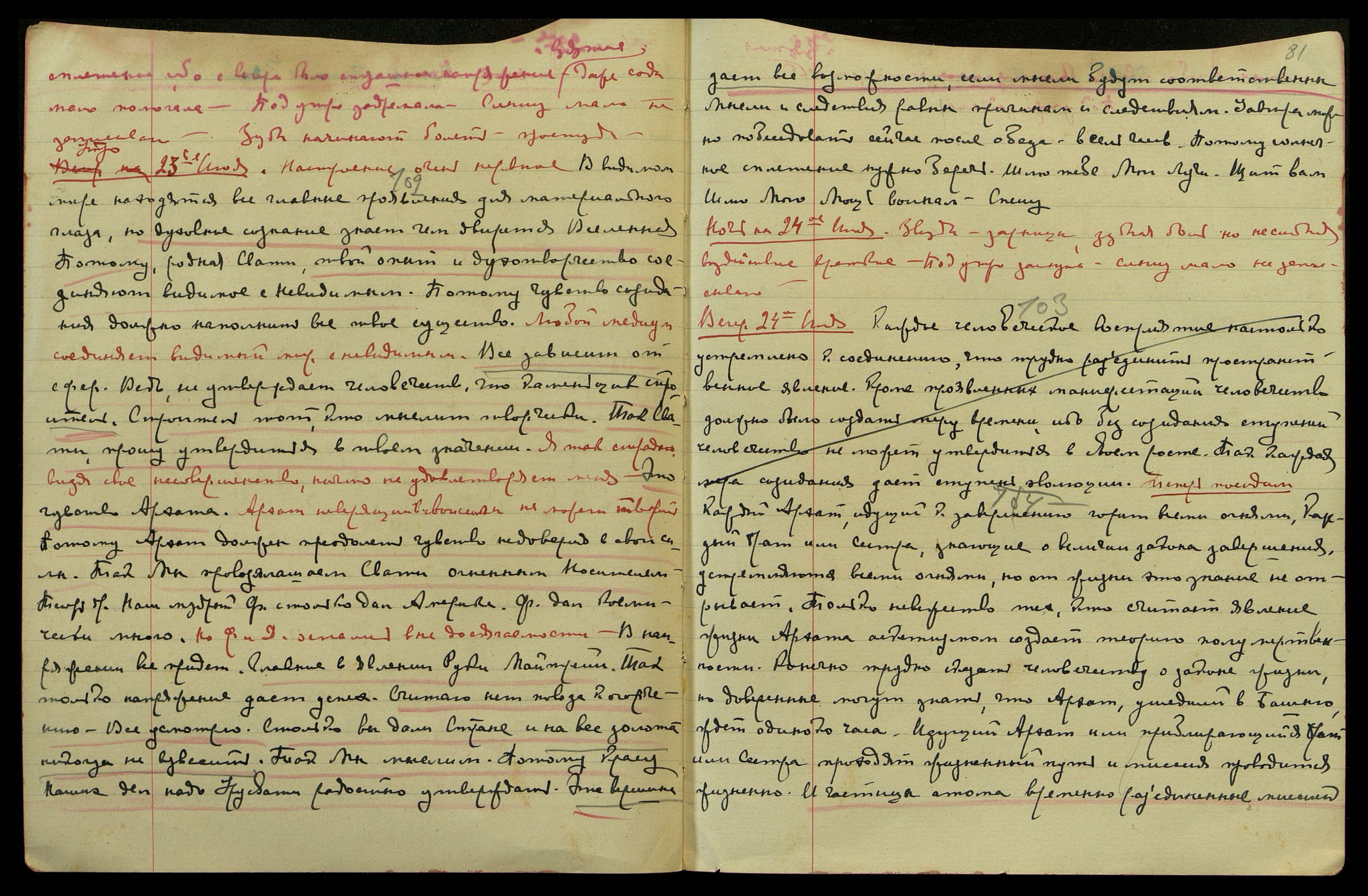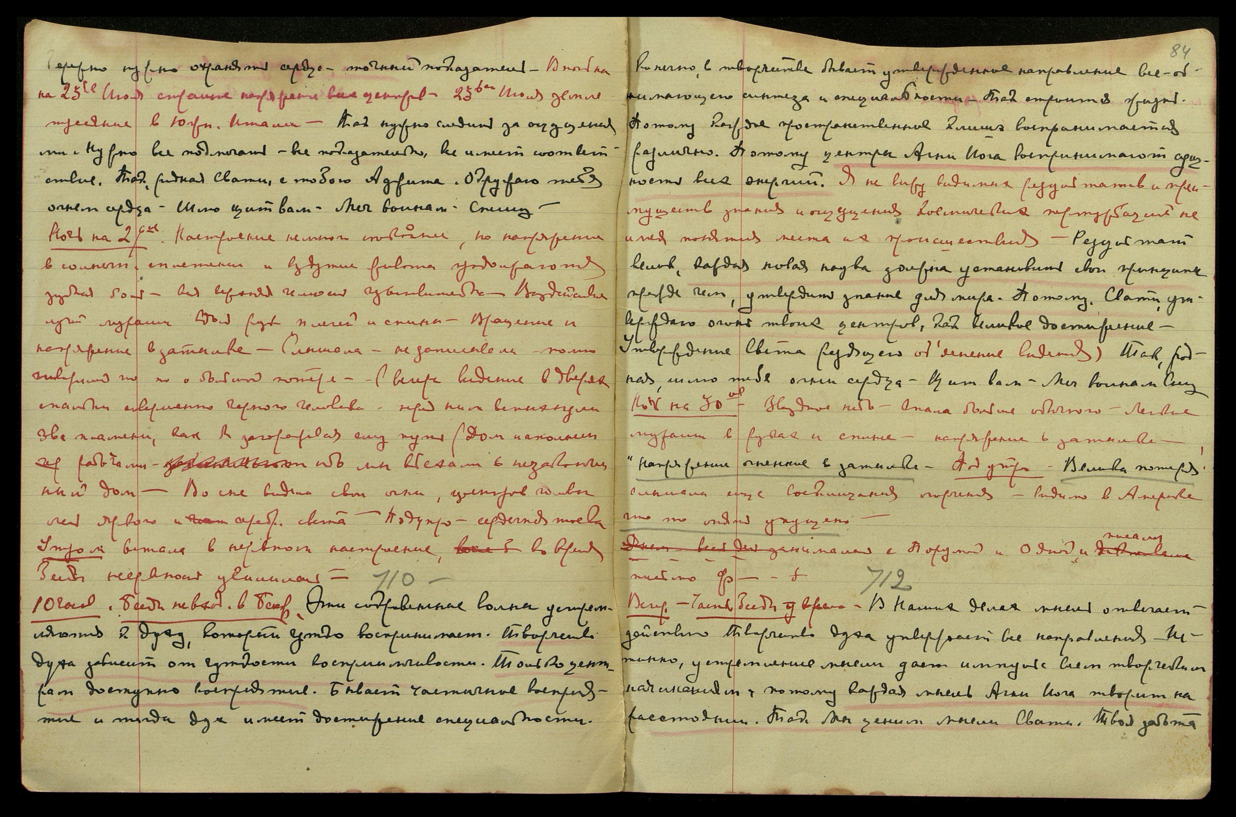Вечер. 10 часов. Сильнейшее движение и боль в солнечном сплетении, истечение слюны, томительное напряжение во всём животе. В два часа ночи новый приступ боли в солнечн[ом] сплетении,