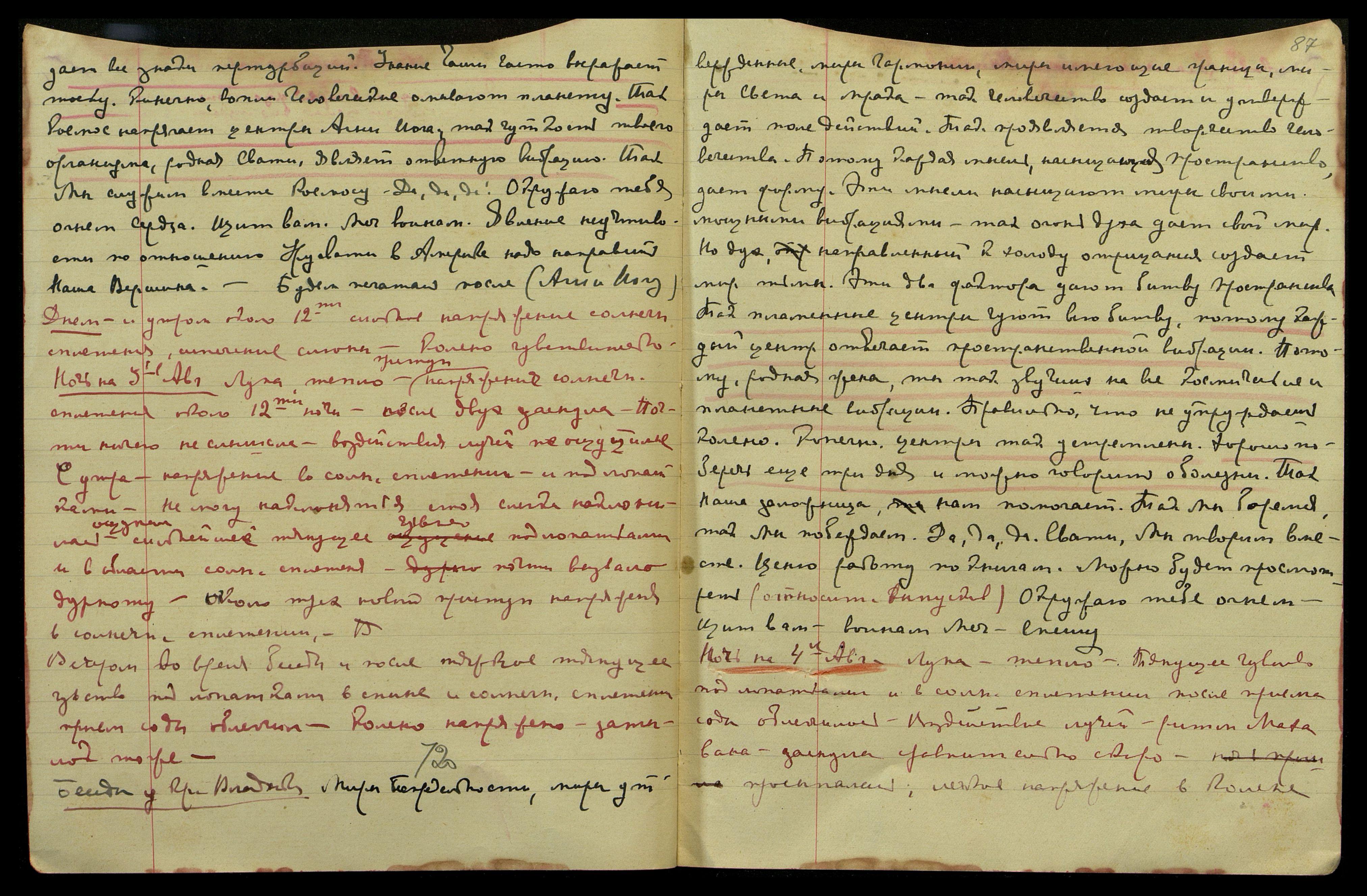 Ночь на 4-ое авг[уста]. Луна, тепло. Тянущее чувство под лопатками и в солн[ечном] сплетении после приёма соды облегчилось. Воздействие лучей - ритм Махавана, заснула сравнительно скоро, просыпалась, лёгкое напряжение в колене.