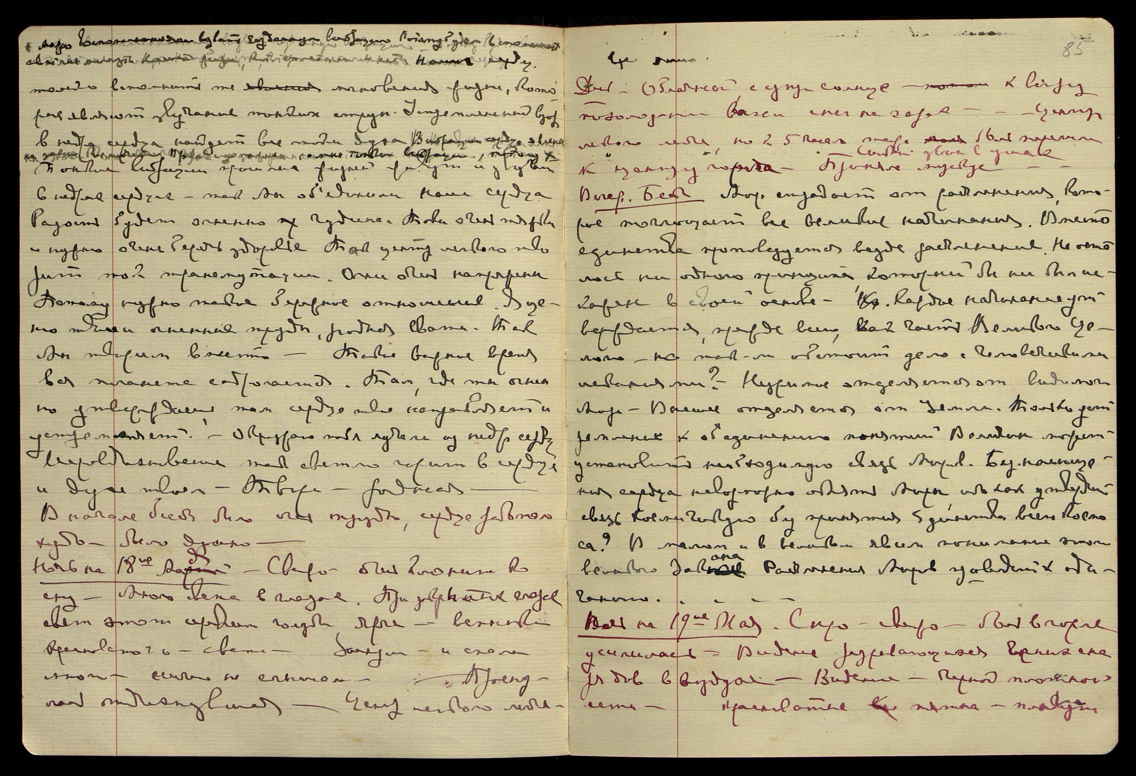 Ночь на 19-е мая. Сыро, свежо, боль в горле усилилась. Видение разрывающихся чёрных снарядов в воздухе. Видение чёрной плотной сети, красноватые пятна плывут.