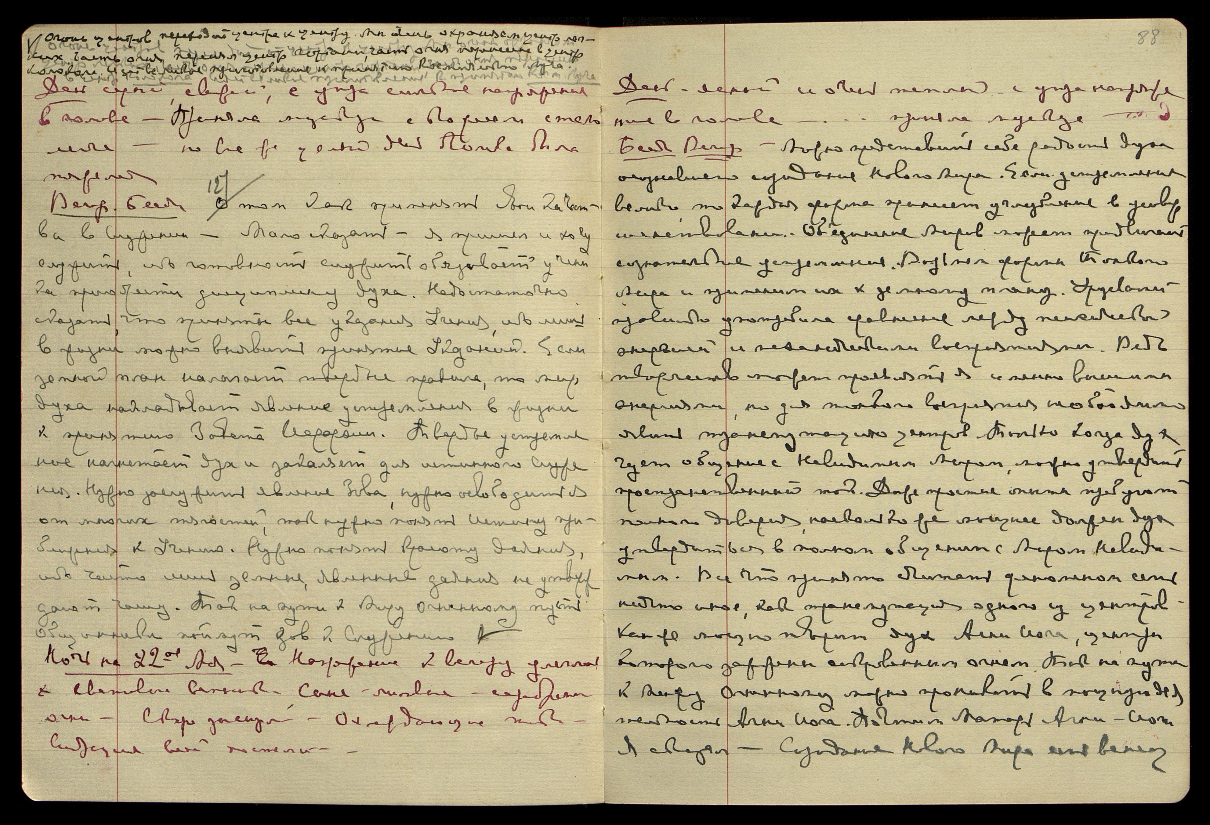 Ночь на 21-е мая. Легла поздно. Свет, вспышки серебр[яного] света. "Деваки, Деваки!" Неясные образы каких-то фигур − женск[ой] и мужск[ой]. Один очень напоминал Светика и несколько раз появлялся... Слышала голоса из Америки. Кто-то настаивал на немедленном извещении меня... Охлаждающие лучи. Спала вообщем не плохо... "Devaki".