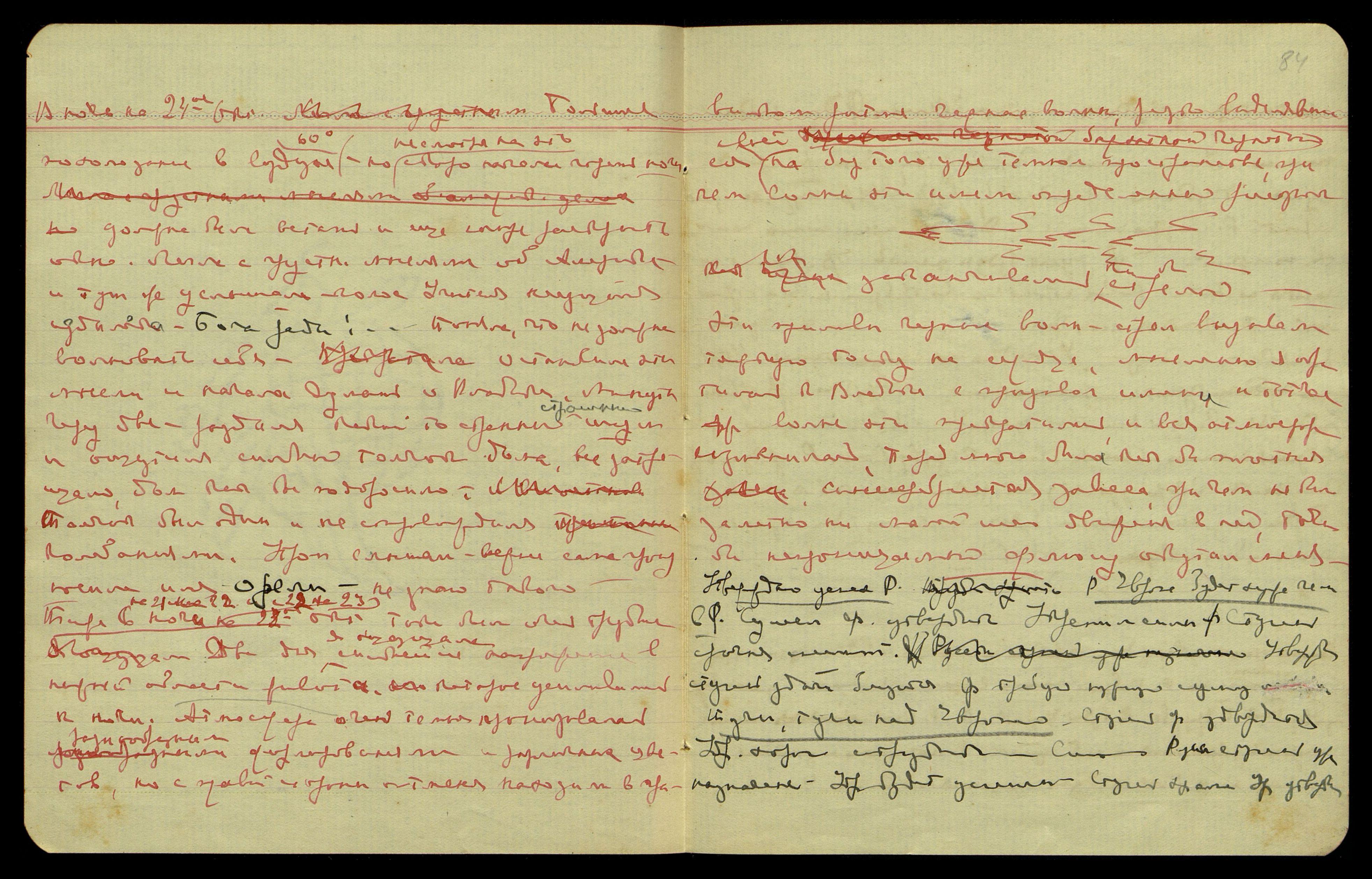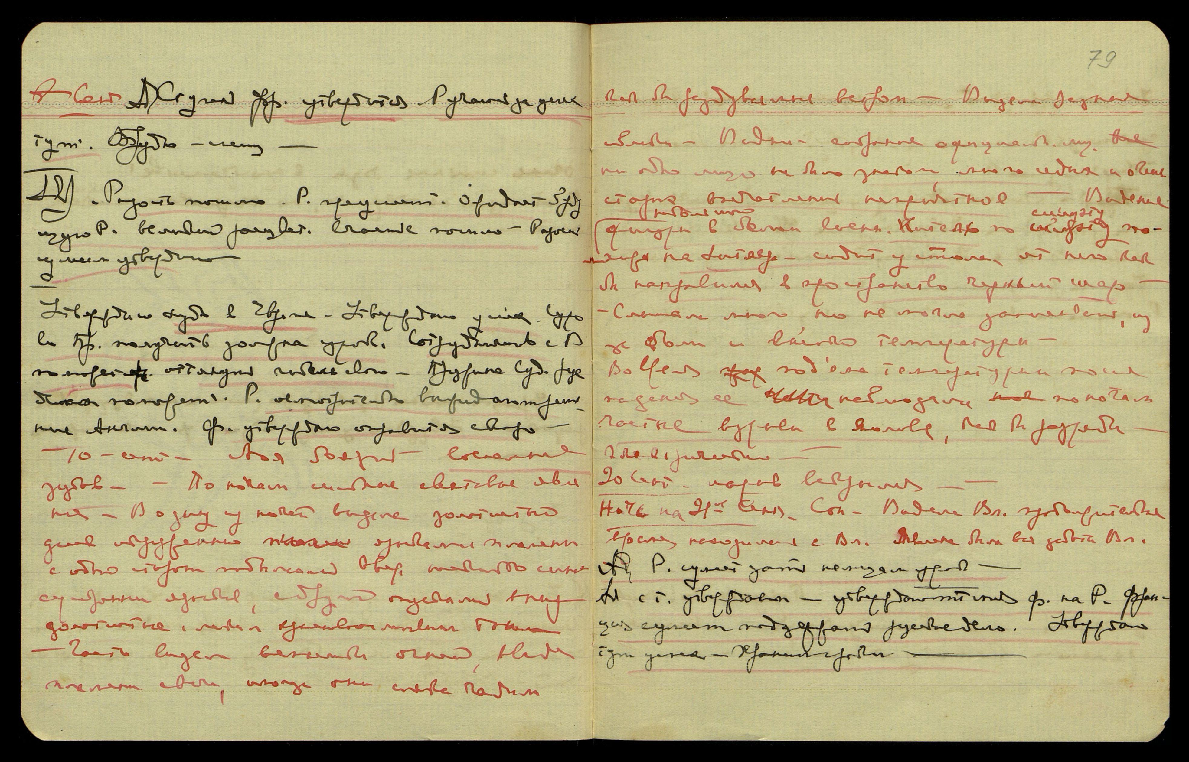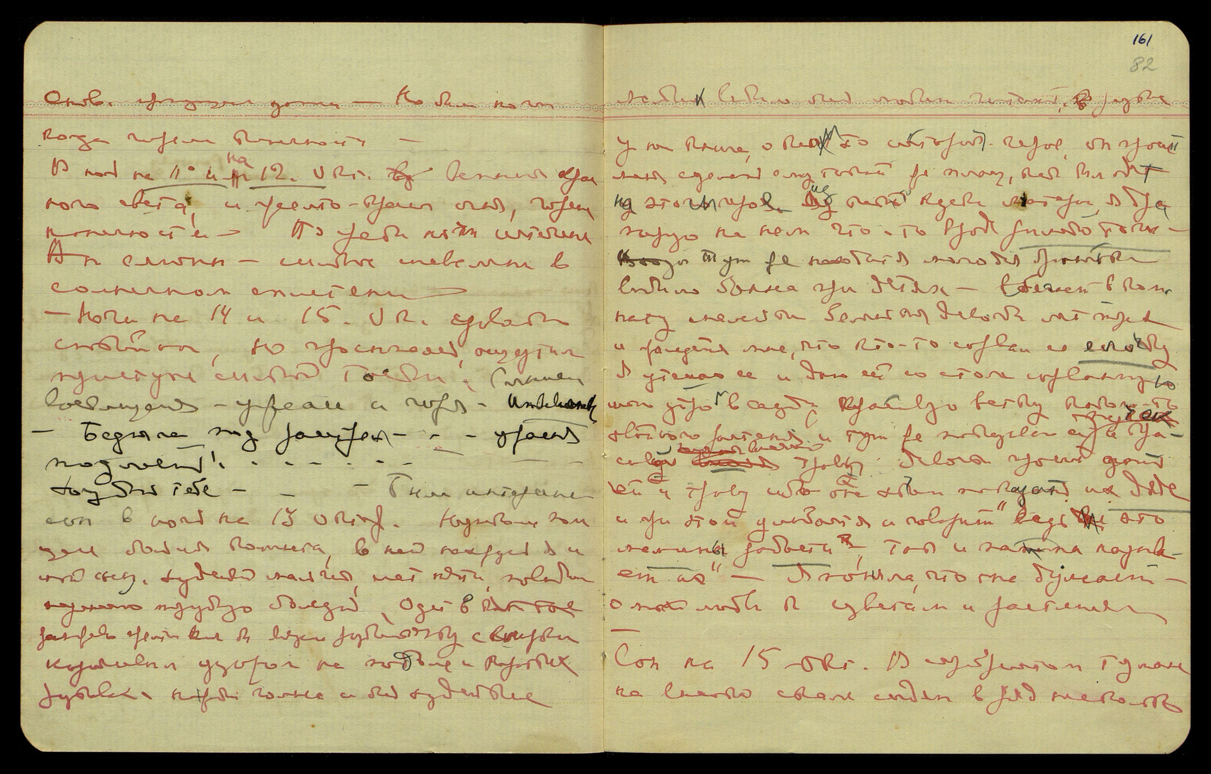 Ночь на 15-ое [ноября]. С вечера сокращение в солн[ечном] сплетении, сопровождавшееся мурашами вокруг сплетения. Посреди ночи была разбужена — снова сильные мураши вокруг сплетения, и сокращением его, обильное истечение слюны, болезненное сокращение пищевода. Истечение слёз и приступ щекотания в горле. После этого уже не могла заснуть. "Очень сильное, — может быть, землетрясение — [несколько слов неразборчиво]. — Прекрасное имя. Х. поможет Ф[уяме]. Москва может пригласить Ф[уяму] строить сту-
