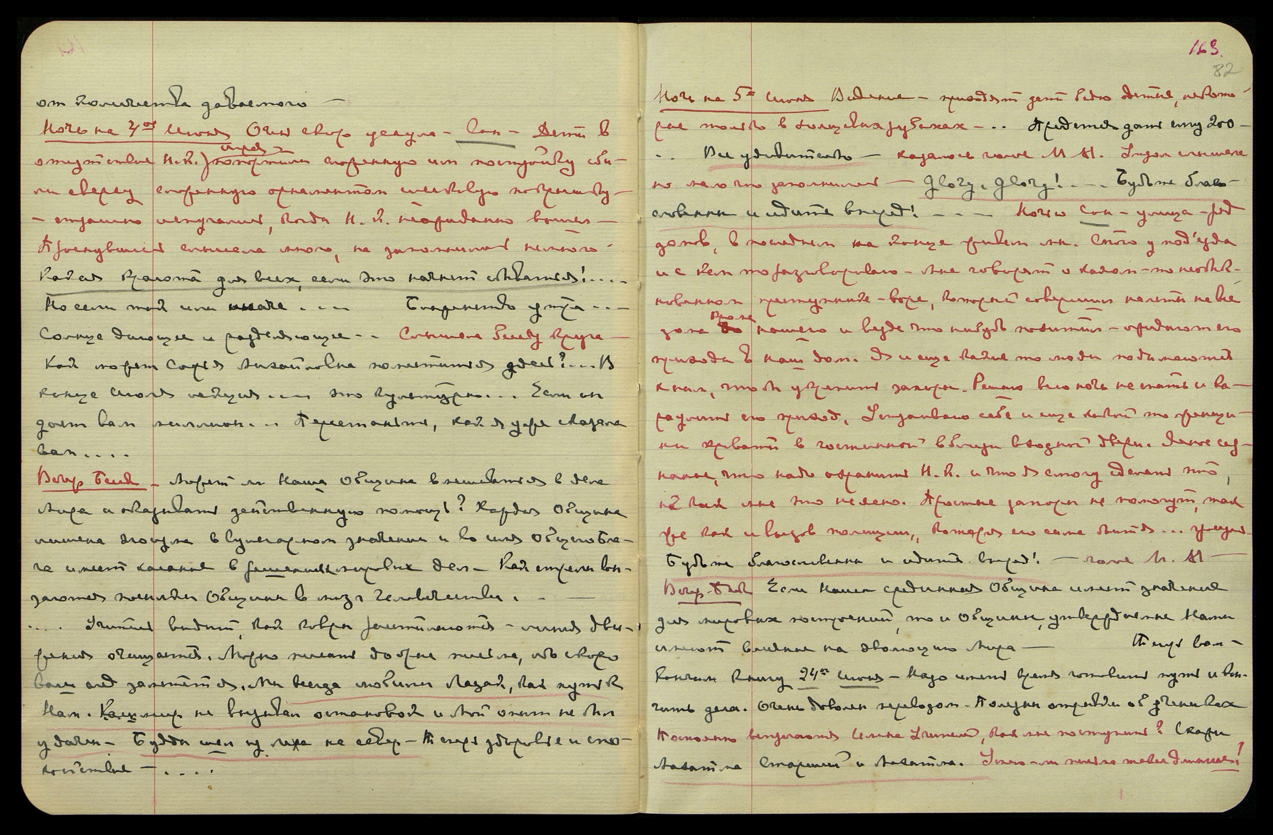 Ночь на 3-е июня. Днём опять сильная головная боль до дурноты. Под вечер немного лучше. Слышу довольно ясно и улавливала интонации, но, конечно, не всё смогла записать. "Обогащаюсь... Производит отвратительное впечатление... Вот где гнездо!! ...Как это могло быть?.. Написать ей надо!" − казалось, ответ на мою мысль о письме к Радне... "Я думаю, что если не принять Моих советов... Что за идиотство!.. Что ещё привешивается?! ...Это ни к чему".