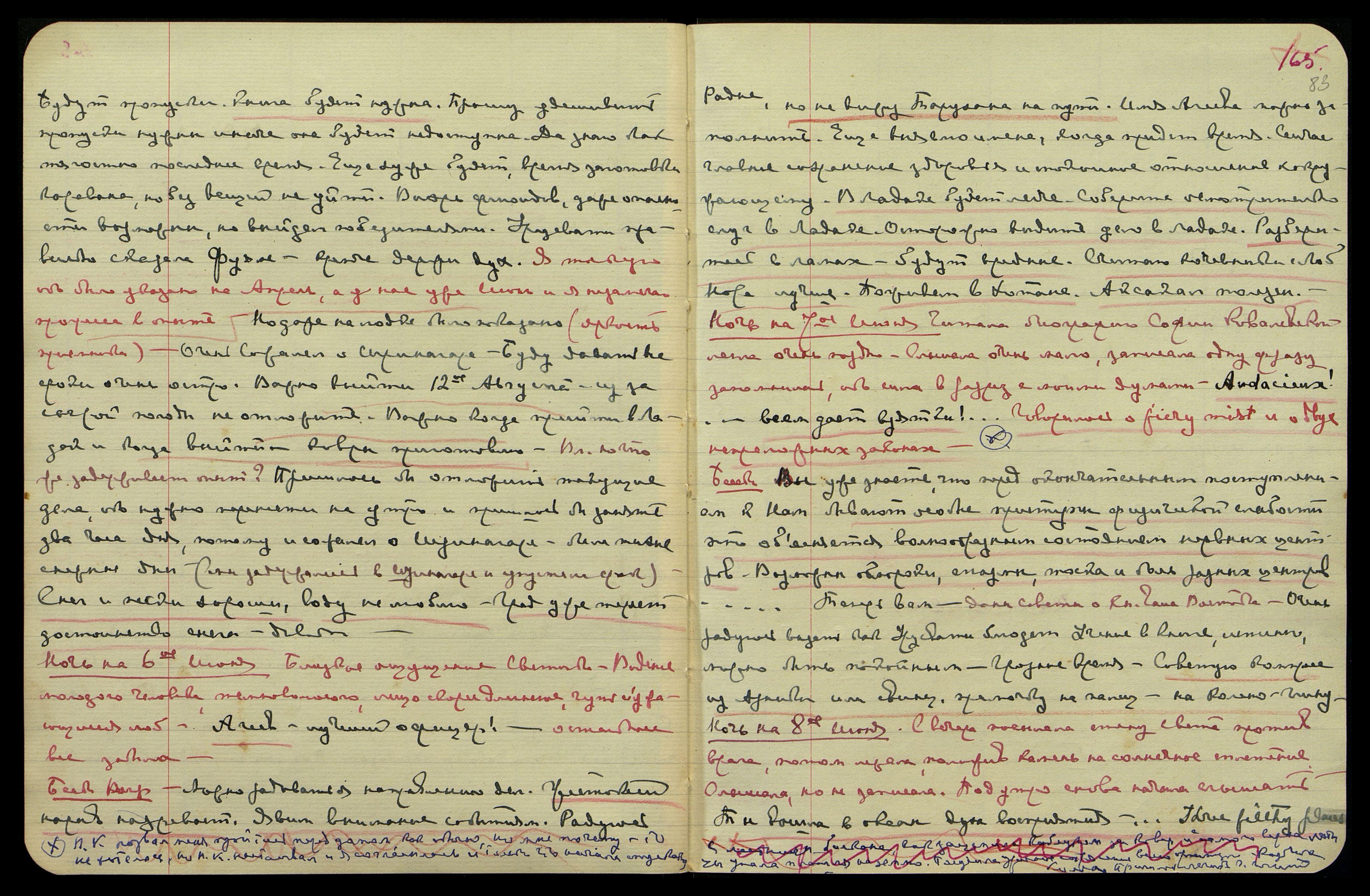 Ночь на 7-ое июня. Читала биографию Софии Ковалевской, легла очень поздно, слышала очень мало, записала одну фразу, запомнилась, ибо шла вразрез с моими думами: "Audacieux! [франц.: бесстыдный!]... всем дает взятки!.." Говорилось о fiery mist [англ.: огненном тумане] и о двух непреложных законах.
