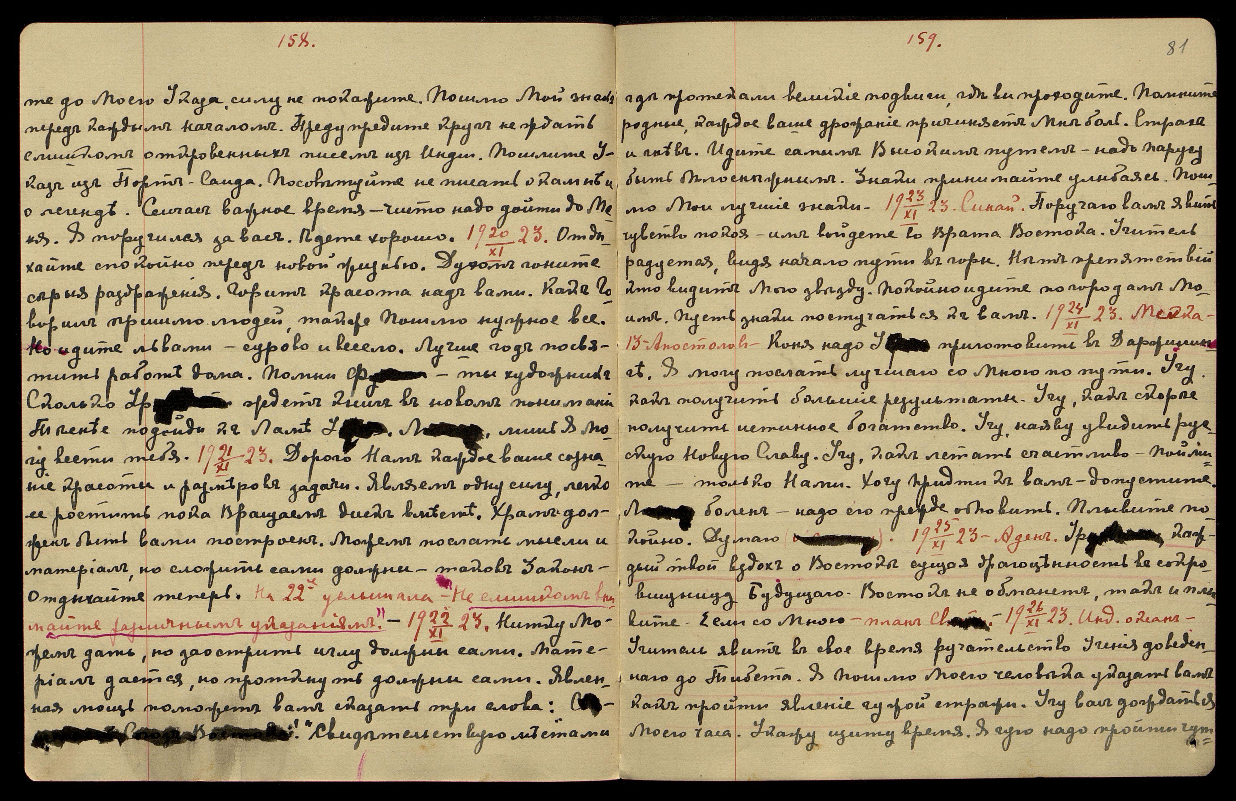 24.11.1923. Мекка. 13 Апостолов. Коня надо У[драе] приготовить в Дарджилинге. Я Могу послать лучшего со Мною по пути. Учу, как получить лучшие результаты. Учу, как скорее получить истинное богатство. Учу наяву увидеть русскую Новую Славу. Учу, как летать счастливо, поймите − только Нами. Хочу прийти к вам − допустите. Л[юмоу] болен − надо его прежде обновить. Плывите покойно. Думаю ([о Люмоу]).