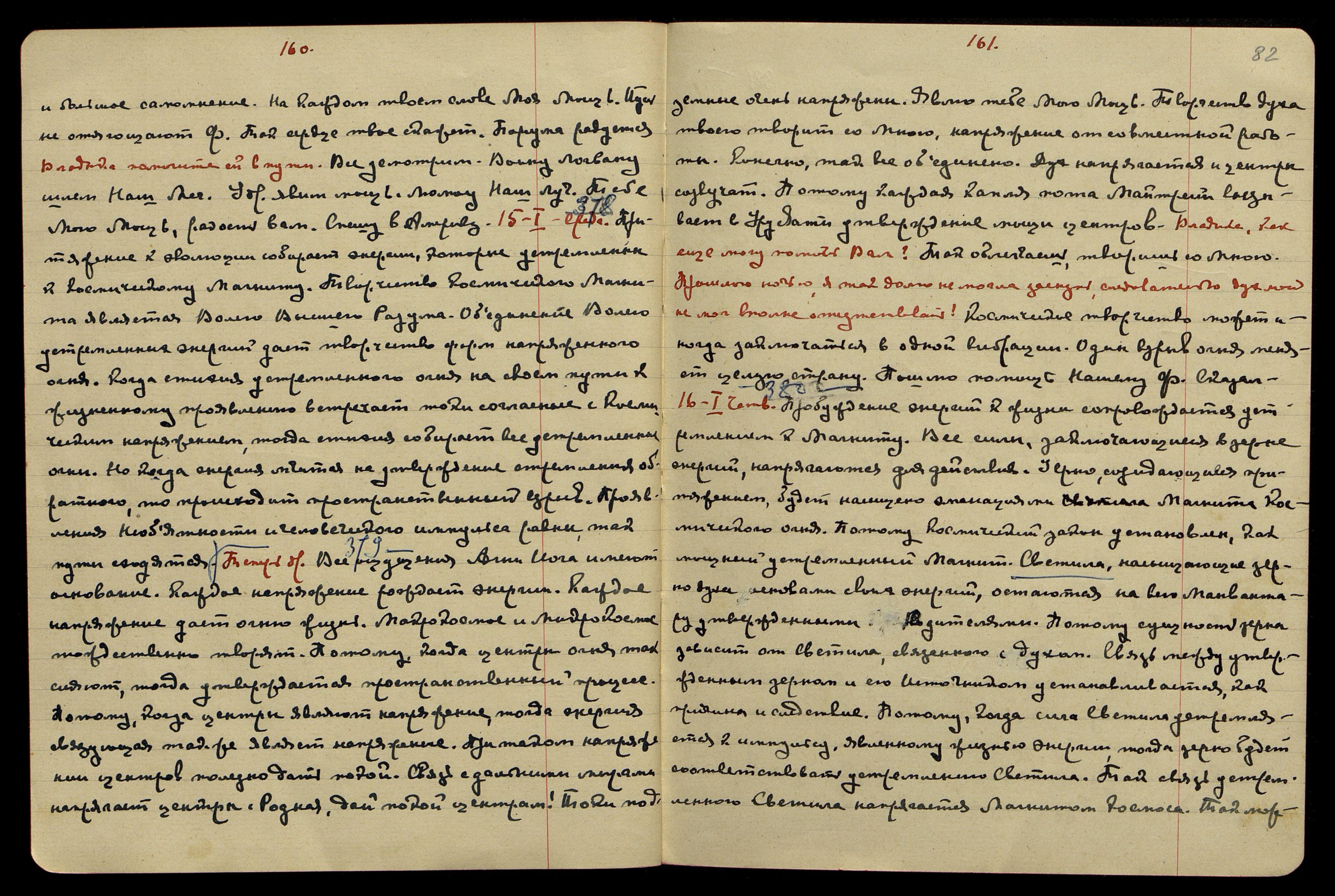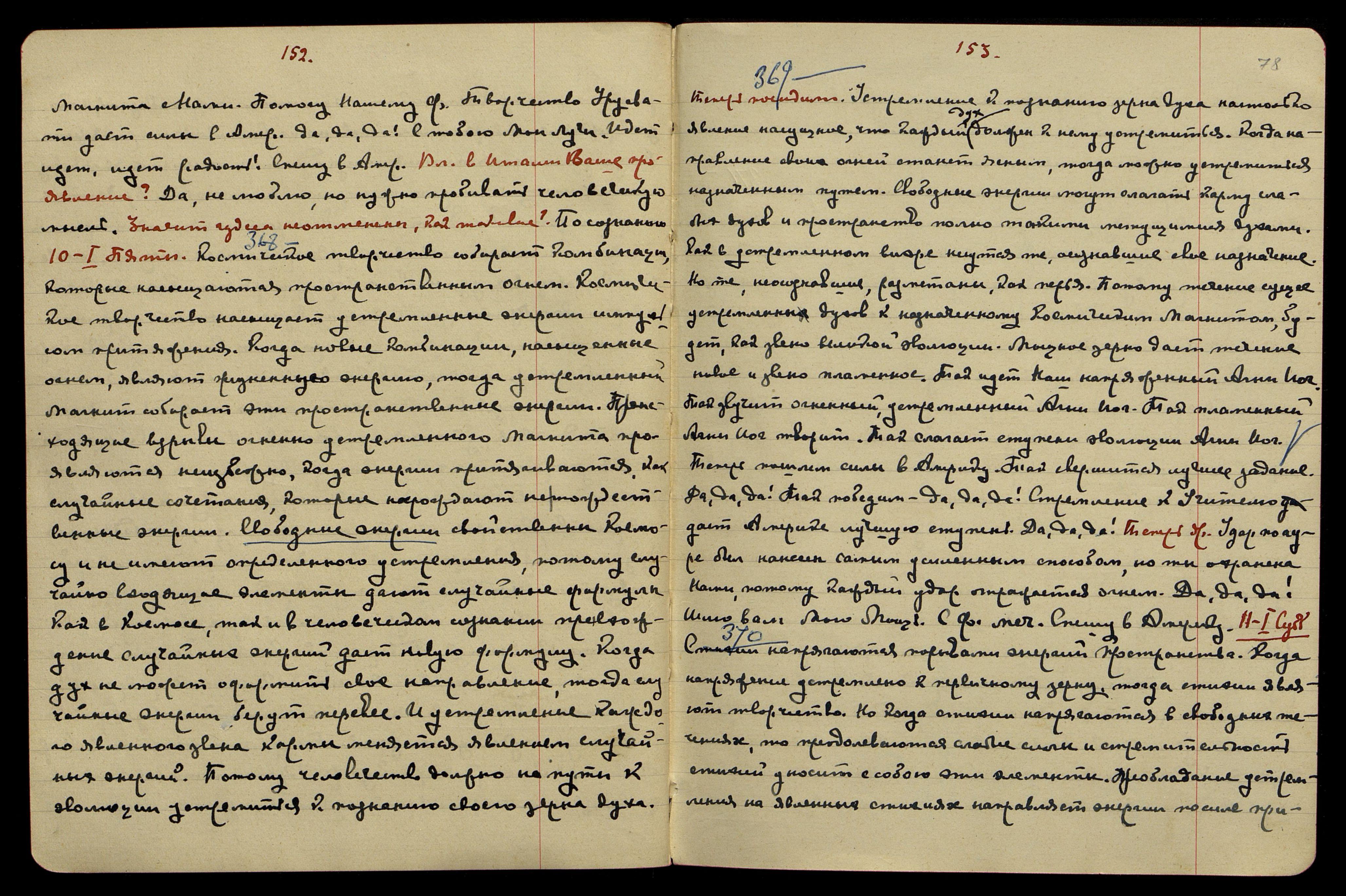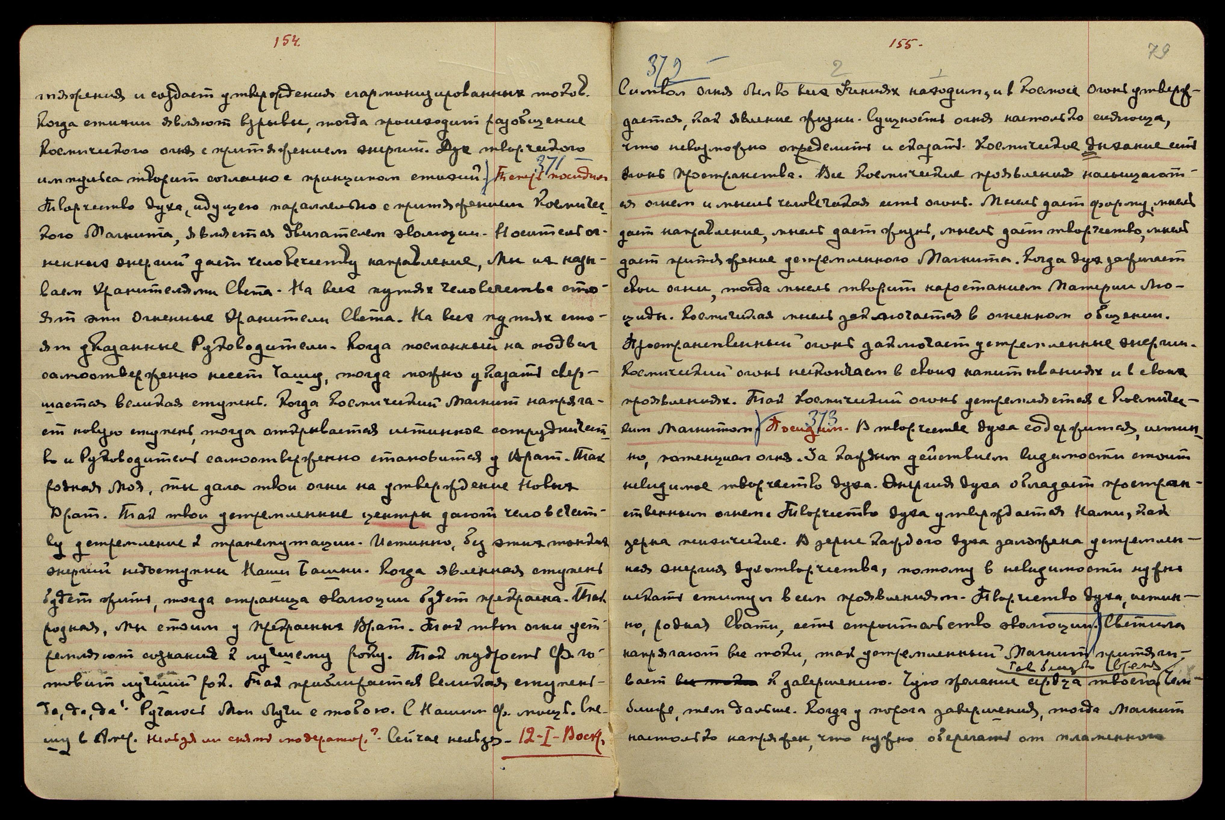 11-I. Субб[ота]. [Беспредельность] § 370. Стихии напрягаются порывами энергий пространства. Когда напряжение устремлено к первичному зерну, тогда стихии являют творчество. Но когда стихии напрягаются в свободных течениях, то преодолеваются слабые силы и стремительность стихий уносит с собою эти элементы. Преобладание устремления на явленных стихиях направляет энергии по силе при-