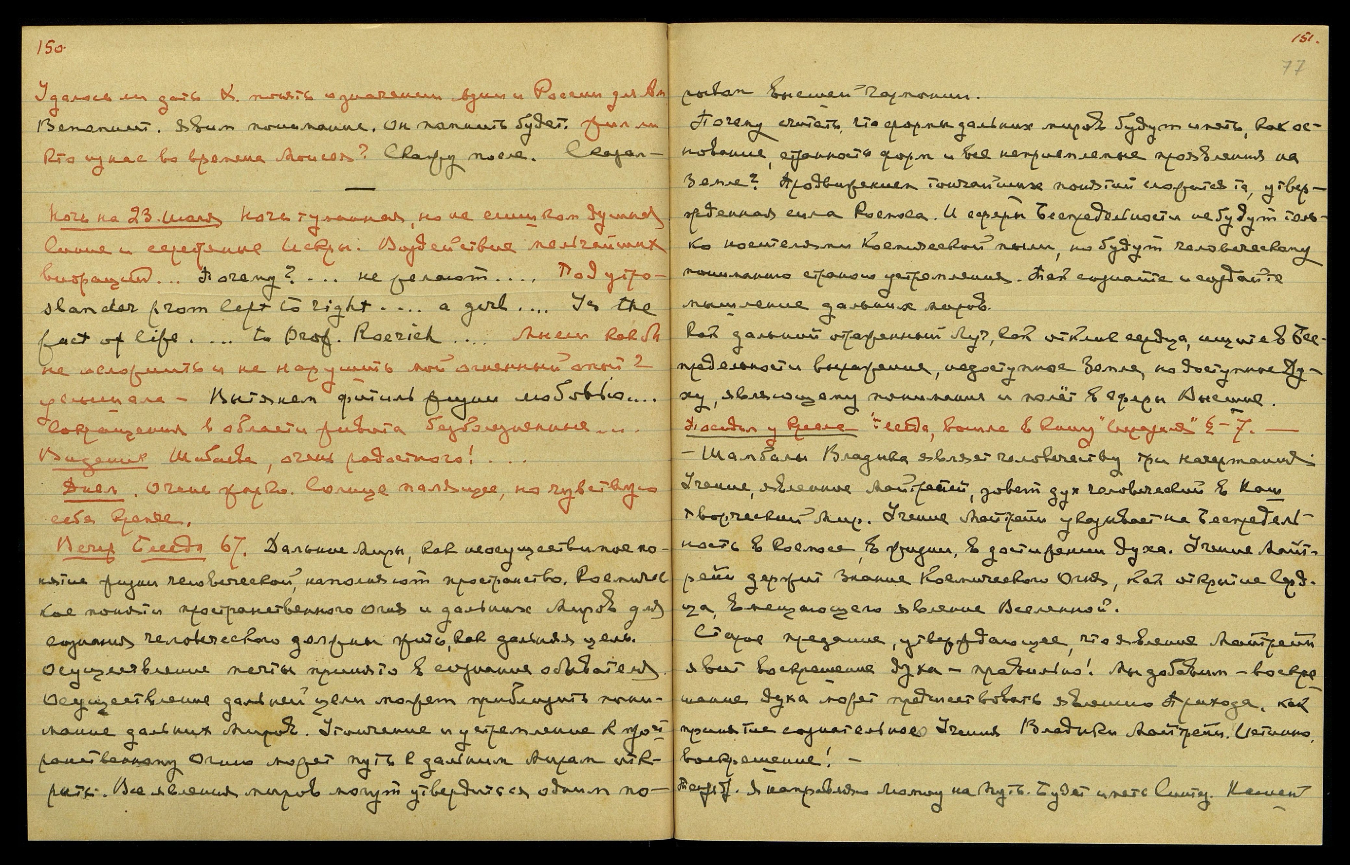 Ночь на 23 июля. Ночь туманная, но не слишком душная. Синие и серебряные искры. Воздействие мельчайших вибраций. "Почему? не желают..." Под утро: "Slander from left to right... a girl... Is the fact of life... to Prof[essor] Roerich... [англ: Клевета слева направо... девушка... Это факт жизни... Профессору Рериху...]" Мысли как бы не осложнить и не нарушить мой огненный опыт. Услышала: "Вытянем фитиль жизни любовью..." Сокращения в области живота безболезненные. Видение Шибаева, очень радостного!