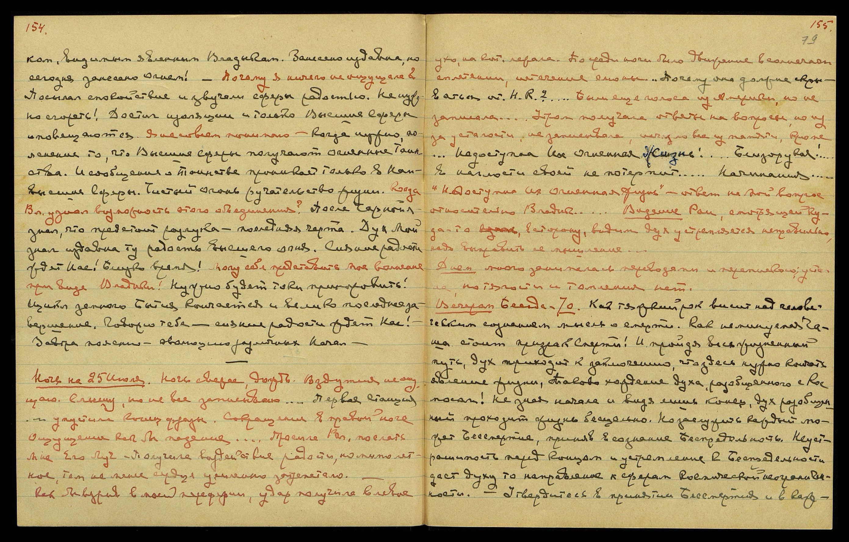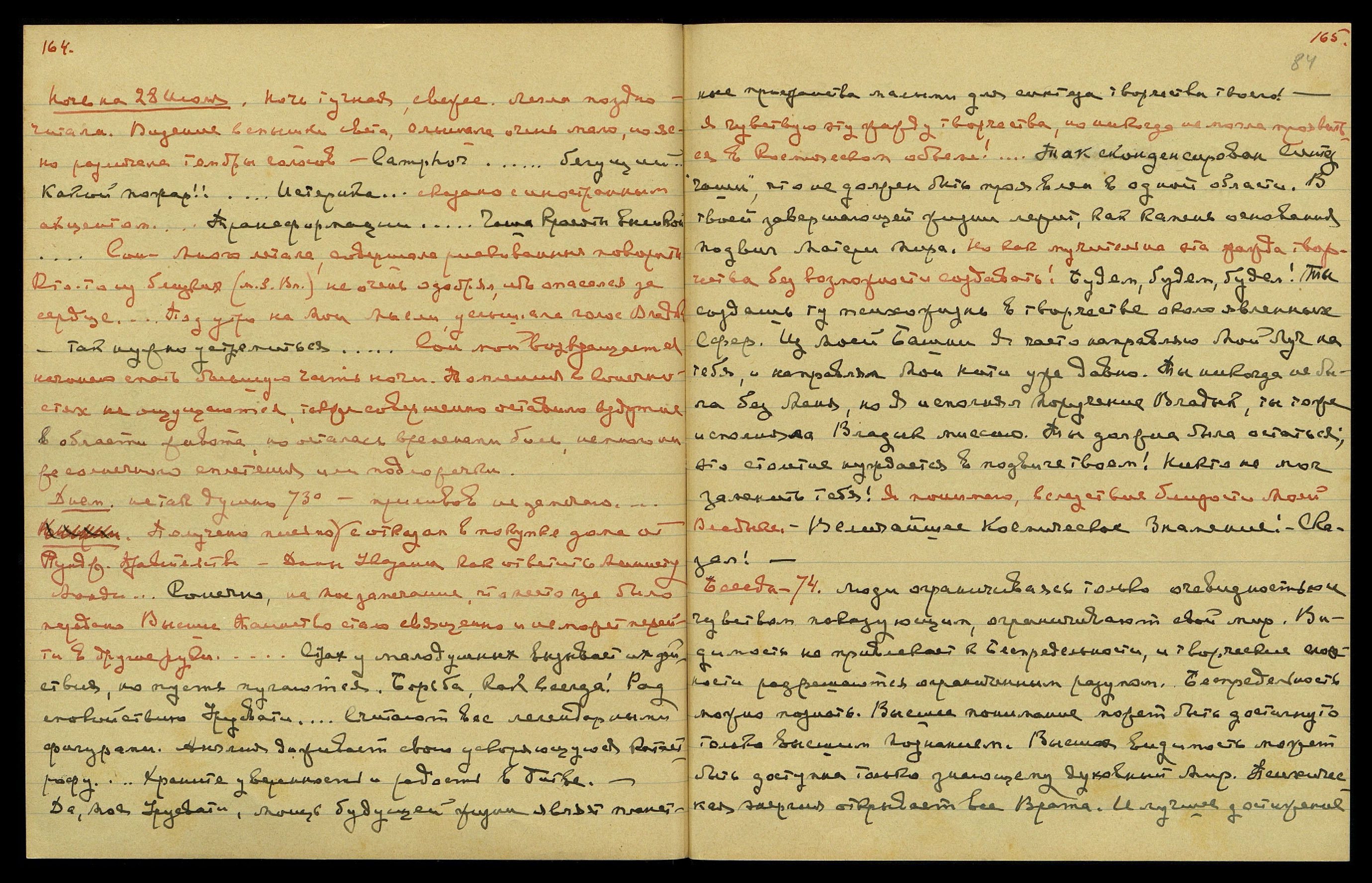 Ночь на 29 июля. [Температура] 73⁰F [= 22,78°C]. Мыла волосы. От духоты не страдаю, нет томления в конечностях. Много волн света синего и серебряного, серебристо-лилово-розового. Чудесная волна пурпуровая, скорее рубиновая, брызнула из темени и залила всю полость головы. Слышала, но не могла записывать из-за утомления [от] мытья моих густых волос. Говорилось о министре и его желании получить как можно больше денег с нас. На мой вопрос Владыка ответил: "Пошлют, пошлют, пошлют..." Следует странное слово, что-то вроде − "Клюкси!" Под утро кое-что записала. Неясная запись кончавшаяся − "...the possibility... [англ: возможность...] почитание... that is with... [англ: то есть с... ] Станина всем... вашу астрономическую и геологическую (человеческую) chartre взяли... пожалеет о том, что... окутал его сомнениями... A very disagreeable. [англ: Очень неприятный.]" Запись неясная.