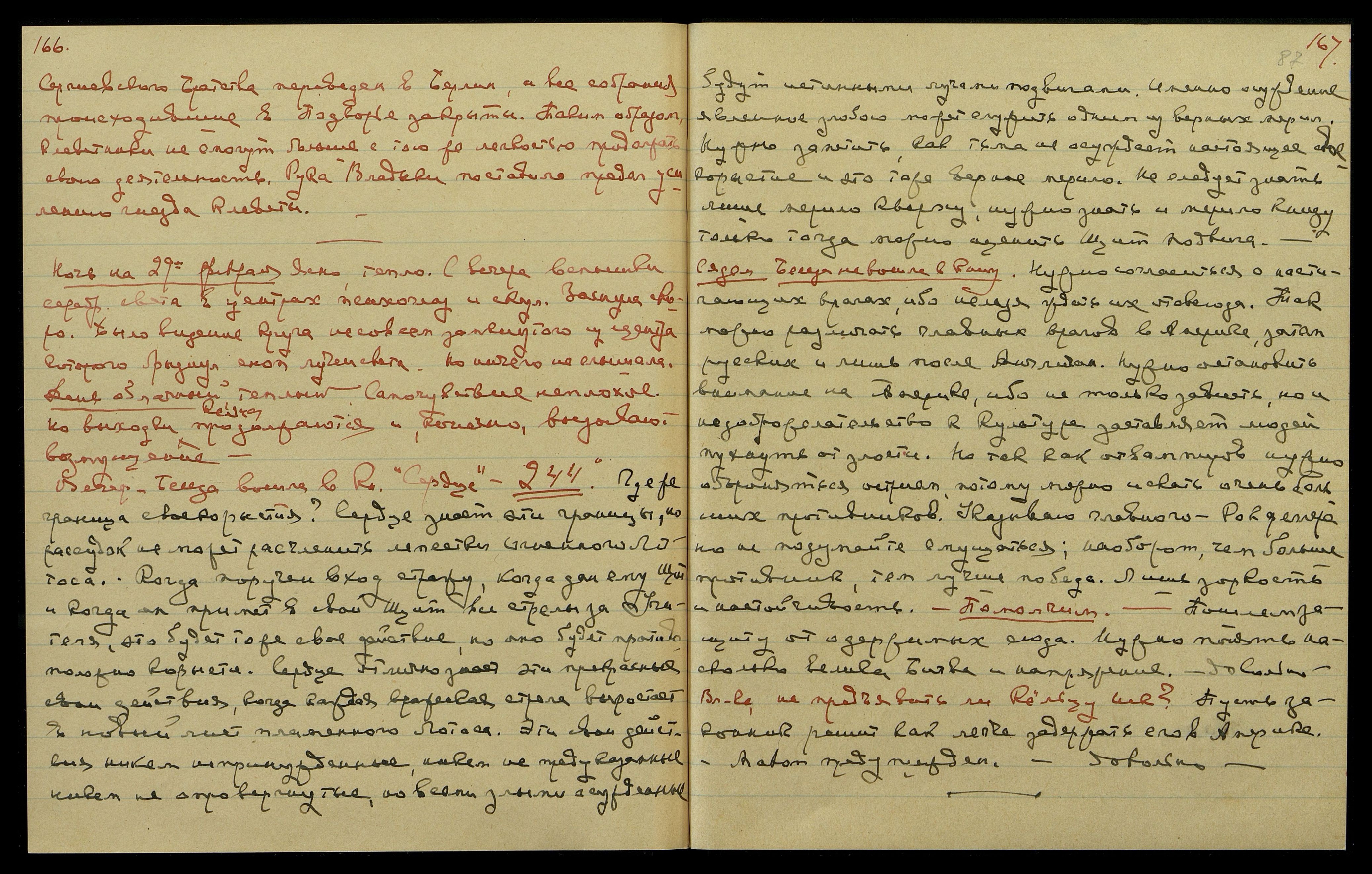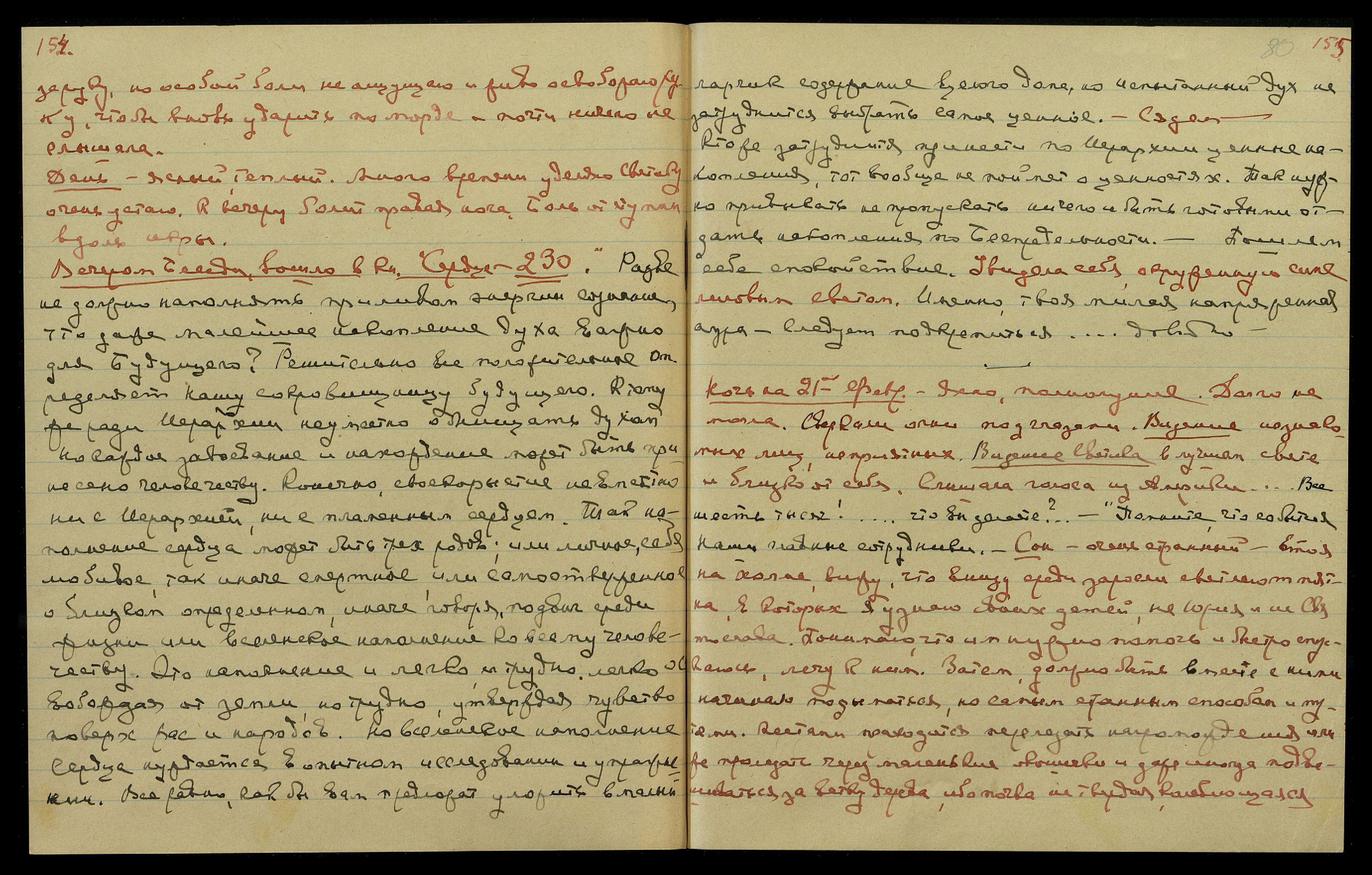 Ночь на 21-ое Февр[аля]. Ясно, полнолуние. Долго не могла [уснуть]. Сверкали огни под глазами. Видение незнакомых лиц, неприятных. Видение Светика в лучшем свете и близко от себя. Слышала голоса из Америки: "...Все шесть тысяч!... что вы делаете?" ... "Помните, что события Наши главные сотрудники".