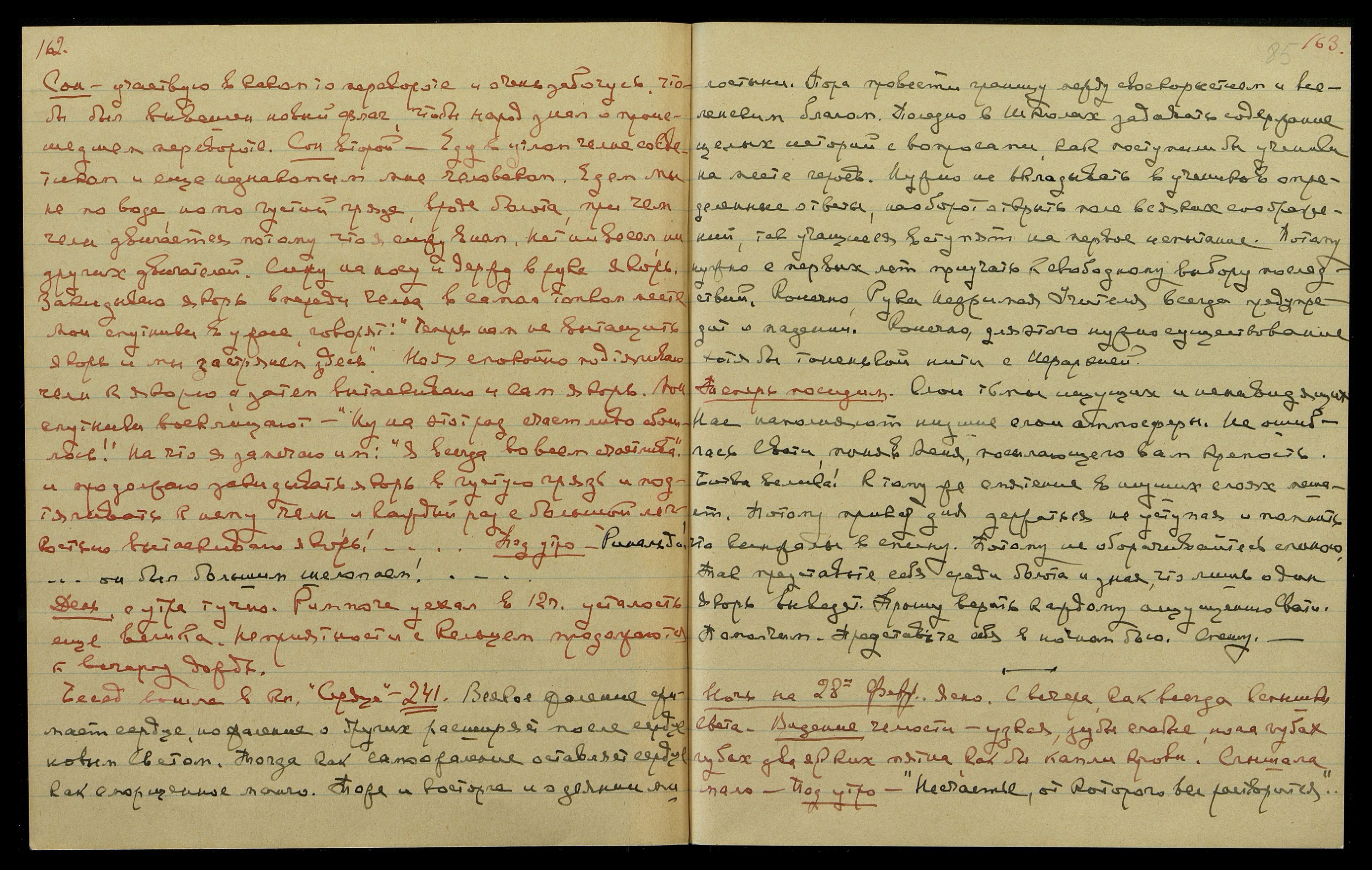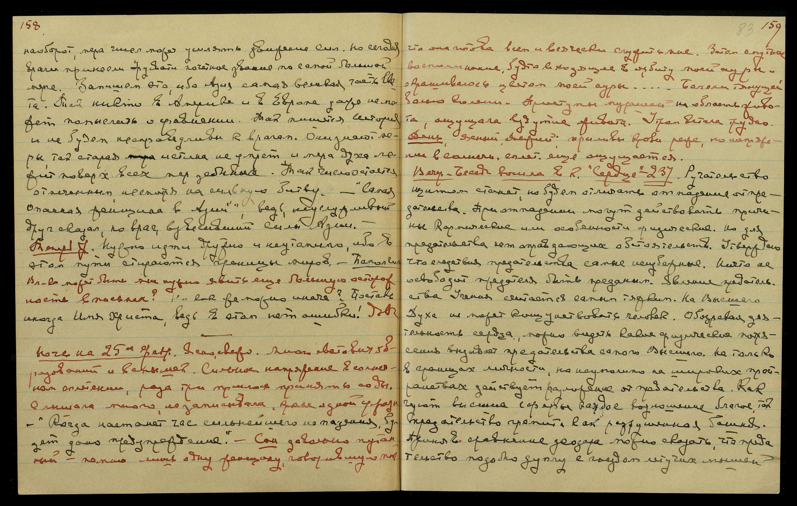 Ночь на 24-ое Февраля. Ясно, свежо. С вечера приливы крови. Очень горячая голова, тело холодное. Напряжение в солнечн[ом] сплетении очень сильное. Трижды приняла соду. Уколы в центры затылка, ломота в нёбе и темени. Долго не могла уснуть. Световые образования окрашены красным светом. Пульс сильный, напряжённый. Под утро заснула. Долетали обрывки, голоса из Америки, не записала.