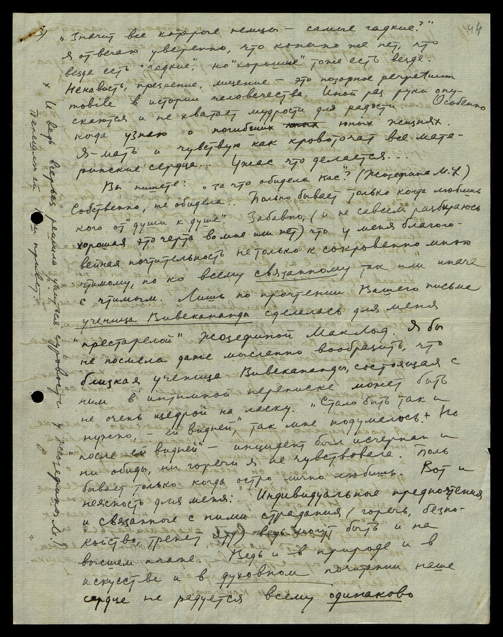 Вы пишите: "За что обидела Вас?" (Жозефина M.L.) Собственно, не обидела... Больно бывает, только когда любишь кого от "души к душе". Забавно, (и не совсем разбираюсь, хорошая эта черта во мне или нет), что у меня благоговейная почтительность не только к сокровенно мною чтимому, но ко всему связанному так или иначе с чтимым. Лишь по прочтении Вашего письма, ученица Вивекананды сделалась для меня "престарелой" Жозефиной Мак Лод. Я бы не посмела даже мысленно вообразить, что близкая ученица Вивекананды, состоящая с ним в интимной переписке может быть не очень щедрой на ласку. "Стало быть, так и нужно, — ей видней", — так мне подумалось.* Но после "ей видней" — инцидент был исчерпан, и ни обиды, ни горечи я не чувствовала. Боль бывает только, когда остро, лично любишь. Вот и неясность для меня: Индивидуальные предпочтения и связанные с ними страдания (горечь, беспокойство, трепет и т.д.) ведь могут быть и на высшем плане. Ведь и в природе, и в искусстве, и в духовном почитании наше сердце не радуется всему одинаково