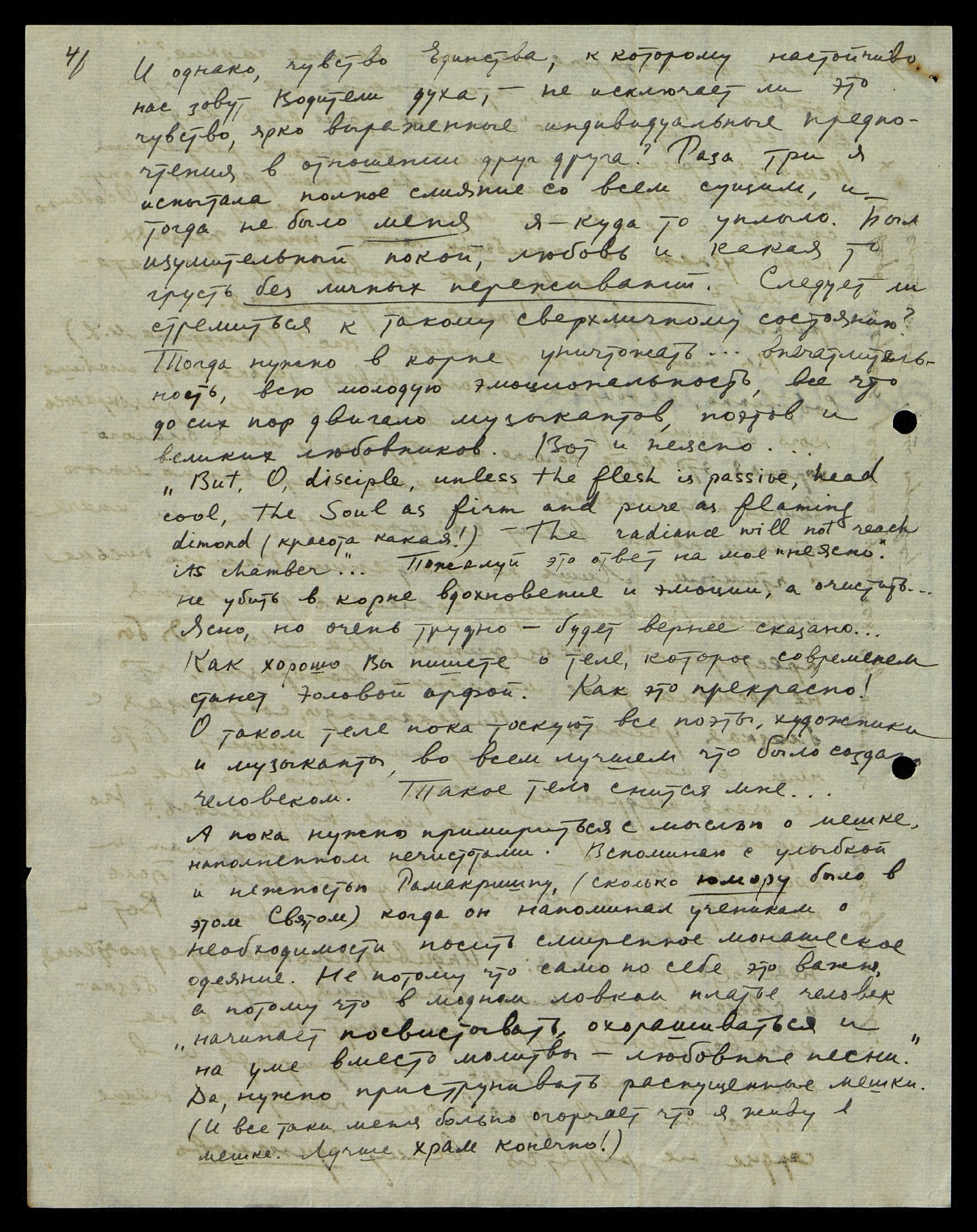 И однако, чувство Единства, к которому настойчиво нас зовут Водители духа, — не исключает ли это чувство ярко выраженные индивидуальные предпочтения в отношении друг друга? Раза три я испытала полное слияние со всем сущим и тогда не было меня, "я" — куда-то уплыло. Был изумительный покой, любовь и какая-то грусть без личных переживаний. Следует ли стремиться к такому сверхличному состоянию? Тогда нужно в корне уничтожать... впечатлительность, всю молодую эмоциональность, всё, что до сих пор двигало музыкантов, поэтов и великих любовников. Вот и неясно... "But, O, disciple, unless the flesh is passive, head cool, the Soul as firm and pure as flaming dimond (какая красота!), — "the radiance will not reach its chamber [англ.: "Но, О, ученик, до тех пор, пока тело не станет пассивным, голова холодной, Душа тверда и полна подобно сиянию алмаза — сияние не достигнет твоего вместилища"]... Пожалуй, это ответ на моё "неясно". Не убить в корне вдохновение и эмоции, а очистить... Ясно, но очень трудно — будет вернее сказано...