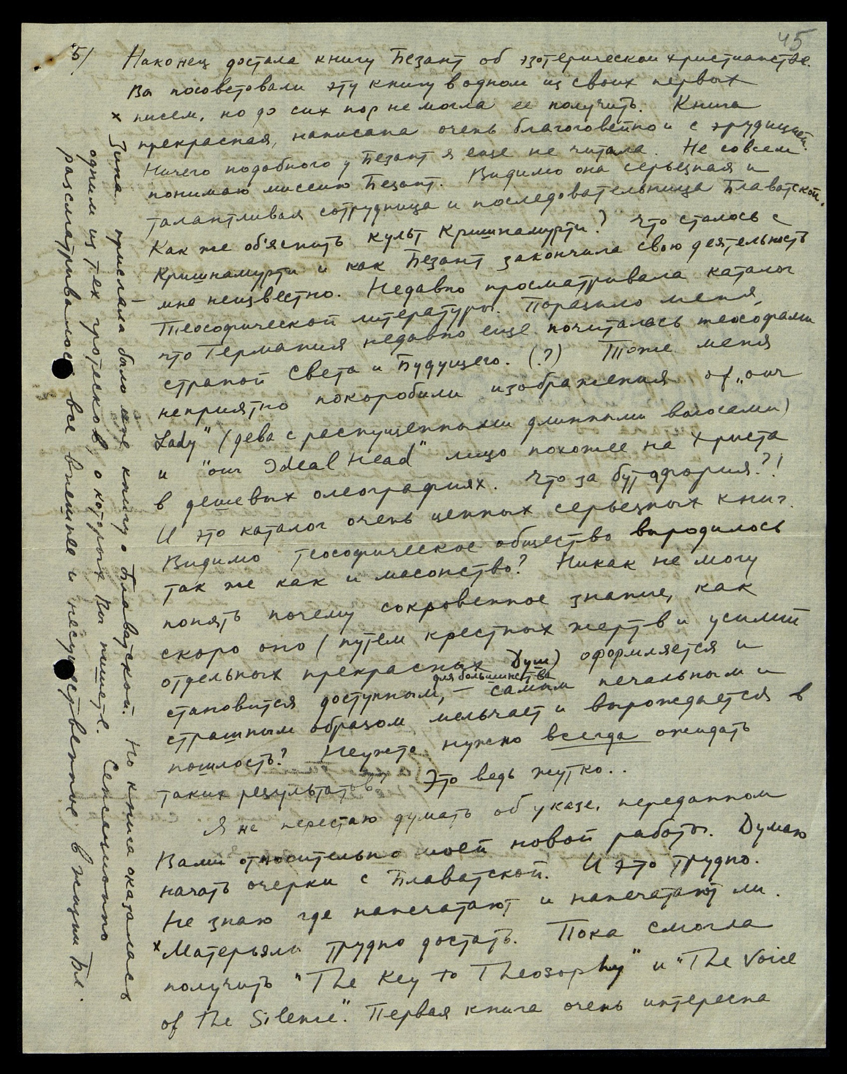 Я не перестаю думать об указе, переданном Вами относительно моей новой работы. Думаю, начать очерки с Блаватской. И это трудно. Не знаю, где напечатают и напечатают ли.* Материалы трудно достать. Пока смогла получить "The Key of Theosophy" [англ.: "Ключ к Теософии"] и "The voice of the Silence" [англ.: "Голос Безмолвия"].