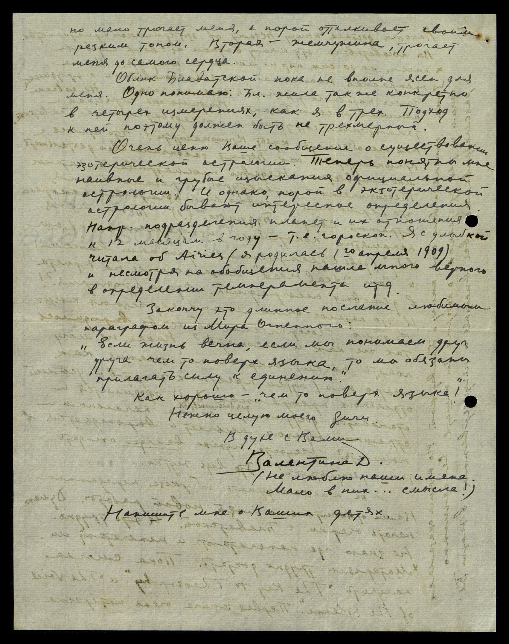 Очень ценю Ваше сообщение о существовании эзотерической астрологии. И однако, порой в экзотерической астрологии бывают интересные определения. Напр[имер], подразделение планет и их отношения к 12 месяцам в году, т[о] е[сть] гороскоп. Я с улыбкой читала об Airies [англ.: овен]. (Я родилась 1-го апреля 1909 года) и несмотря на обобщения, нашла много верного в определении темперамента и т[ак] д[алее].