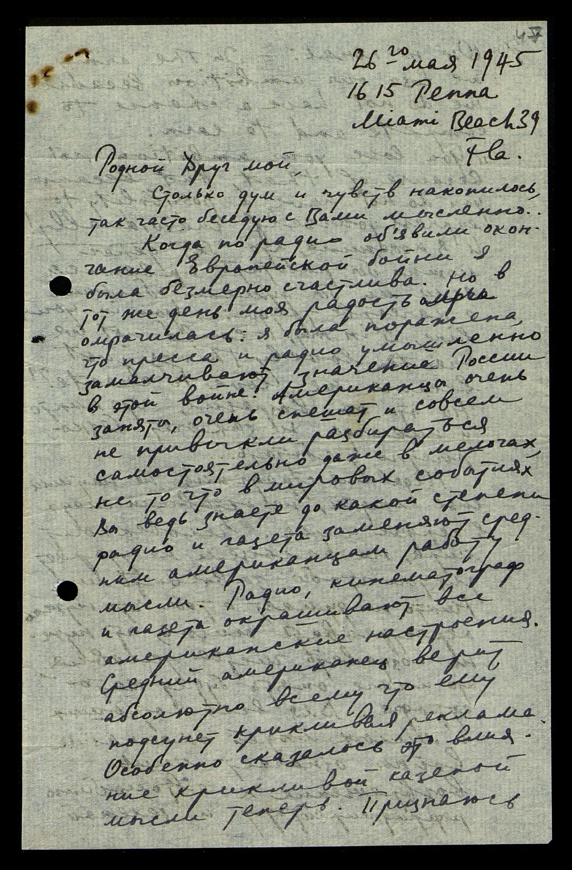 Dearest Helena Ivanovna, — Today is a wonderful day of the end of the war in Europe. My heart is full of joy and hope for the better life... All my best thoughts I send to you and your husband.