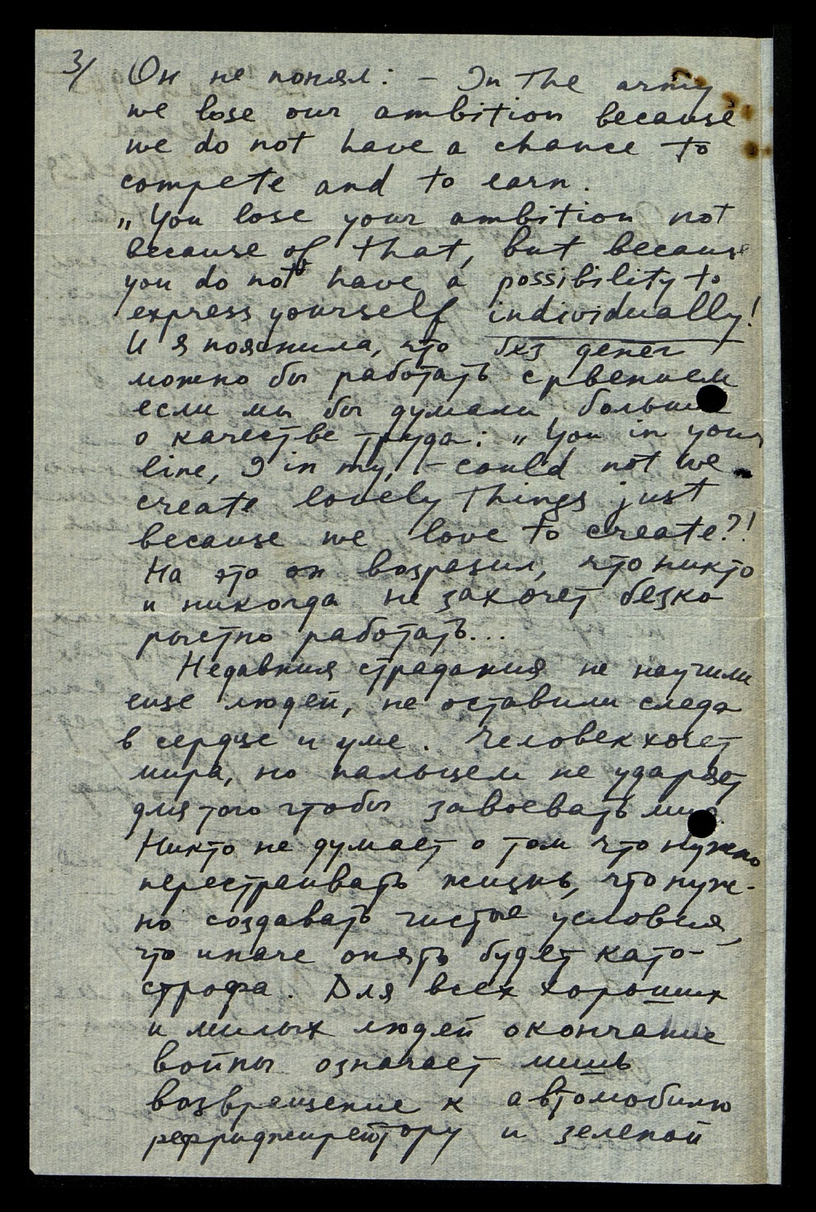 На днях у меня был характерный разговор с молодым славным солдатом (из образованных). Я спросила его о России. Ответил совсем так, как подсказывает радио: "Well, they did a pretty good job, they helped us nicely!" — "But don't you think that... we were the ones who helped them, nicely?! And they did the hardest, the most unusual and heroic "job"! — "I did not think about it!" [англ.: "Что ж, они неплохо поработали, помогли нам здорово!" — "Но тебе не кажется, что... это мы им здорово помогли?! И они проделали самую тяжелую, самую необычную и героическую «работу»". — "Я не думал об этом!"].