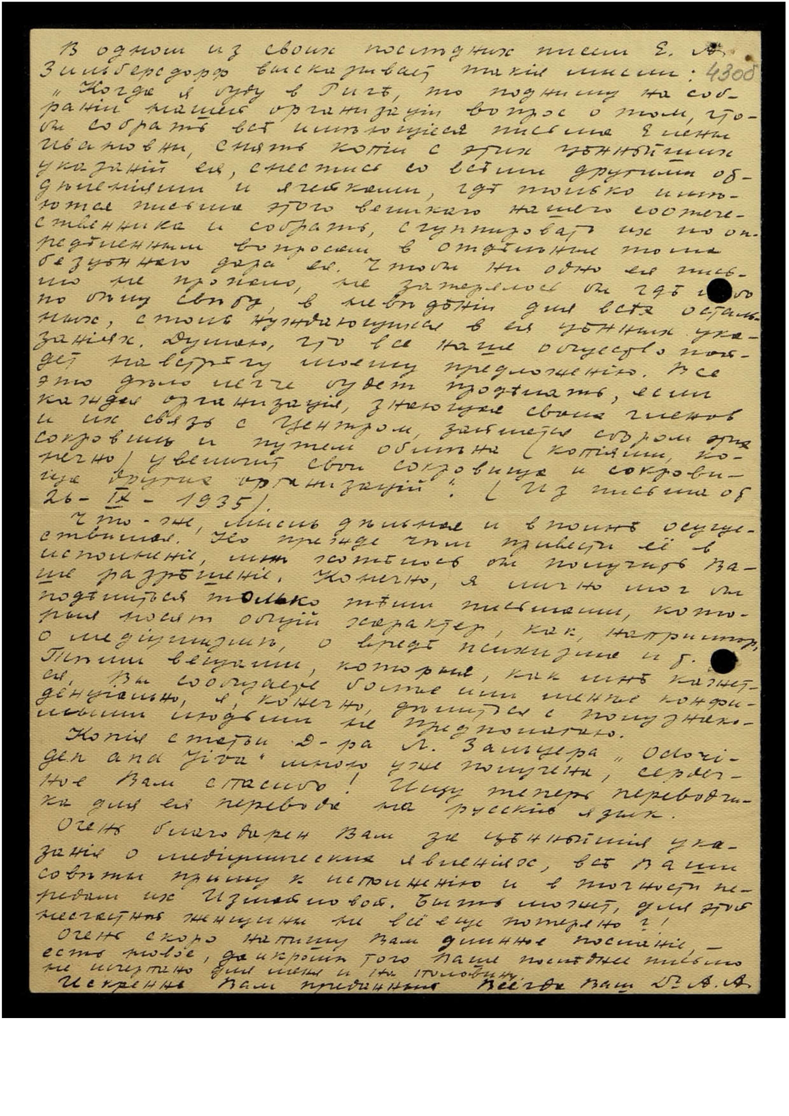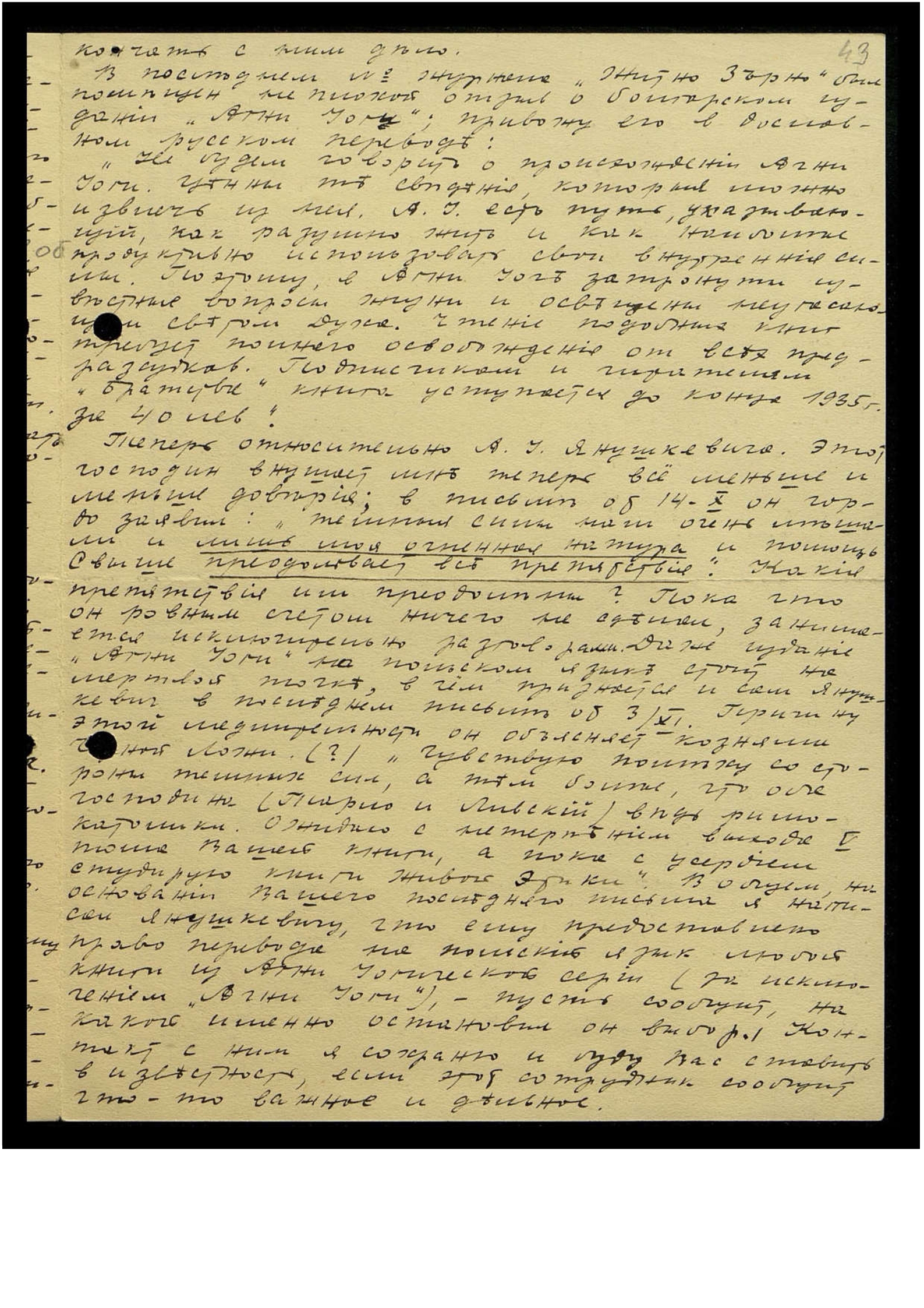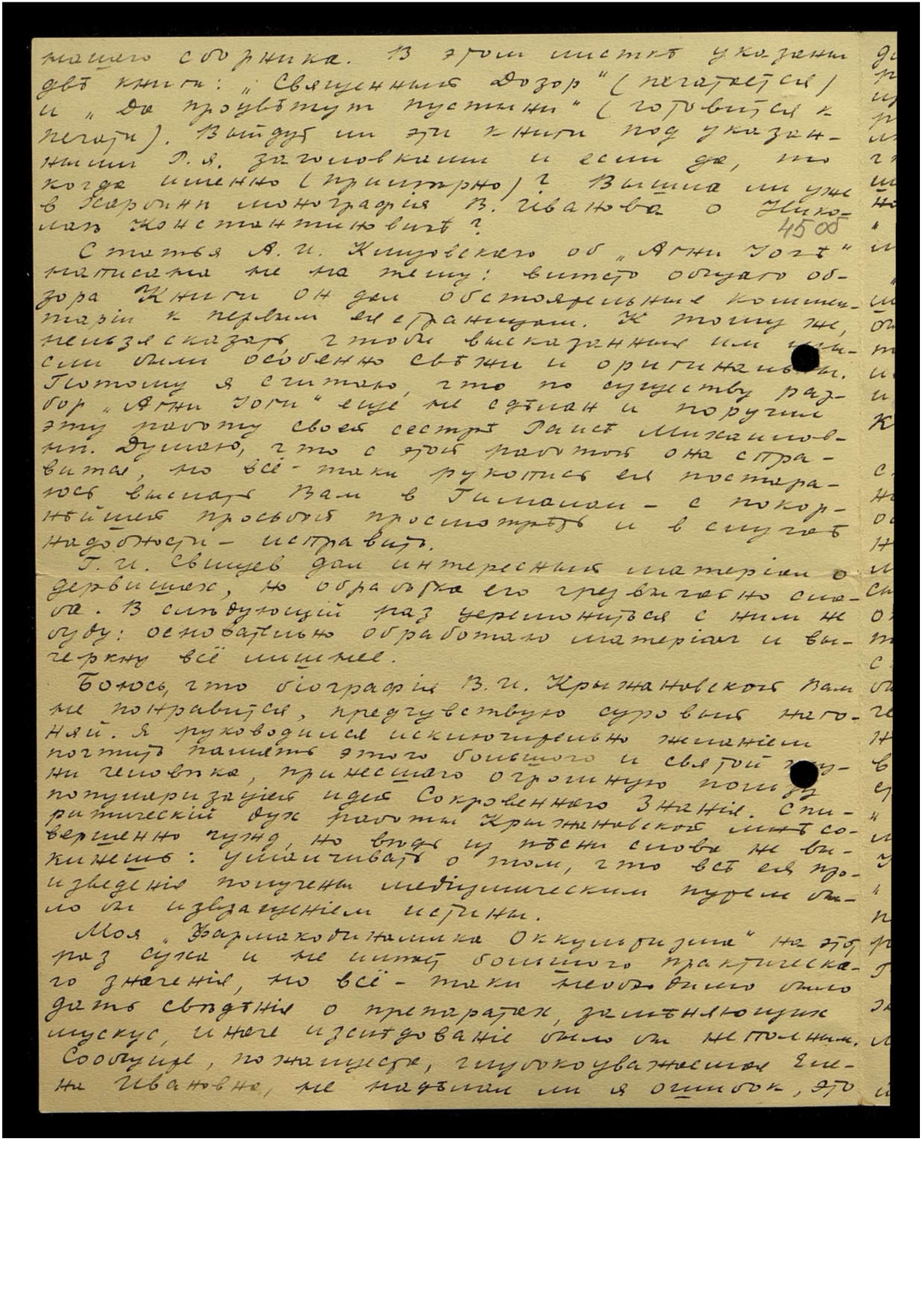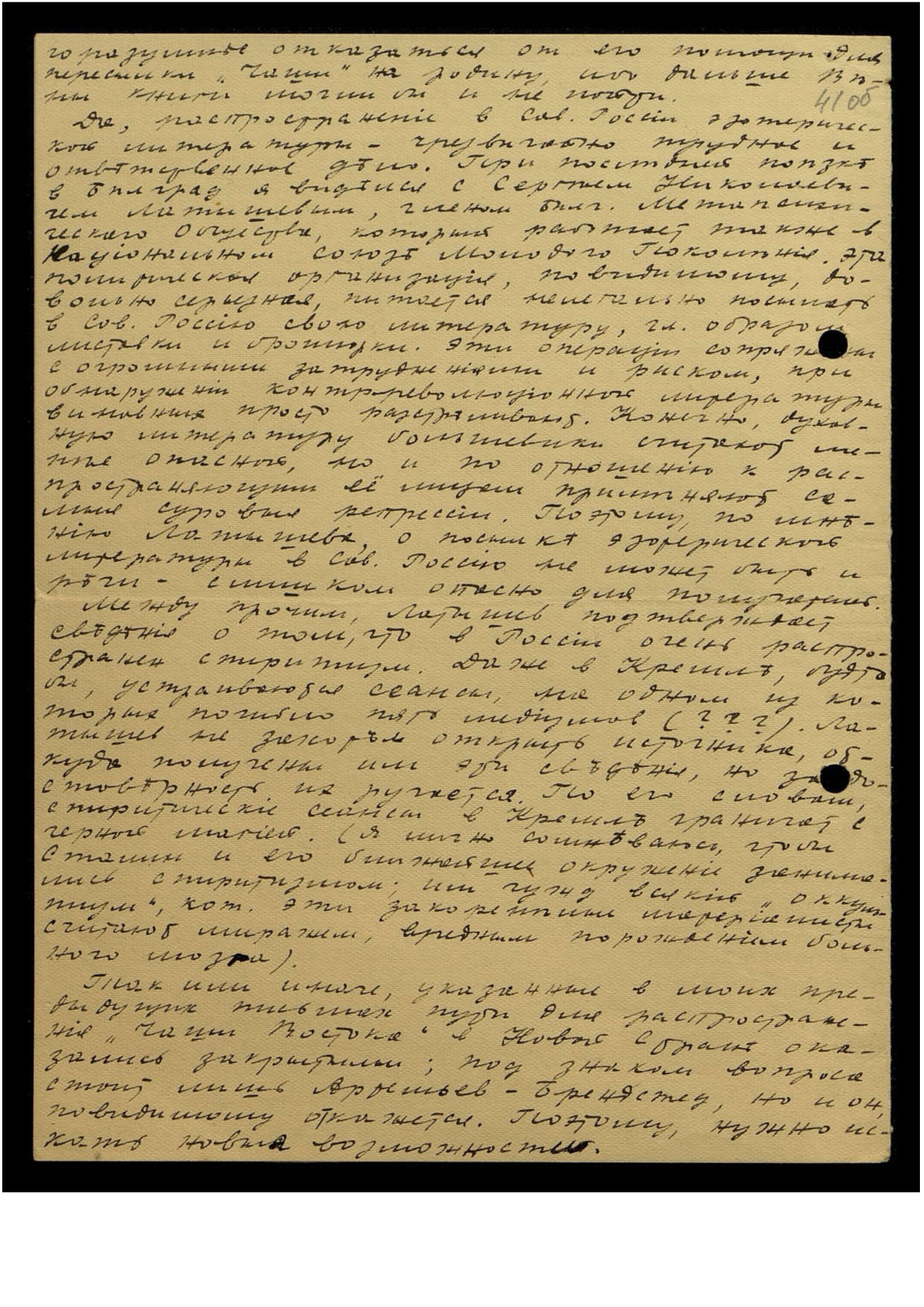Да, распространение в Сов[етской] России эзотерической литературы — чрезвычайно трудное и ответственное дело. При последней поездке в Белград я виделся с Сергеем Николаевичем Латышевым, членом болг[арского] Метапсихического Общества, который работает также в Национальном Союзе Молодого Поколения. Эта политическая организация, по-видимому, довольно серьёзная, пытается нелегально посылать в Сов[етскую] Россию свою литературу, гл[авным] образом листовки и брошюрки. Эти операции сопряжены с огромными затруднениями и риском, при обнаружении контрреволюционной литературы виновных просто расстреливают. Конечно, духовную литературу большевики считают менее опасной, но и по отношению к распространяющим её лицам применяют самые суровые репрессии. Поэтому, по мнению Латышева, о посылке эзотерической литературы в Сов[етскую] Россию не может быть и речи — слишком опасно, для получений.