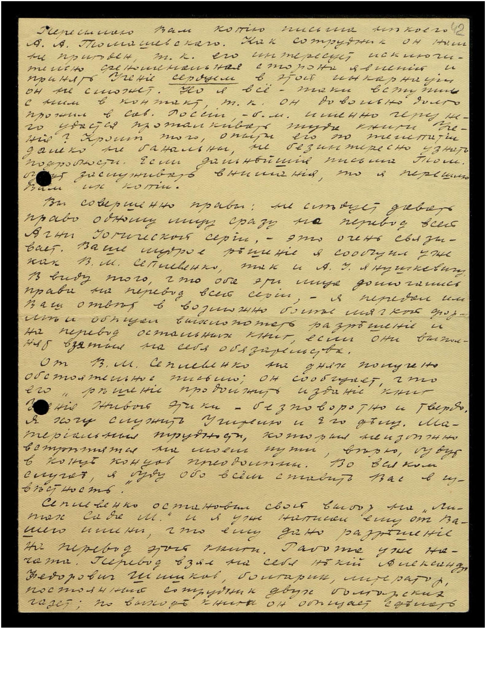 Вы совершенно правы: не следует давать право одному лицу сразу на перевод всей Агни Йогической серии, это очень связывает. Ваше мудрое решение я сообщил уже как В.М. Сеплевенко, так и А.И. Янушкевичу. В виду того, что оба эти лица домогались права на перевод всей серии, я передал им Ваш ответ в возможно более мягкой форме и обещал выхлопотать разрешение и на перевод остальных книг, если они выполнят взятые на себя обязательства.