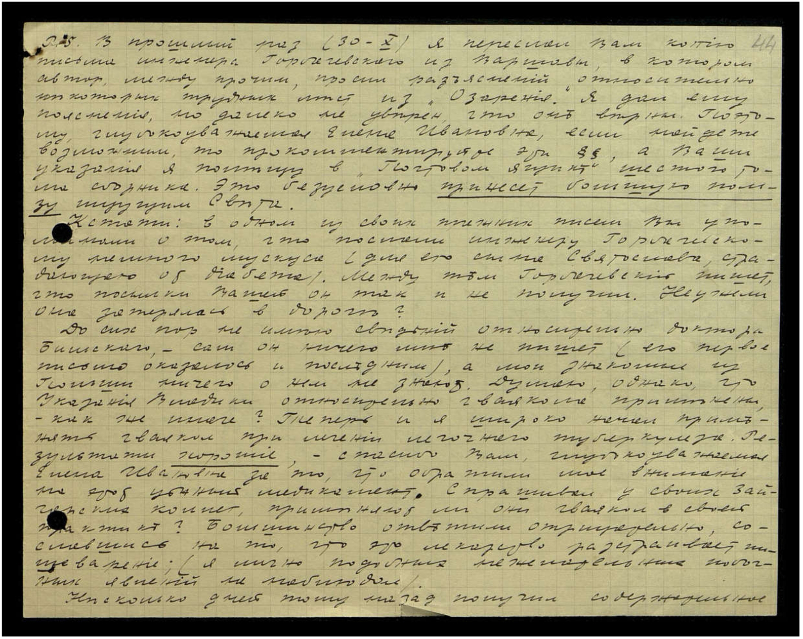 P. S. В прошлый раз (30-X) я переслал Вам копию письма инженера Горбачевского из Варшавы, в котором автор, между прочим, просил разъяснений относительно некоторых трудных мест из "Озарения". Я дал ему пояснения, но далеко не уверен, что они верны. Поэтому, глубокоуважаемая Елена Ивановна, если найдёте возможным, то прокомментируйте эти §§, а Ваши указания я помещу в "Почтовом ящике" шестого тома сборника. Это, безусловно, принесёт большую пользу ищущим Света.