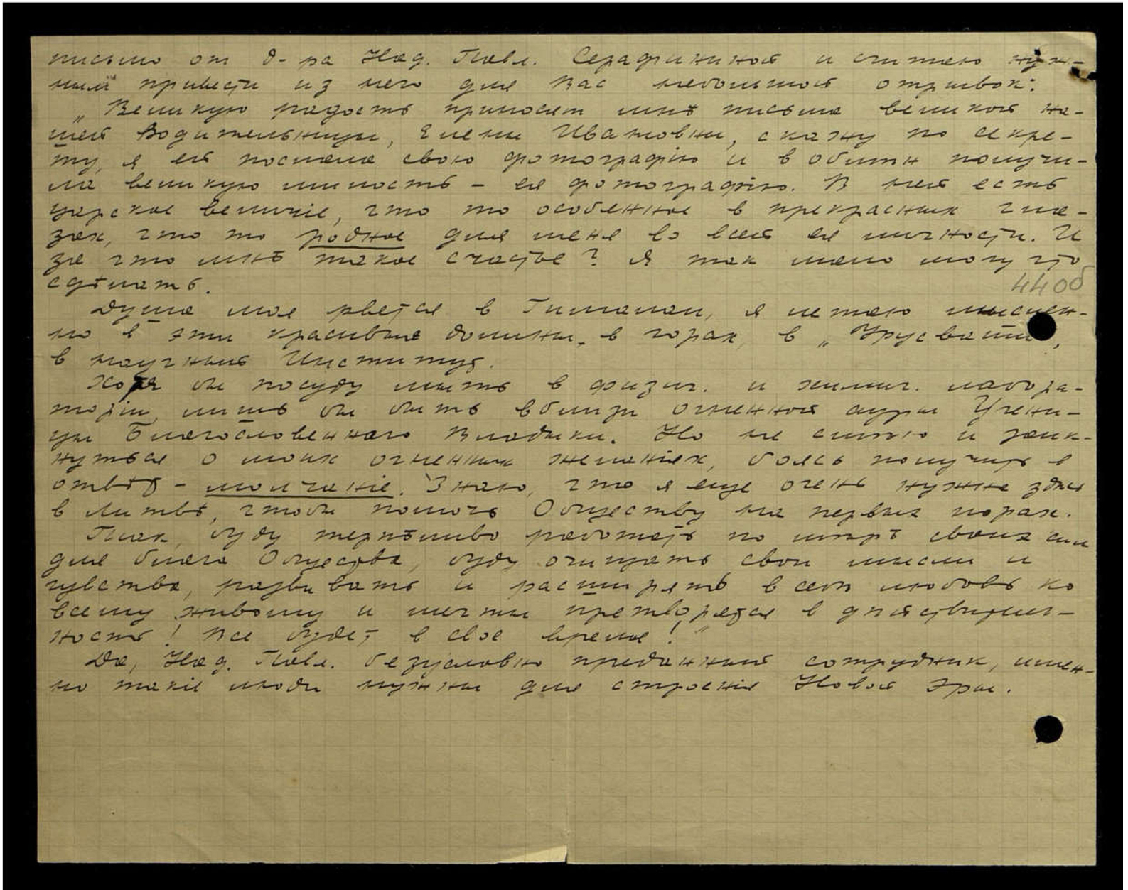 Я лично, конечно, помогу ему, но много дать не могу, т[ак] к[ак] весь мой заработок поглощает издание сборника. Если у Вас есть возможность, уважаемая Елена Ивановна, оказать Сеплевенко небольшую денежную поддержку, то это имело бы для него огромное значение. Напишу по этому поводу и Нью-Йоркскому Комитету; если они решат помочь (это мало вероятно) и запросят Ваше мнение, то, пожалуйста, выскажитесь в благоприятном для Сеплевенко смысле.