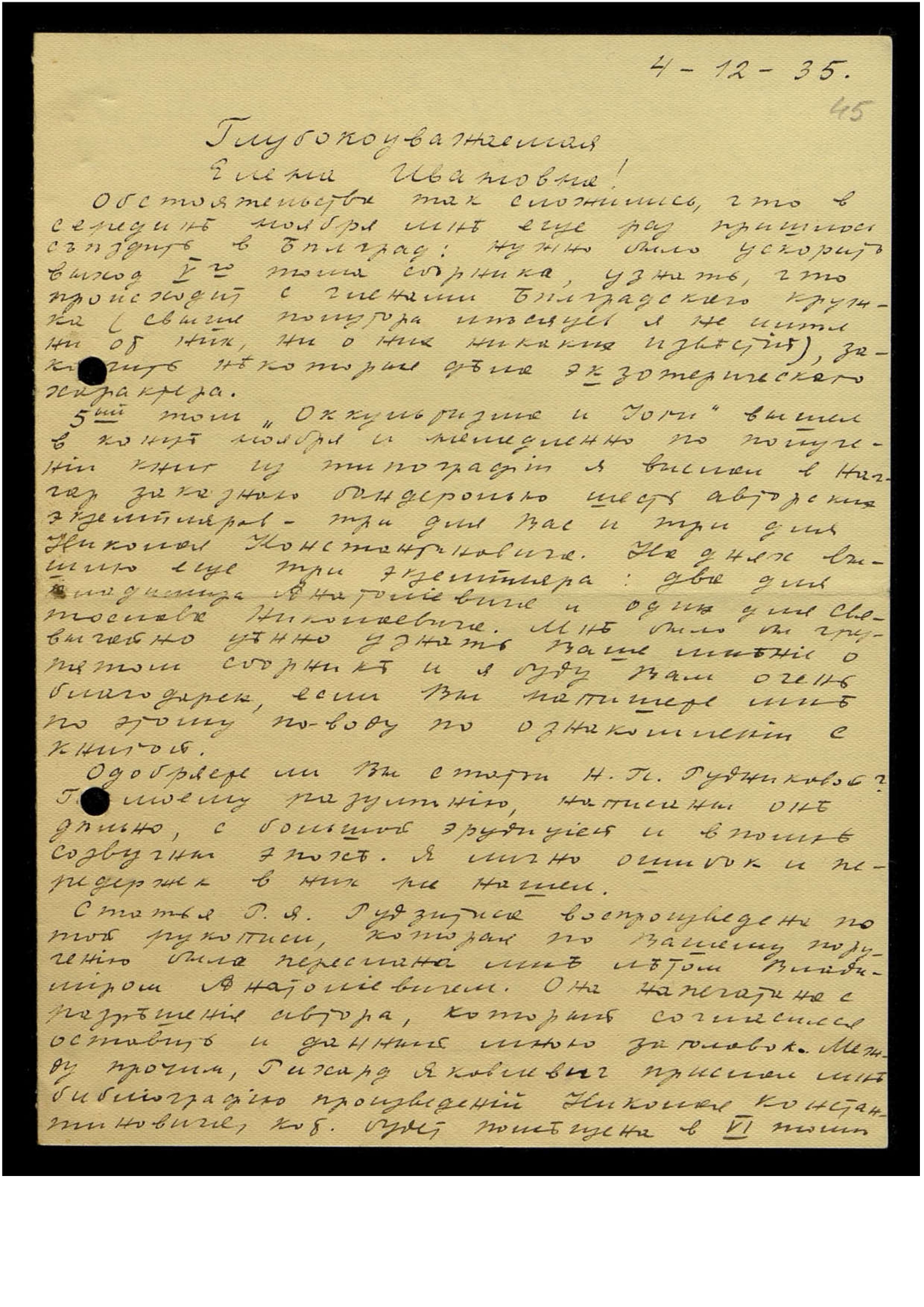 Статья Р.Я. Рудзитиса воспроизведена по той рукописи, которая по Вашему поручению была переслана мне летом Владимиром Анатольевичем. Она напечатана с разрешения автора, который согласился оставить и данный мною заголовок. Между прочим, Рихард Яковлевич прислал мне библиографию произведений Николая Константиновича, кот[орая] будет помещена в VI томе