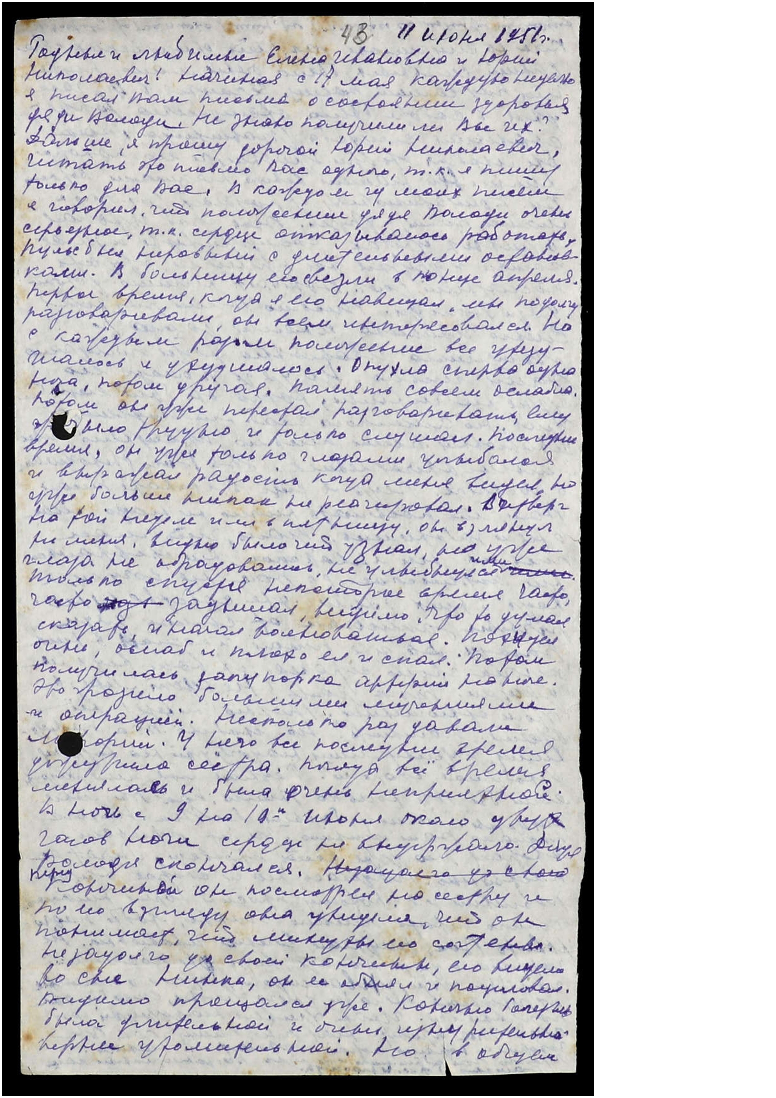 Родные и любимые Елена Ивановна и Юрий Николаевич! Неделю тому назад послал Вам печальное письмо с известием о кончине дяди Володи. Он скончался в ночь на 10-ое июня в 2 ч[аса] ночи. В больнице, где он проболел около полутора месяцев. Отказалось работать сердце. Был он очень слаб. Когда видел его последний раз, он уже не мог говорить, лишь по глазам увидел, что он меня узнал. Глаза уже не улыбались, как раньше. Похоронили, был он весь в цветах и многие пришли отдать последний долг. Начиная с 17 мая пишу Вам раз в неделю. От Вас с зимы ответа не получал. Писал Вам в янв[аре], февр[але] и апреле. Получили ли? Жаль, если не дошли. Нинка продолжает хворать; иной раз ей очень тяжко бывает, а порой терпимо. Ваше последнее письмо дяде Володе и Людмиле Ивановне [Чистяковой] дошло, но ему уже не читали. Я оба прочел. Спасибо, что не забываете. Родная, так стосковался по Вас. Скоро ли свидимся. Привет от Нинки. Всегда Ваш, сын Борис.