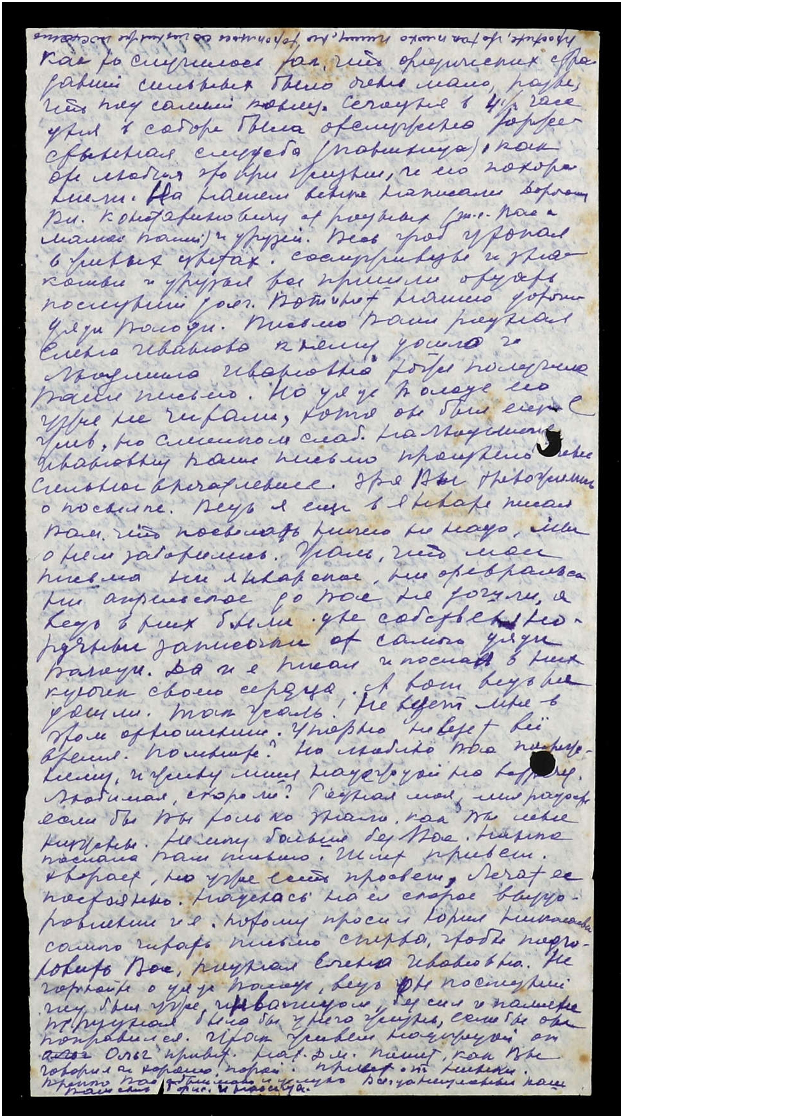 Родная и любимая Елена Ивановна. Очень беспокоит меня Ваше здоровье. Любимая, берегите свои силы, ну хотя бы ради нас. Как без Вас-то? Даже и помыслить невозможно. Без Вас не могу. Берегите себя, родная. Дядя Володя по-прежнему лежит в больнице: сильно ослаб, говорить уже не может, пульс плохой, очень слабый и с перебоями. Я уже писал об этом. Положение его доктор считает очень серьезным, очень. Екатерина Петровна [Инге] Ваше письмо от 24 апреля получила. Мы Вас не забыли, пишем. Но Вы пишете, что моих писем не получили. Жаль. В них были две записочки и от дяди Володи. Он тогда был еще здоров. Писал Вам в январе, феврале и апреле. Жаль, что не получили, ведь в каждом был кусочек сердца. Нинка временами чувствует себя лучше. Неделю назад написала Вам сама. С середины мая пишу Вам раз в неделю, но по большей части открытки. Нет у меня никого дороже и любимее Вас. Писал ведь, ведь навсегда Ваш, моя радость, моя единственная, любимая. Прошу, очень прошу, пусть Ю[рий] Н[иколаевич] хранит для меня Вашу фотографию, но снимет Вас сейчас, пусть хранит до того времени, когда это будет можно. Я знаю, сейчас нельзя. Но пусть снимет Вас сейчас, и пусть она будет у него или у Вас. Как я о Вас стосковался. Привет от Нинки [слово неразборчиво] и Ю. Н. Крепко Вас обнимаю и целую, всегда Ваш сын Борис.