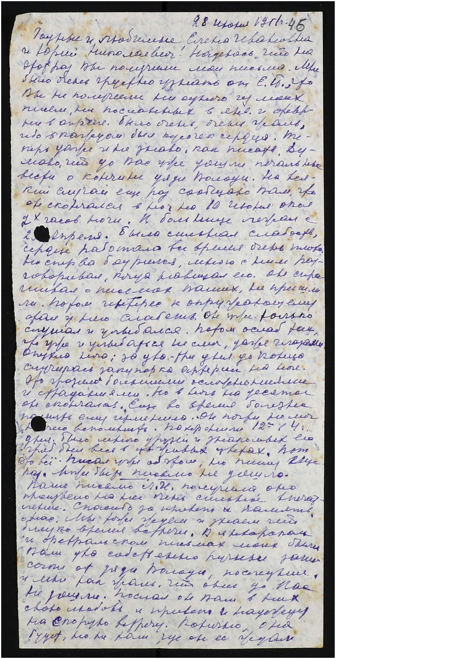 Родные и любимые Елена Ивановна и Юрий Николаевич! Надеюсь, что на этот раз Вы получили мои письма. Мне было очень трудно узнать от Екатерина Петровна [Инге], что Вы не получили ни одного из моих писем, ни посланных в январе и феврале, ни в апреле. Было очень, очень жаль, ибо в каждом был кусочек сердца. Теперь даже и не знаю, как писать. Думаю, что до Вас уже дошли печальные вести о кончине дяди Володи. На всякий случай еще раз сообщаю Вам, что он скончался в ночь на 10 июня около 2-х часов ночи. В больнице лежал с 29 апреля. Была сильная слабость, сердце работало всё время очень плохо. Но сперва бодрился, много с ним разговаривал, когда навещал его. Он спрашивал о письмах Ваших, не пришли ли. Потом интерес к окружающему стал у него слабеть. Он уже только слушал и улыбался. Потом ослаб так, что уже и улыбаться не смог, даже глазами. Опухла нога; за два-три дня до конца случилась закупорка артерии на ноге. Это грозило большими осложнениями и страданиями. Но в ночь на десятое он скончался. Еще во время болезни память ему изменила. Он почти не мог ничего вспомнить. Похоронили 12-го в 4 ч[аса] дня. Было много друзей и знакомых, его гроб был весь в живых цветах. Вот это всё. Писал уже об этом, но пишу еще раз. Может быть, письмо не дошло.