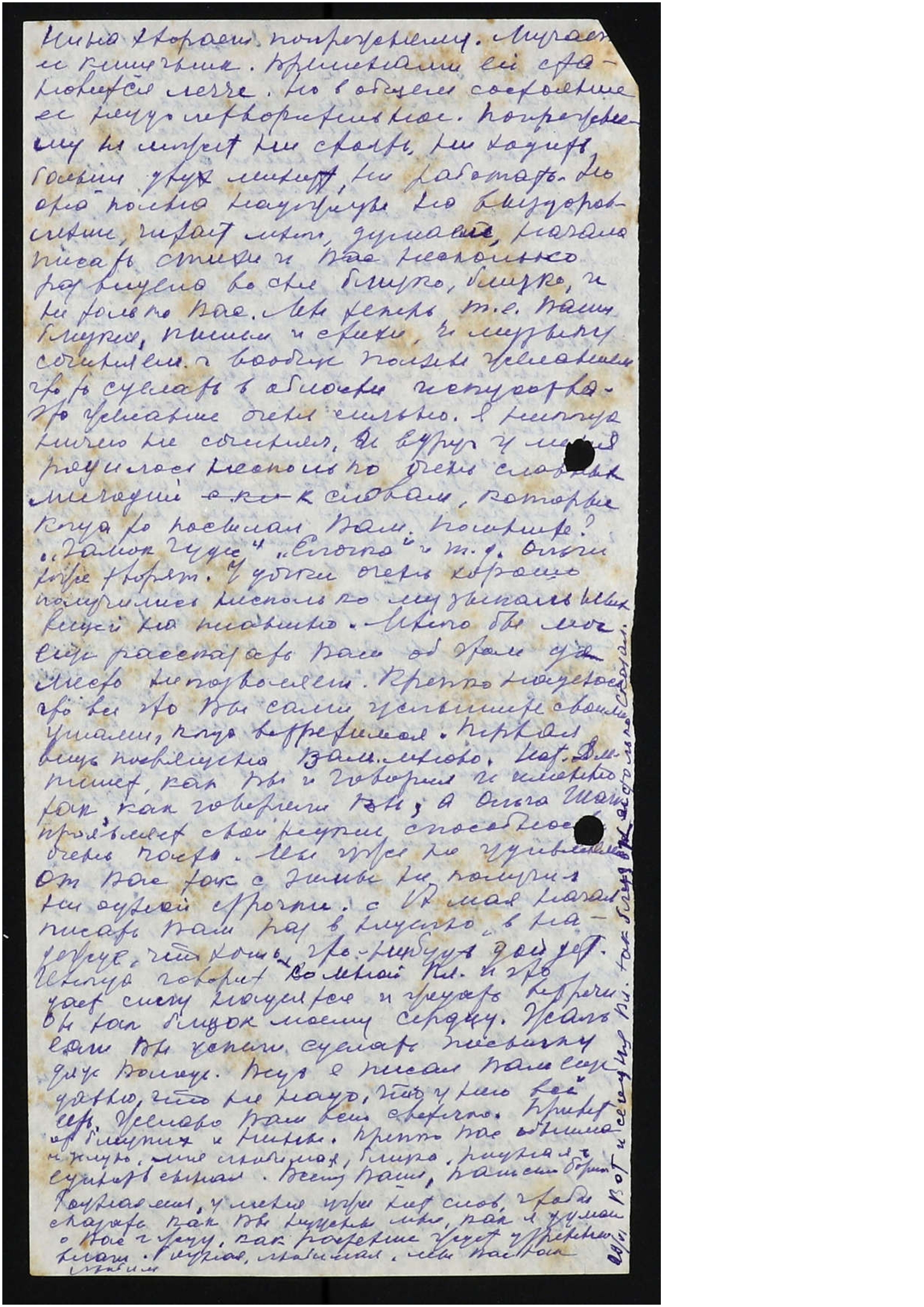 Родные и любимые Елена Ивановна и Юрий Николаевич! В один день получили сразу оба Ваших письма от 21/5 и 18/7. Почему Вы считаете, что Вам еще что-то надо посылать для дяди Володи? Посылать больше ничего не надо. Палата в больнице ему полагалась бесплатно еще по старой его службе, а лечение оплачивала контора, где он служил и даже оплатила похороны. Нужно было только заплатить сестре, особо к нему приставленной, но Вы вероятно не знаете, [что] после дяди Володи остались вещи, которые он целиком отписал доктору, по докторской же инициативе ещё в прошлом году. Стоимость этих вещей в пять-шесть раз превышает ту сумму, которую надо было уплатить сестре. Его хозяйка, Людмила Антоновна, не взяла и не захотела взять ничего, ни одной тряпочки. Она сказала: "Мне ничего не надо". Так что всё взял доктор. Людмила же Антоновна, т.е. его хозяйка, получала из конторы продукты и зарплату дяди Володи и никаких претензий не имеет. Кроме того я ей сказал, что за доброе отношение к дяде Володе она всегда может рассчитывать на наше внимание. Мои близкие почли бы обидой, если бы за их бескорыстное и радостное желание помочь больному, им была бы предложена какая-то компенсация. Так что вполне резонно будет, если Вы не будете себя утруждать мыслями о том, что Вы что ещё должны, да ещё доктору. Помощь нужна была бы только в случае, если бы он поправился и если бы его уволили со службы. Но его не увольняли и он... не поправился. В моих январском и февральском письме были две последние собственноручные записки от дяди Володи, последние, которые написал Вам покойный. Получили ли? И у Лиды сейчас очень трудная полоса. Помните, писал Вам о женихе и невесте. Кажется, дело расстроилось. Рад. Не моя была это идея. А отсутствие воли - признак очень печальный. А Нинка Людмилу предупредила, что жених мало ей подходит. Ека, т.е. Екатерина Петровна [Инге], получила Ваше письмо от 24/7. Да! Чувствуется близость встречи. Об Оле позаботимся. Она имела небольшой отпуск и отдохнул[а], правда, очень мало, на лоне природы. Дадим ей возможность спасаться от матери, когда та станет на нее набрасываться, что она делает от времени до времени. Оля не знает музыки, не умеет рисовать, петь и писать. Но за последнее время она вдруг начала писать стихи и очень своеобразные и все об Учении. Затем она ухитрилась запомнить уловленную ею же музыку к некоторым из них и даже пела их мне. Мотив прост, но очень необычен и красив. Оттуда же улавливает и картины, которые рисует. Картины либо в стиле Н[иколая] К[онстантиновича Рериха], либо схожие, но оригинальны необычайно, несмотря на всю её неумелость. Читая стихи, она некоторые из них сопровождает движениями рук и тела. Получается нечто столь новое и своеобычное, что это может стать новым вкладом в искусство. Мы назвали это мелопластикой.