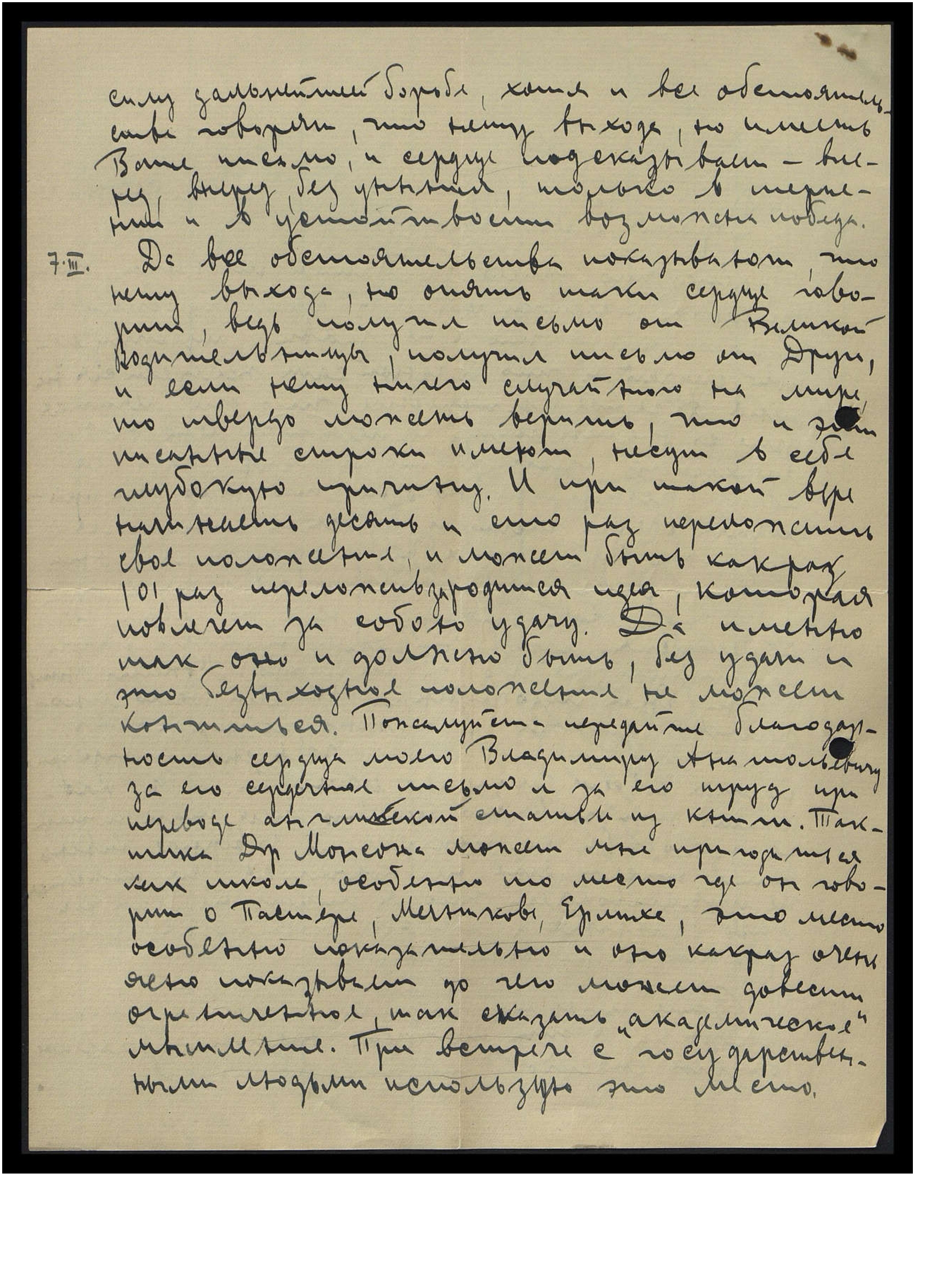 7.III. Да, все обстоятельства показывают, что нету выхода, но опять-таки сердце говорит, ведь получил письмо от Друга, и если нету ничего случайного на мире, то твёрдо можешь верить, что и эти писанные строки имеют, несут в себе глубокую причину. И при такой вере начинать десять и сто раз переложить своё положение, и может быть, как раз 101 раз переложив, зародится идея, которая повлечёт за собою удачу. Да, именно так оно должно быть, без удачи и это безвыходное положение не может кончиться. Пожалуйста, передайте благодарность сердца моего Владимиру Анатольевичу за его сердечное письмо и за его труд при переводе английской статьи из книги. Тактика Др. Монсона может мне пригодиться, как школа, особенно то место, где он говорит о Пастере, Мечникове, Ерлихе*, это место особенно показательно, до чего может может довести ограниченное, так сказать, "академическое" мышление. При встрече с государственными людьми использую это место.