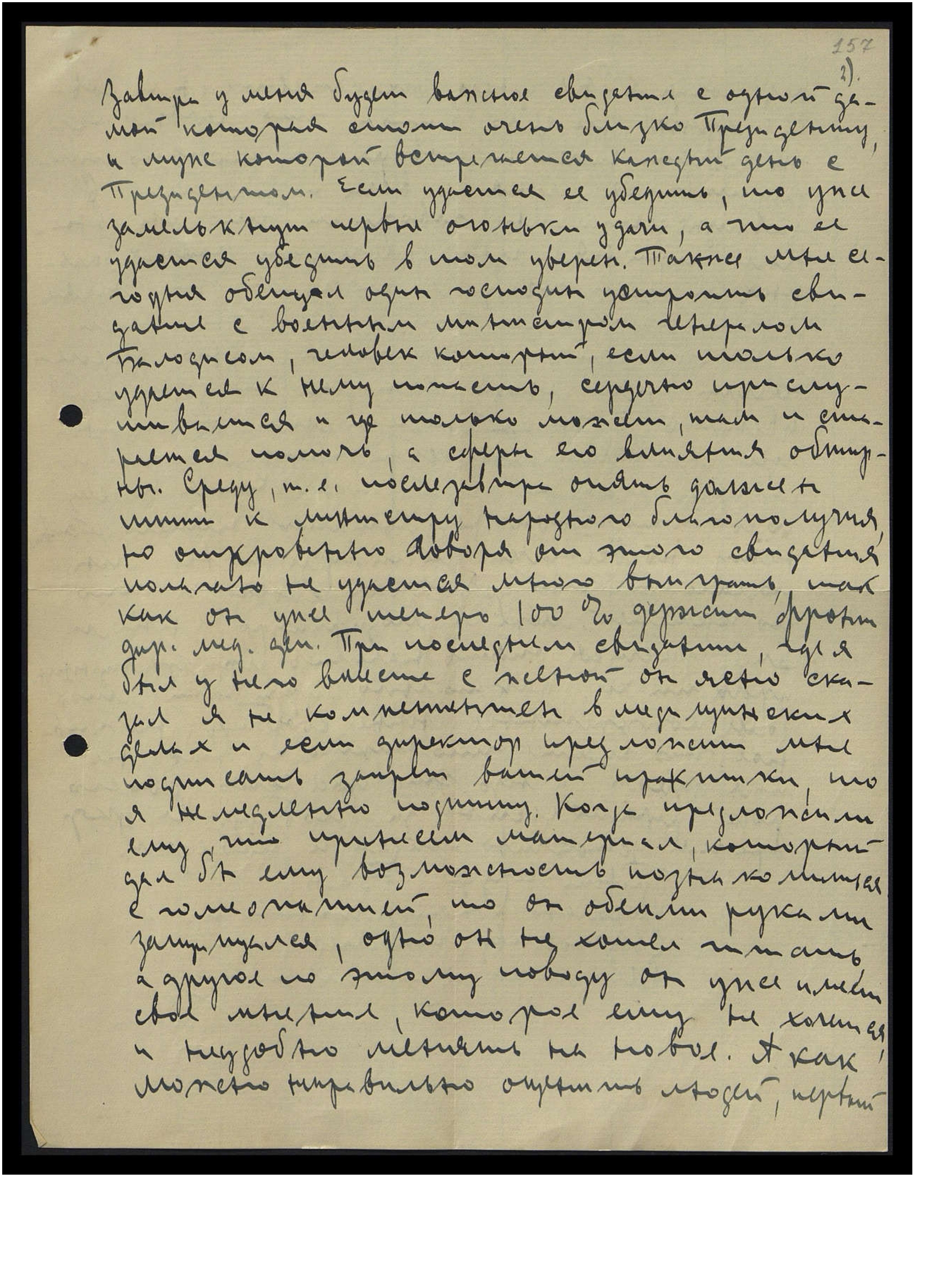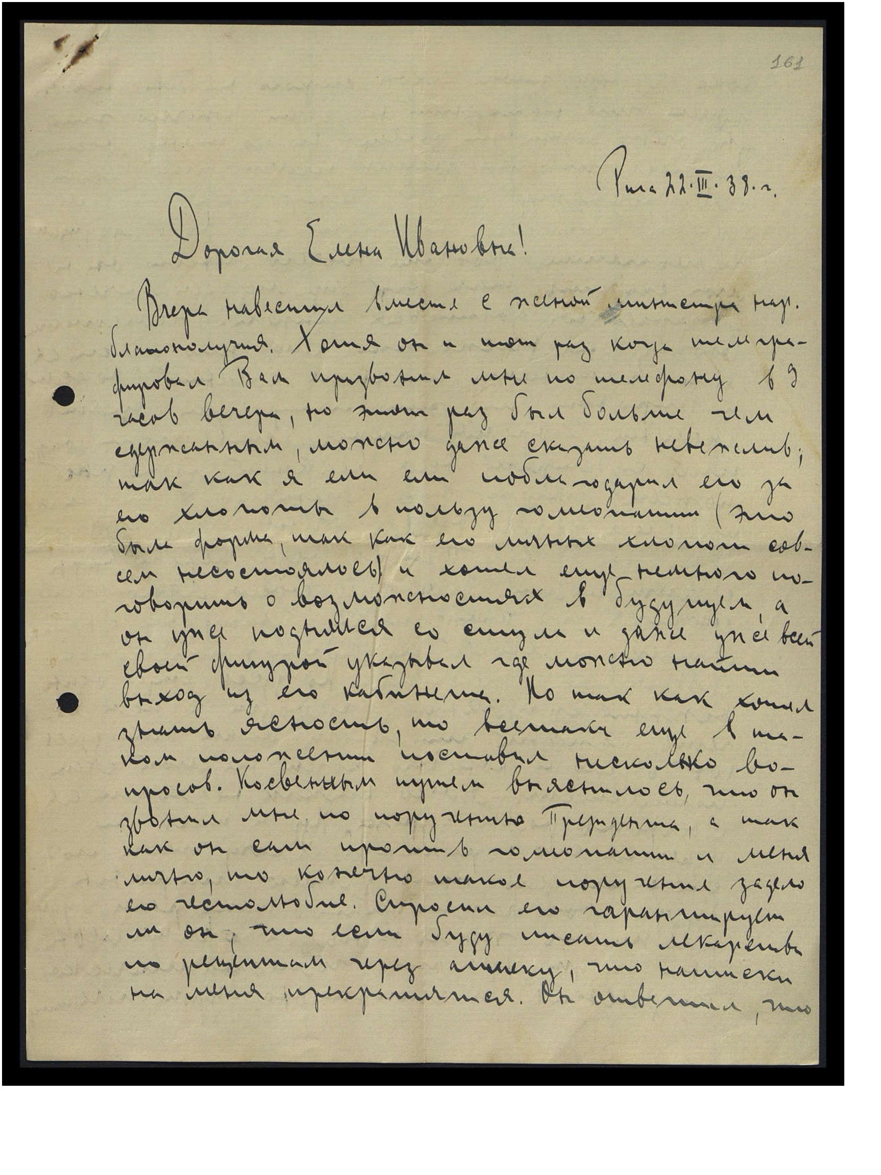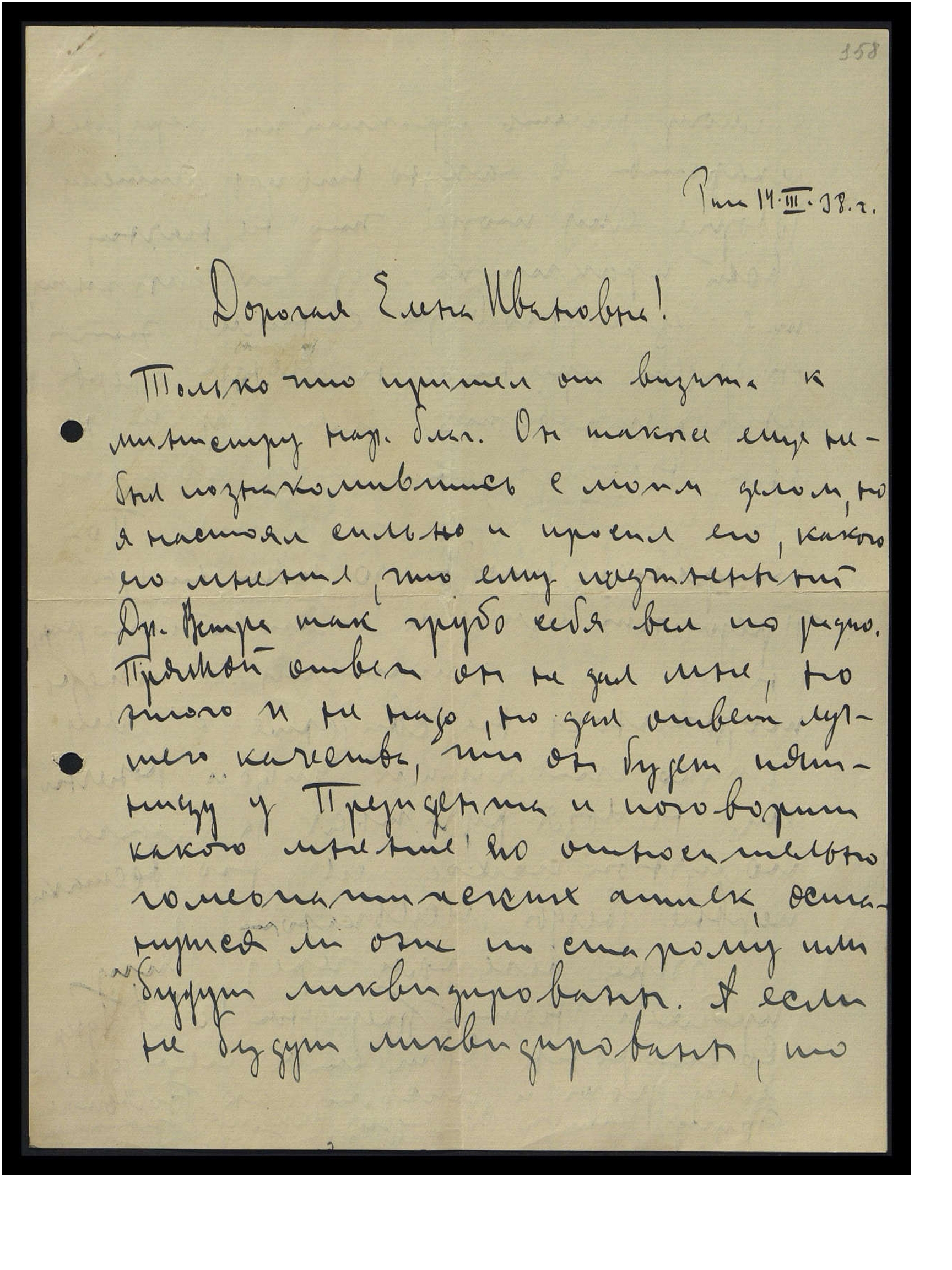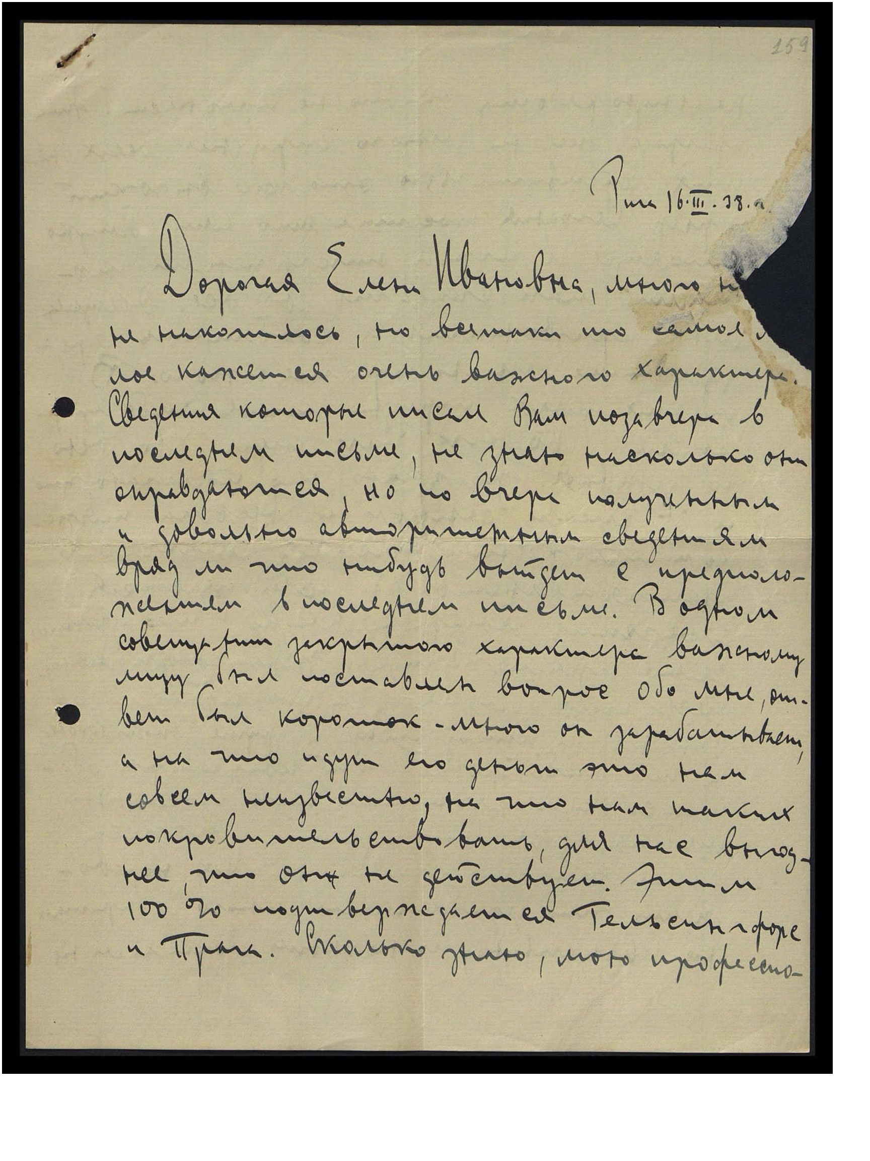 Дорогая Елена Ивановна, много [нового] не накопилось, но всё-таки то самое [малое], кажется, очень важного характера. Сведения, которые писал Вам позавчера в последнем письме, не знаю, насколько они оправдаются, но по вчера полученным и довольно авторитарным сведениям, вряд ли что-нибудь выйдет с предположением в последнем письме. В одном совещании закрытого характера важному лицу был поставлен вопрос обо мне, ответ был короток, — много он зарабатывает, а на что идут его деньги, это нам совсем неизвестно, на что нам таких покровительствовать, для нас выгоднее, что они не действуют. Этим 100% подтверждается Гельсингфорс и Прага. Сколько знаю, мою профессиональную