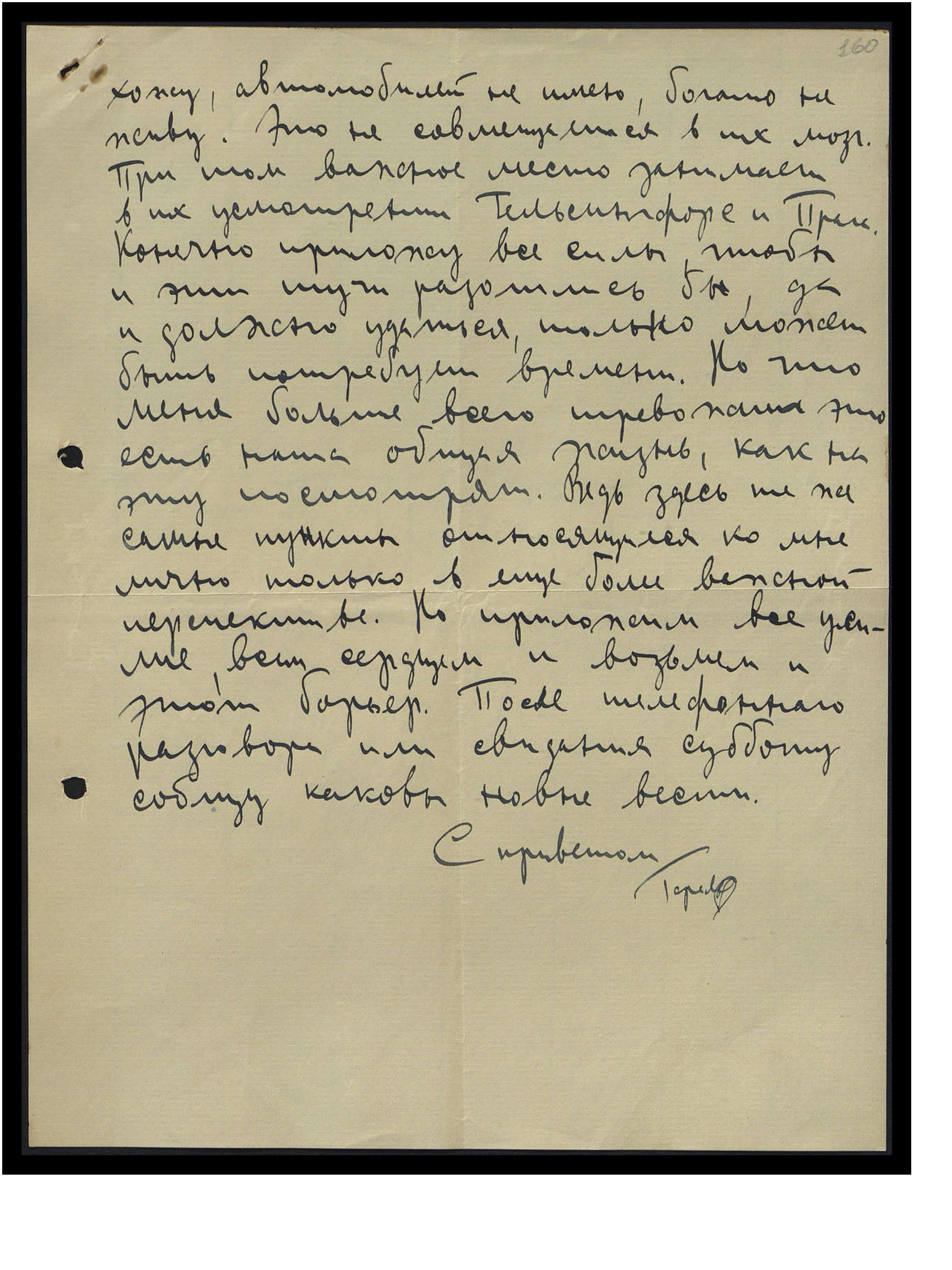 хожу, автомобилей не имею, богато не живу. Это не совмещается в их мозг. При том важное место занимает в их усмотрении Гельсингфорс и Прага. Конечно, приложу все силы, чтобы и эти тучи разошлись бы, да и должно удаться, только, может быть, потребует времени. Но что меня больше всего тревожит это есть наша общая жизнь, как на это посмотрят. Ведь здесь те же самые пункты, относящиеся ко мне лично только в ещё более важной перспективе. Но приложим всё усилие, всем сердцем и возьмём и этот барьер. После телефонного разговора или свидания субботу сообщу каковы новые вести.