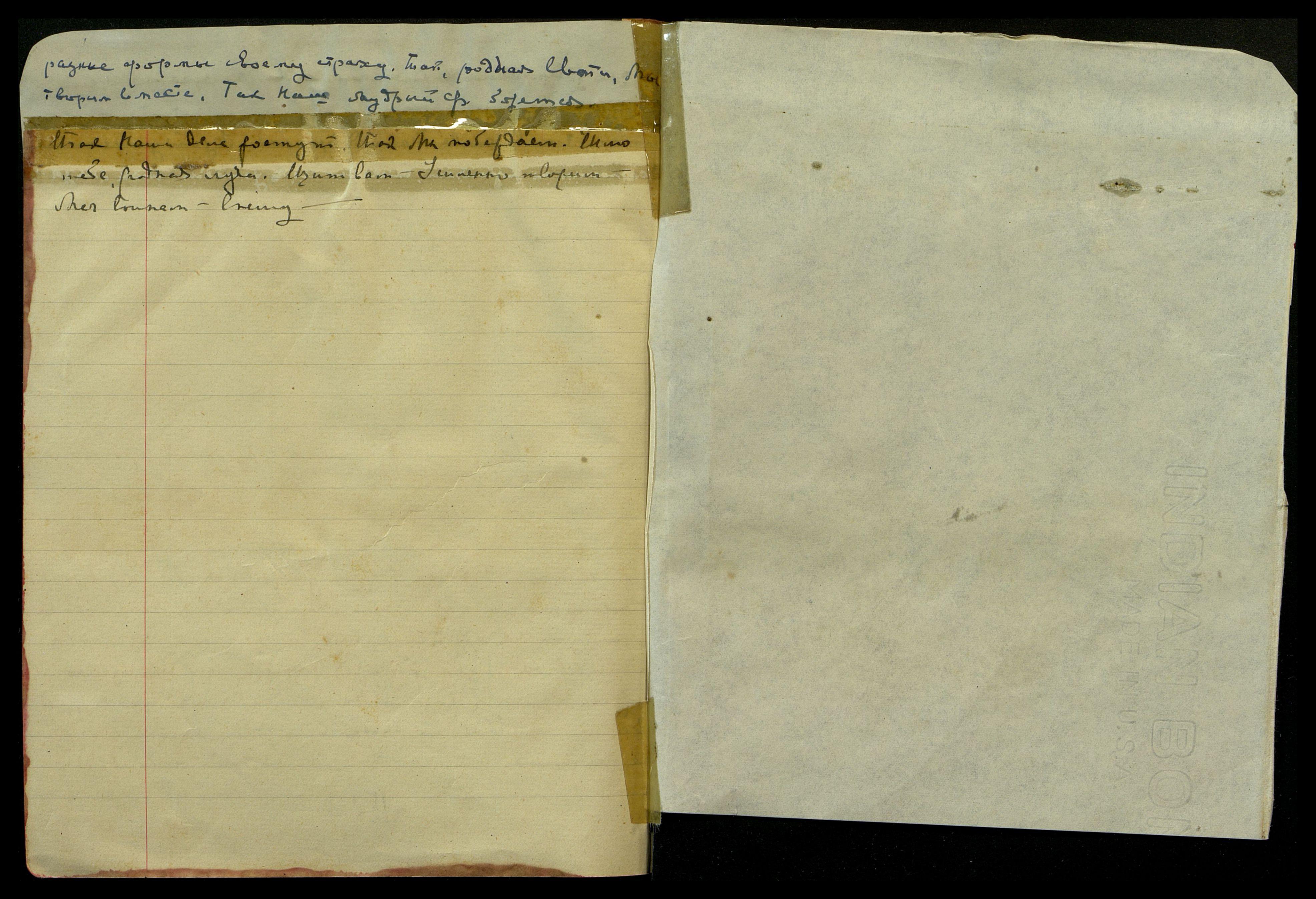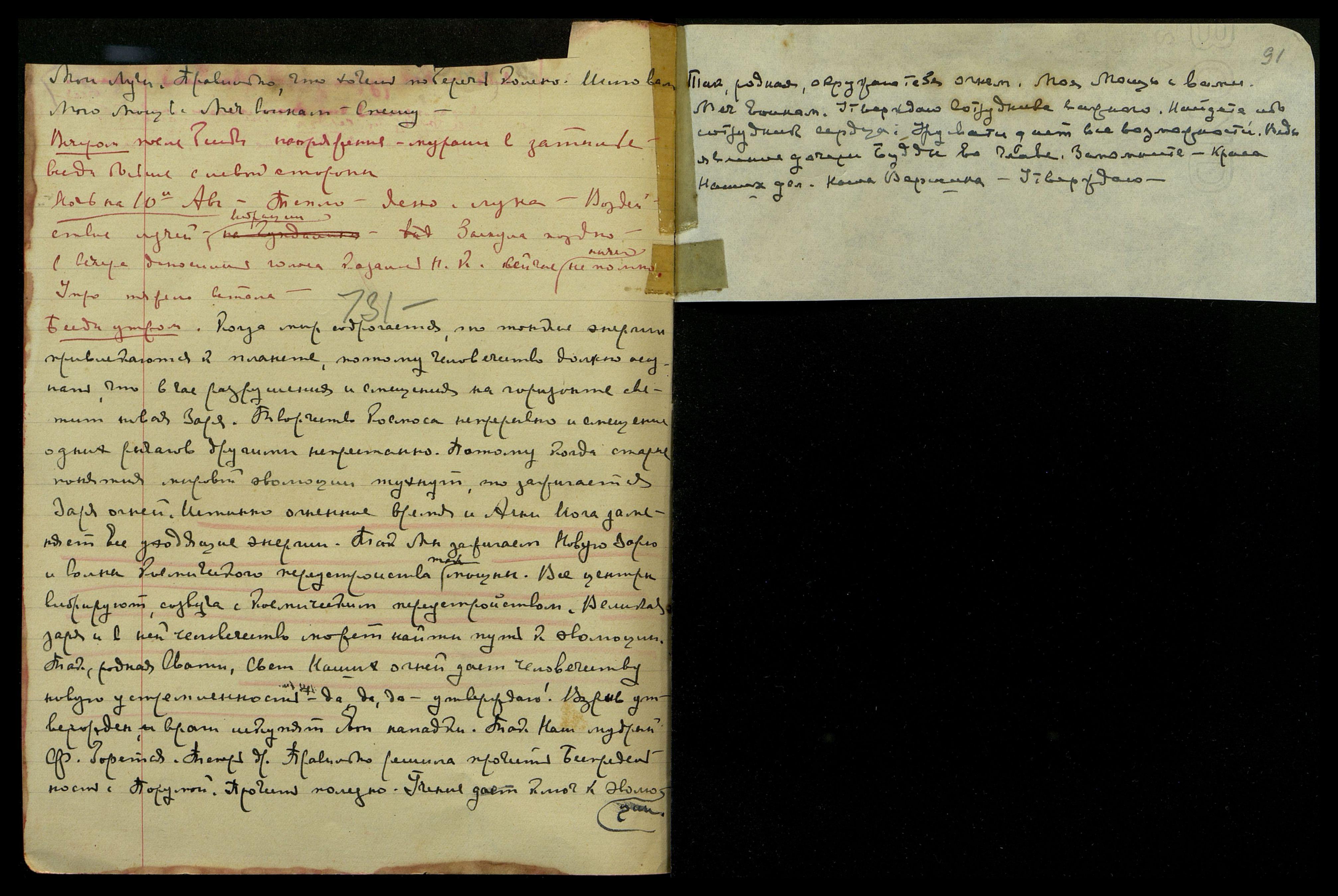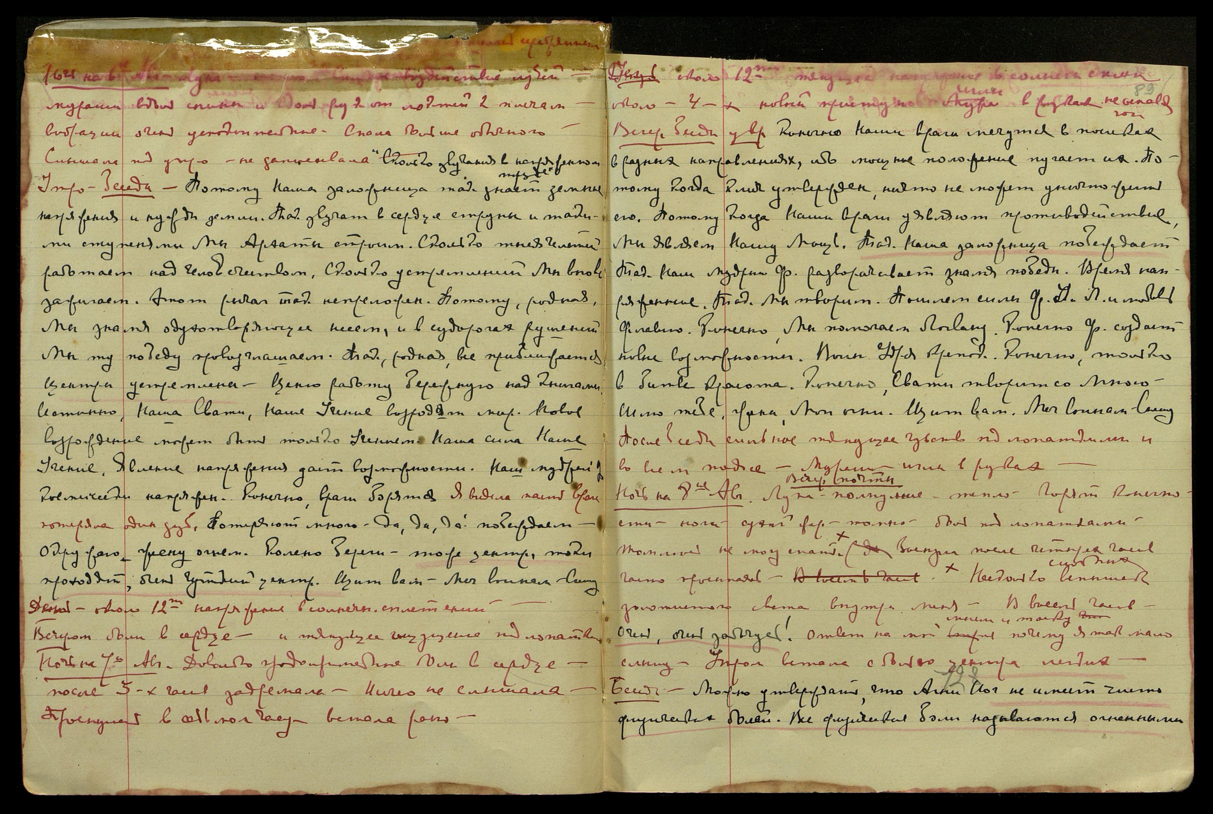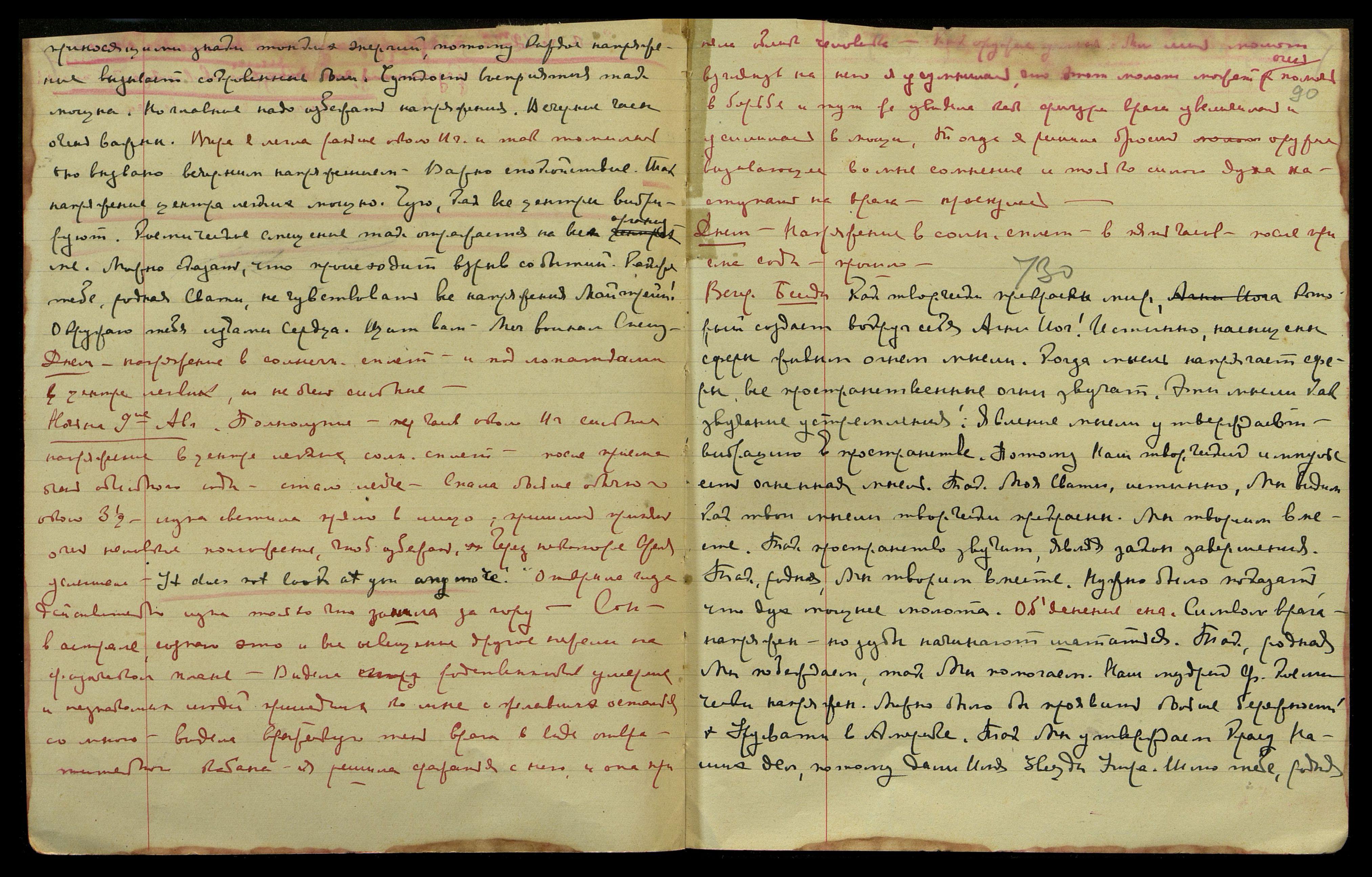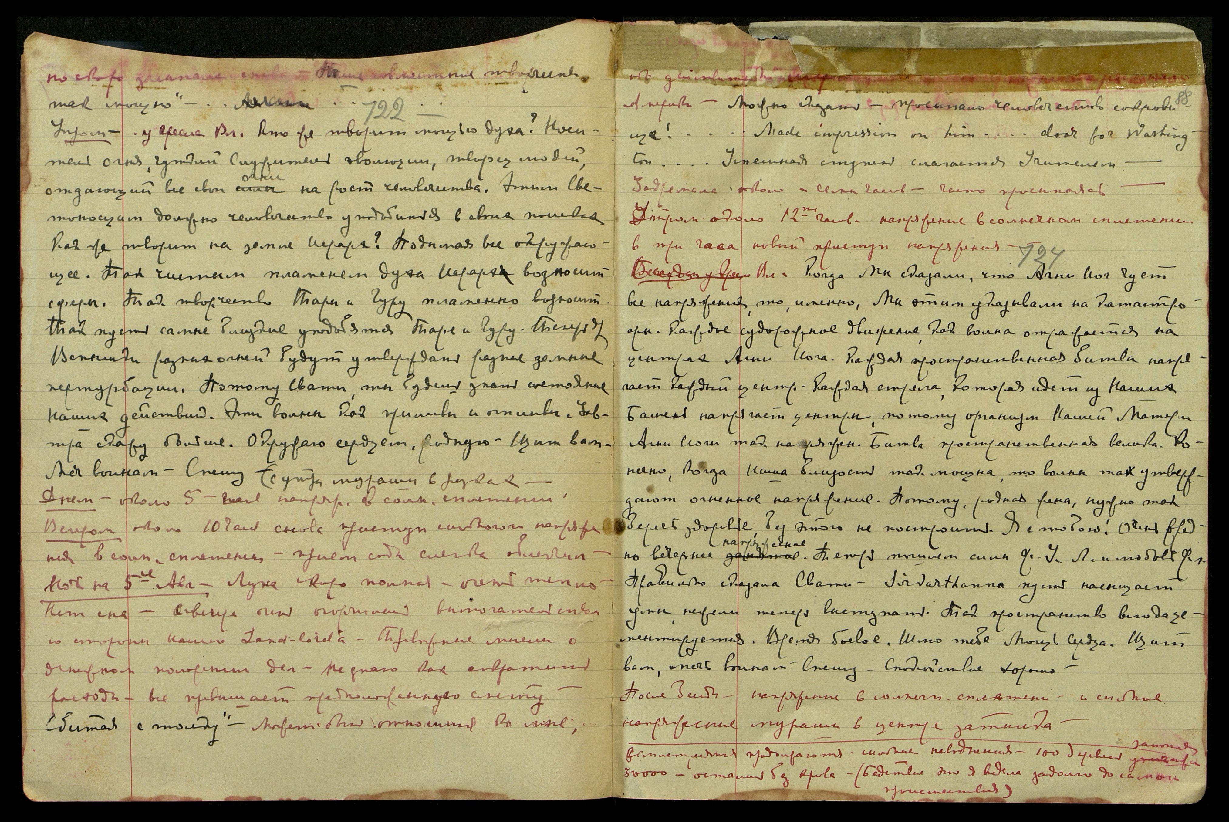 Ночь на 5-ое авг[уста]. Луна скоро полная, очень тепло. Нет сна. С вечера очень огорчилась вымогательством со стороны нашего Land-lord’a. Тревожные мысли о денежном положении дел. Не знаю как сократить расходы, всё превышает предложенную смету. "Сбитая с толку". Может быть, относится ко мне, ибо действительно [несколько слов неразборчиво] Америки. "Можно сказать - просыпало человечество сокровище! ... Made impressim on him... door for Washington...[англ.: Произвел на него впечатление... дверь в Вашингтон...] Успешная ступень слагается Учителем". Задремала около семи часов, часто просыпаясь.