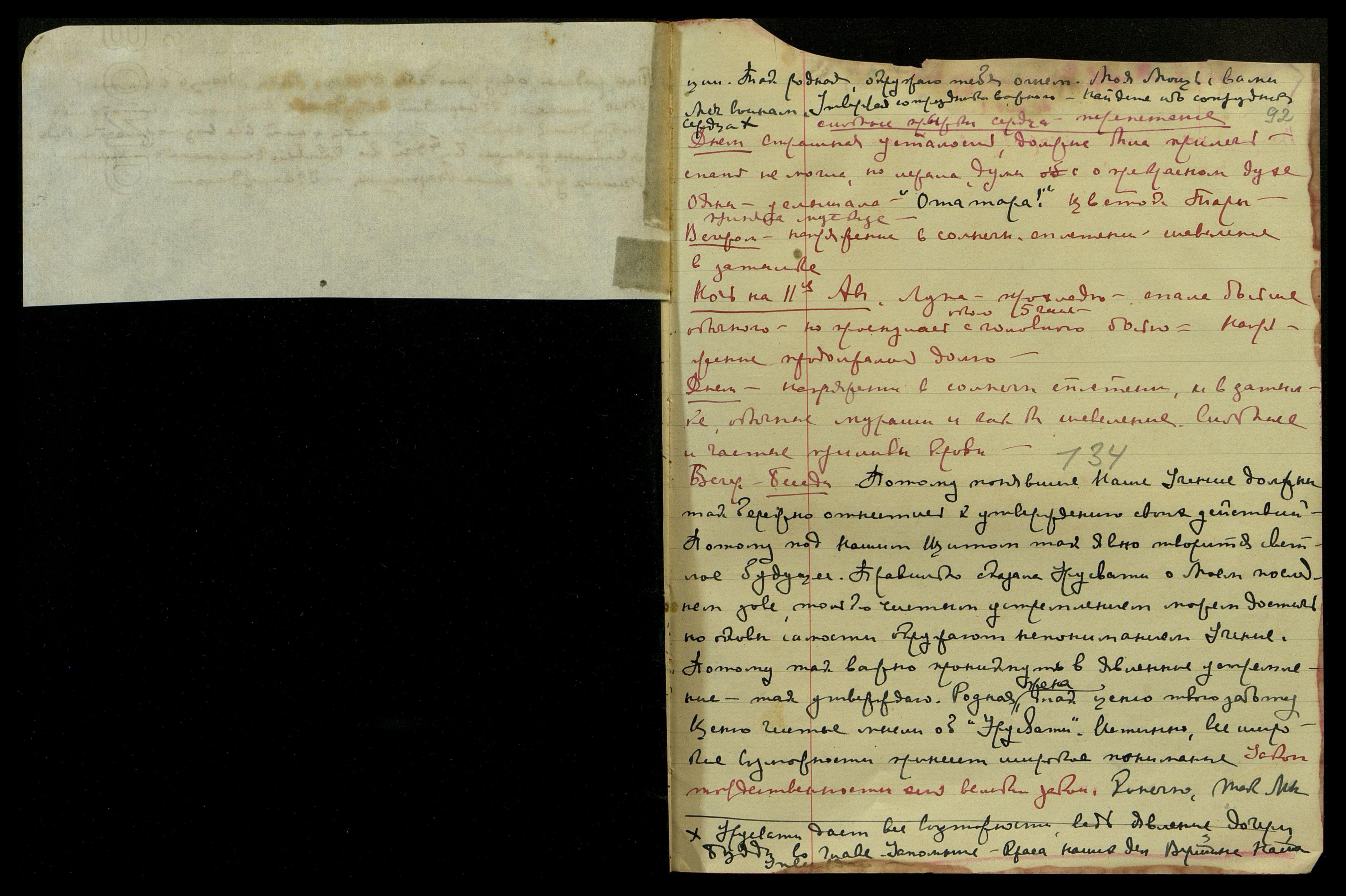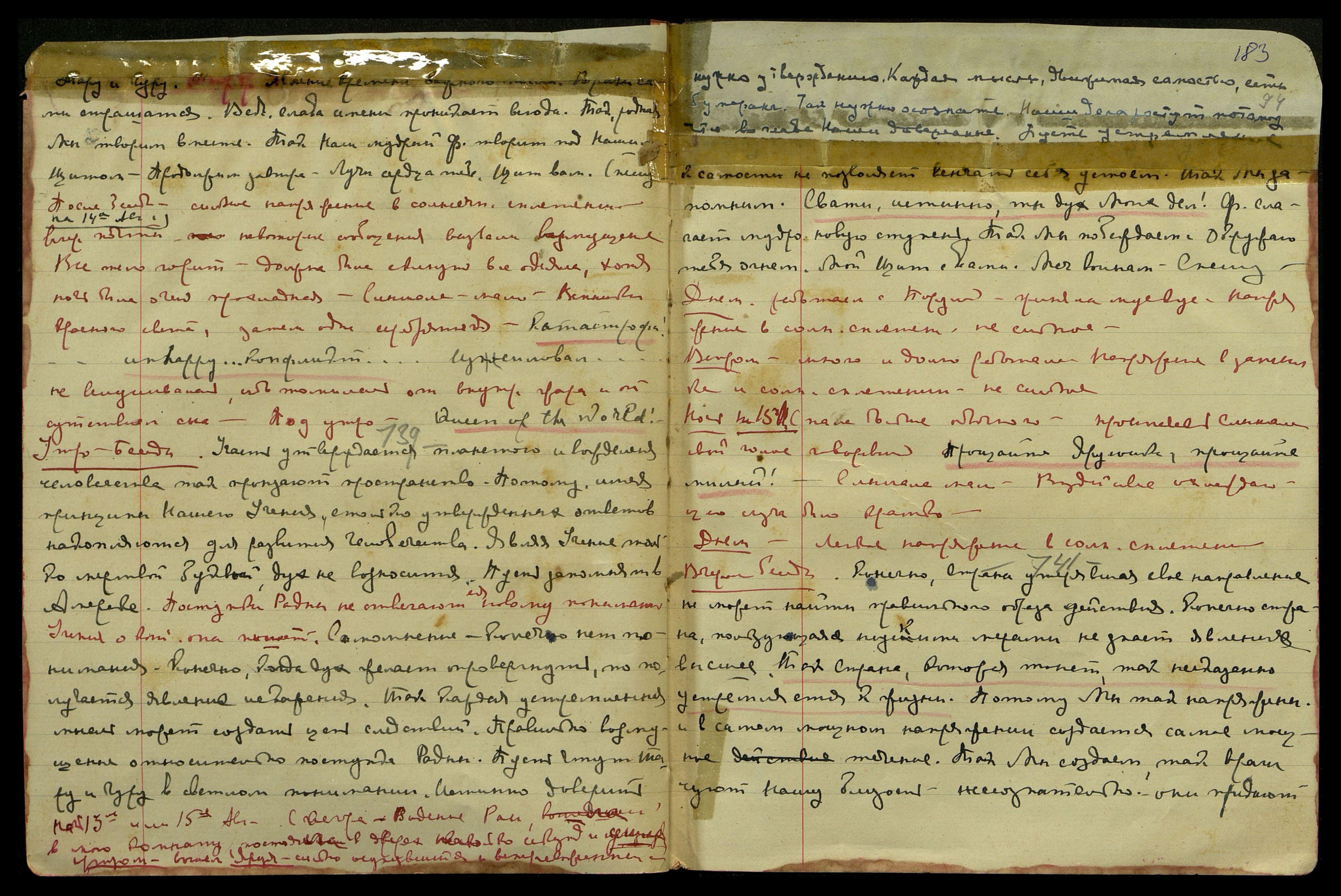 Вечер на 14-ое авг[уста], почта, некоторые сообщения вызвали возмущение. Всё тело горит, должна была скинуть все одеяла, хотя ночь была очень прохладная. Слышала мало. Вспышки красного света, затем одна серебряная. "Катастрофа... unhappy [англ.: несчастный]... конфликт... Изнасиловал..." Не вслушивалась, ибо томилась от внутр[еннего] жара и отсутствия сна. Под утро: "Queen of the World! [англ.: Королева Мира!]"