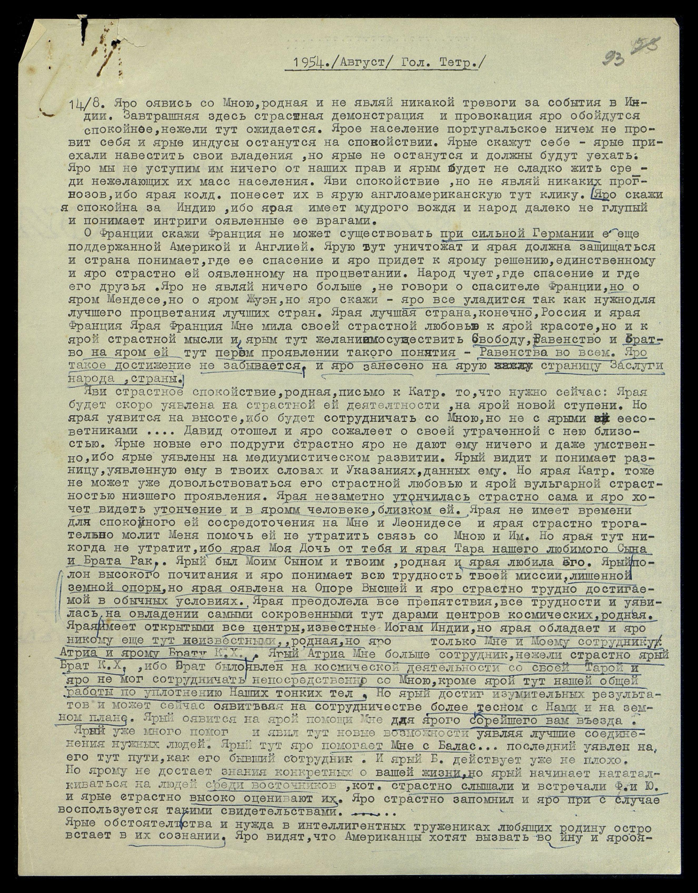 14/8. Яро оявись со Мною, родная, и не являй никакой тревоги за события в Индии. Завтрашняя здесь страстная демонстрация и провокация яро обойдутся спокойнее, нежели тут ожидается. Ярое население португальское ничем не проявит себя и ярые индусы останутся на спокойствии. Ярые скажут себе: ярые приехали навестить свои владения, но ярые не останутся и должны будут уехать. Яро мы не уступим им ничего от наших прав и ярым будет несладко жить среди не желающих их масс населения. Яви спокойствие, но не являй никаких прогнозов, ибо ярая колд[унья] понесет их в ярую англо-американскую тут клику. Яро скажи: я спокойна за Индию, ибо ярая имеет мудрого вождя и народ далеко не глупый и понимает интриги, оявленные ее врагами.