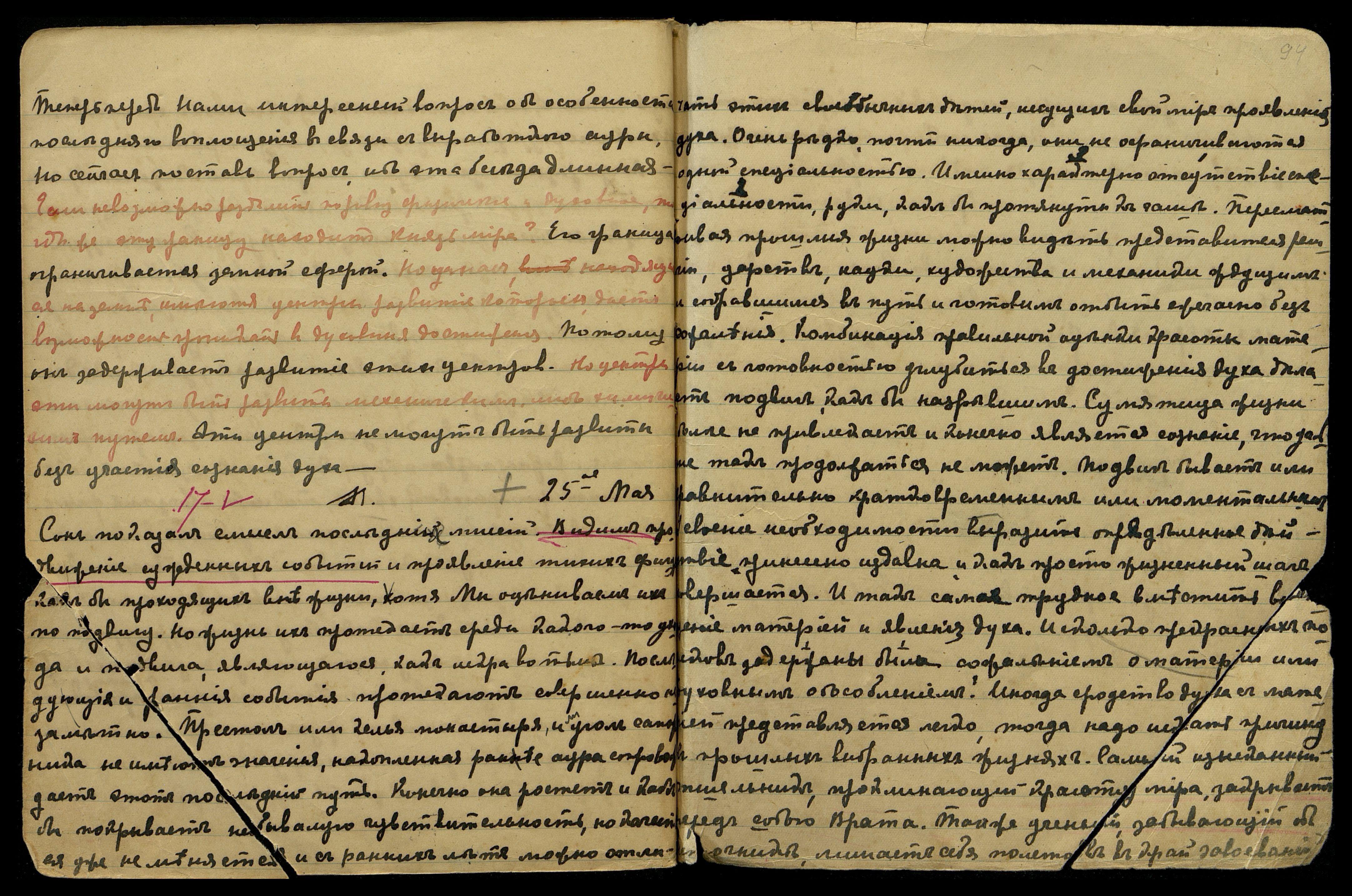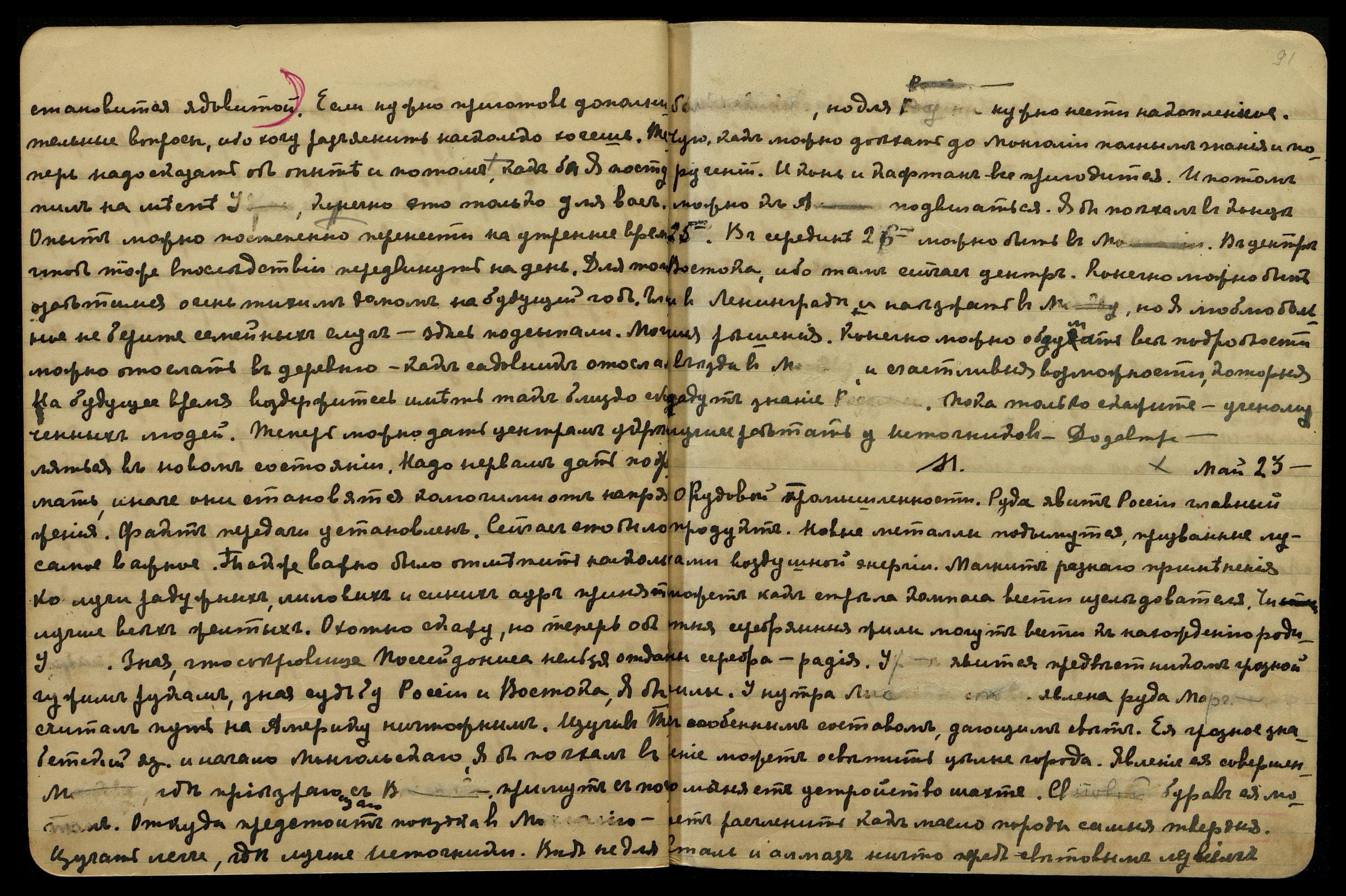 23-е мая. О рудовой промышленности. Руда явит России главный продукт. Новые металлы подымутся, призванные лучами воздушной энергии. Магнит разного применения может как стрела компаса вести исследователя. Чистые серебряные жилы могут вести к нахождению родины серебра — радия. У[ран] явится предвестником грозной силы. У нутра Лыс[...] соп[ки] явлена руда марг[...] с особенным составом, дающим свет. Её грозное значение может осветить целые города. Явление её совершенно меняет устройство шахт. Световой бурав её может расчленить как масло породы самые твёрдые. Сталь и алмаз ничто перед световым лезвием.