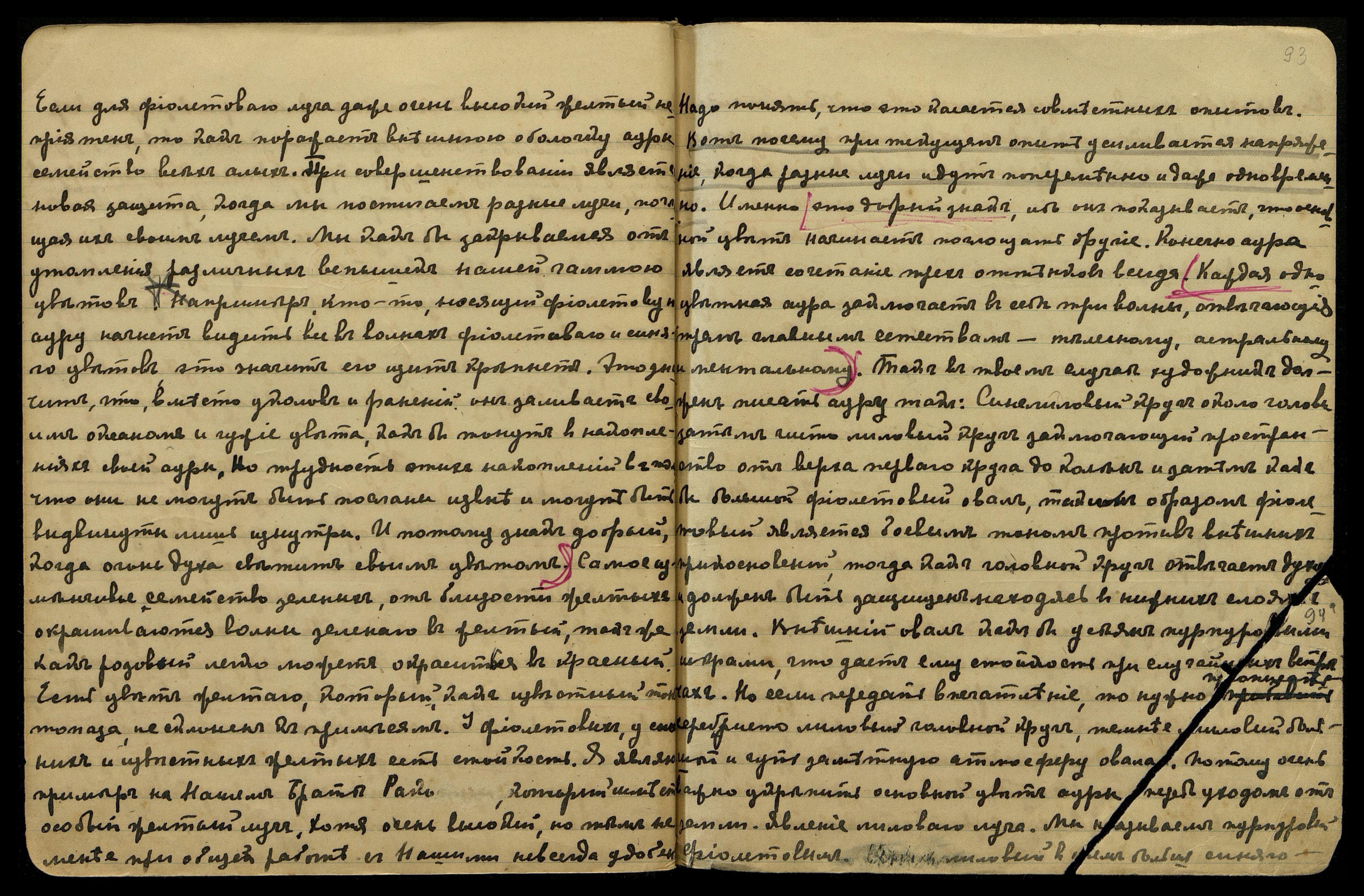 становится ядовитой. Если нужно, приготовь дополнительные вопросы, ибо хочу разъяснить, насколько хочешь. Теперь надо сказать об опыте, и потом, как бы Я поступил на месте У[драи], конечно, это только для вас. Опыт можно постепенно перенести на утреннее время, чтоб тоже впоследствии передвинуть на день. Для того озаботимся очень тихим домом на будущий год. Главное, не берите семейных слуг — здесь подсыпали. Мо[...] можно отослать в деревню, как садовник отослал. На будущее время воздержитесь иметь так близко скученных людей. Теперь можно дать центрам укрепляться в новом состоянии. Надо нервам дать подремать, иначе они становятся колючими от напряжения. Факт передачи установлен. Сейчас это было самое важное. Также важно было отметить, насколько лучи радужных, лиловых и синих аур приняты лучше всех жёлтых.