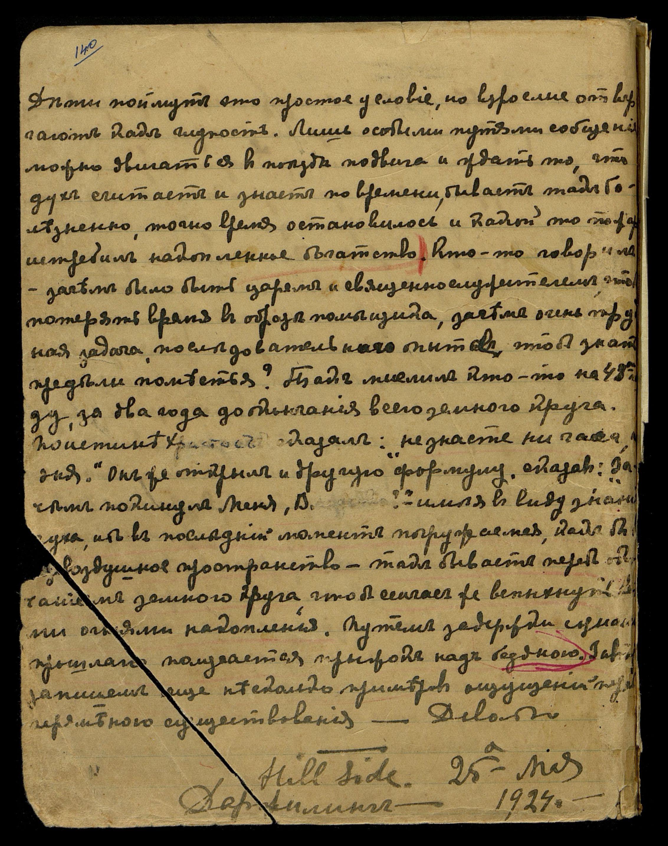 Охотно скажу, но теперь об У[драе]. Зная, что сокровище Посейдониса нельзя отдать чужим рукам, зная судьбу России и Востока, Я бы считал путь на Америку ничтожным. Изучив тибетский яз[ык] и начало монгольского, Я бы поехал в М[оскву], где приезжающего с В[остока] примут с почётом. Откуда предстоит поездка в Мо[нголию]. Изучать легче, где лучше Источники. Ведь не для бол[ьшевиков], но для Род[ины]* нужно нести накопленное. Чую, как можно доехать до Монголии полным знания и поручений. И конь, и кафтан — всё пригодится. И потом можно к А[мерике] подвигаться. Я бы поехал в конце 25-го. В середине 26-го можно быть в Мо[нголии]. В центре Востока, ибо там сейчас центр. Конечно, можно быть и в Ленинграде, и наезжать в М[оскв]у, но Я люблю большие решения. Конечно, можно обдумать все подробности въезда в М[оскву], и счастливые возможности, которые дадут знание Р[одине]. Пока только скажите — учёному лучше работать у источников. До завтра.
