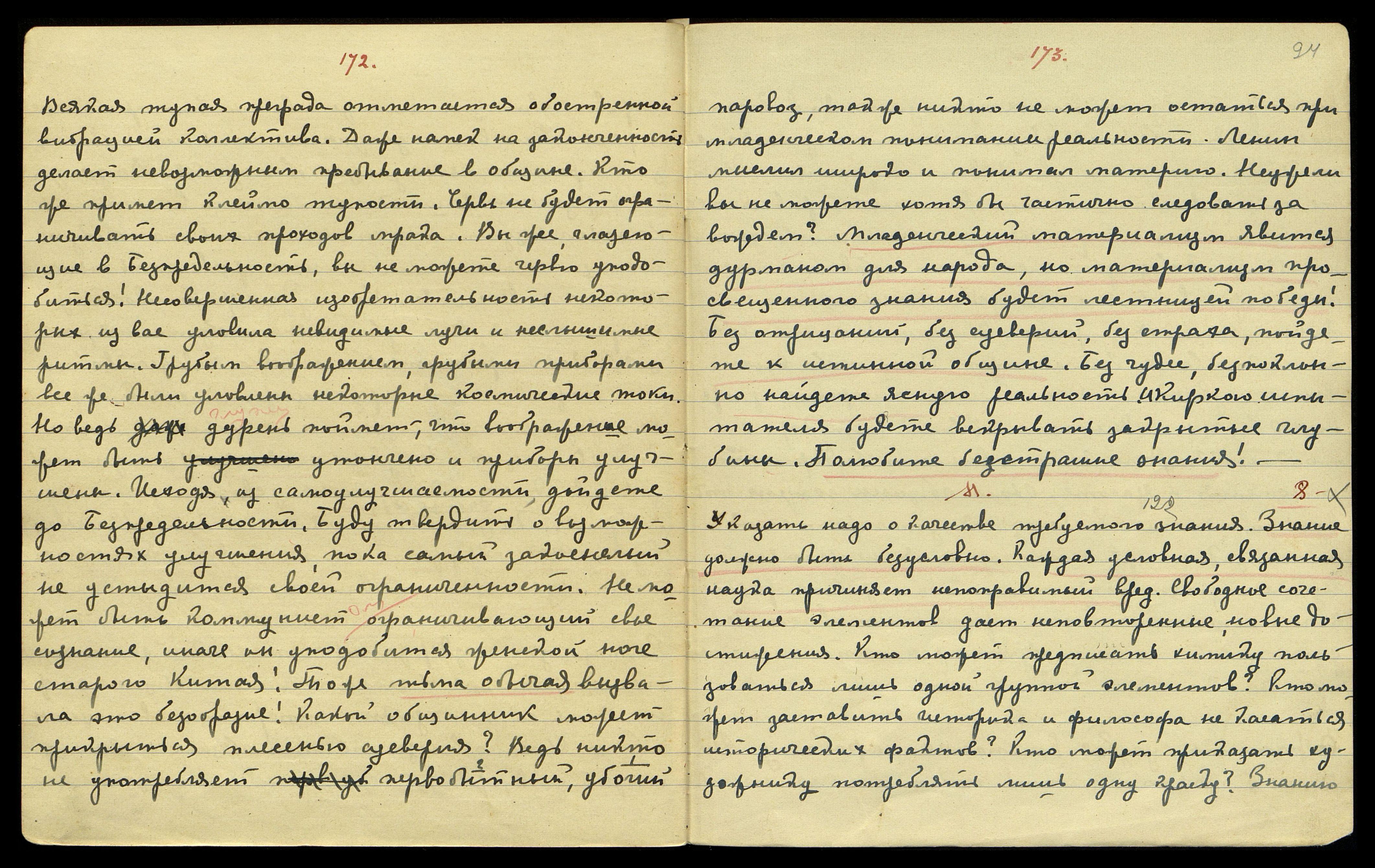 Кто же примет клеймо тупости. Червь не будет ограничивать своих проходов мрака. Вы же, глазеющие в Беспредельность, вы не можете червю уподобиться! Несовершенная изобретательность некоторых из вас уловила невидимые лучи и неслышимые ритмы. Грубым воображением, грубыми приборами всё же были уловлены некоторые космические токи. Но, ведь дурень* поймёт, что воображение может быть утончено и приборы улучшены. Исходя из самоулучшаемости, дойдёте до Беспредельности. Буду твердить о возможностях улучшения, пока самый закоснелый не устыдится своей ограниченности. Не может быть коммунистом, ограничивающий свое сознание, иначе он уподобится женской ноге старого Китая! Тоже тьма обычая вызвала это безобразие! Какой общинник может прикрываться плесенью суеверия? Ведь никто не употребляет убогий, первобытный паровоз, также никто не может остаться при младенческом понимании реальности. Ленин мыслил широко и понимал материю. Неужели вы не можете, хотя бы частично, следовать за вождём? Младенческий материализм явится дурманом для народа, но материализм просвещённого знания будет лестницей победы! Без отрицаний, без суеверий, без страха, пойдёте к истинной общине! Без чудес, без поклонов найдёте ясную реальность! И киркою испытателя будете вскрывать закрытые глубины. Полюбите бесстрашие знания!