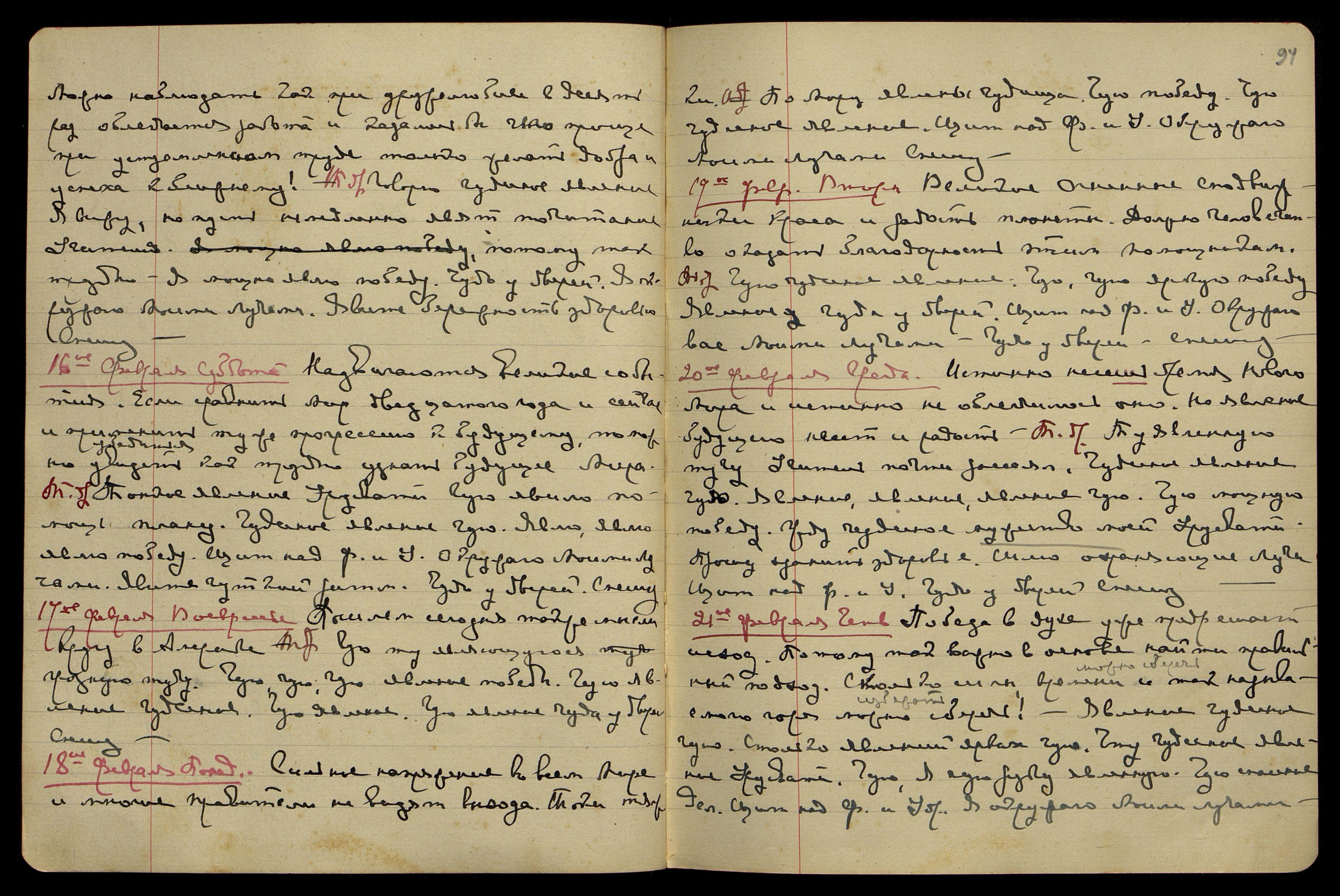 17-ое февраля. Воскресенье. Пошлём сегодня также мысли кругу в Америке. Т[еперь] др[угое]. Чую ту являющуюся грозную тучу. Чую, Чую, Чую явление победы. Чую явление чудесное. Чую явление. Чую явление чуда у дверей. Спешу.