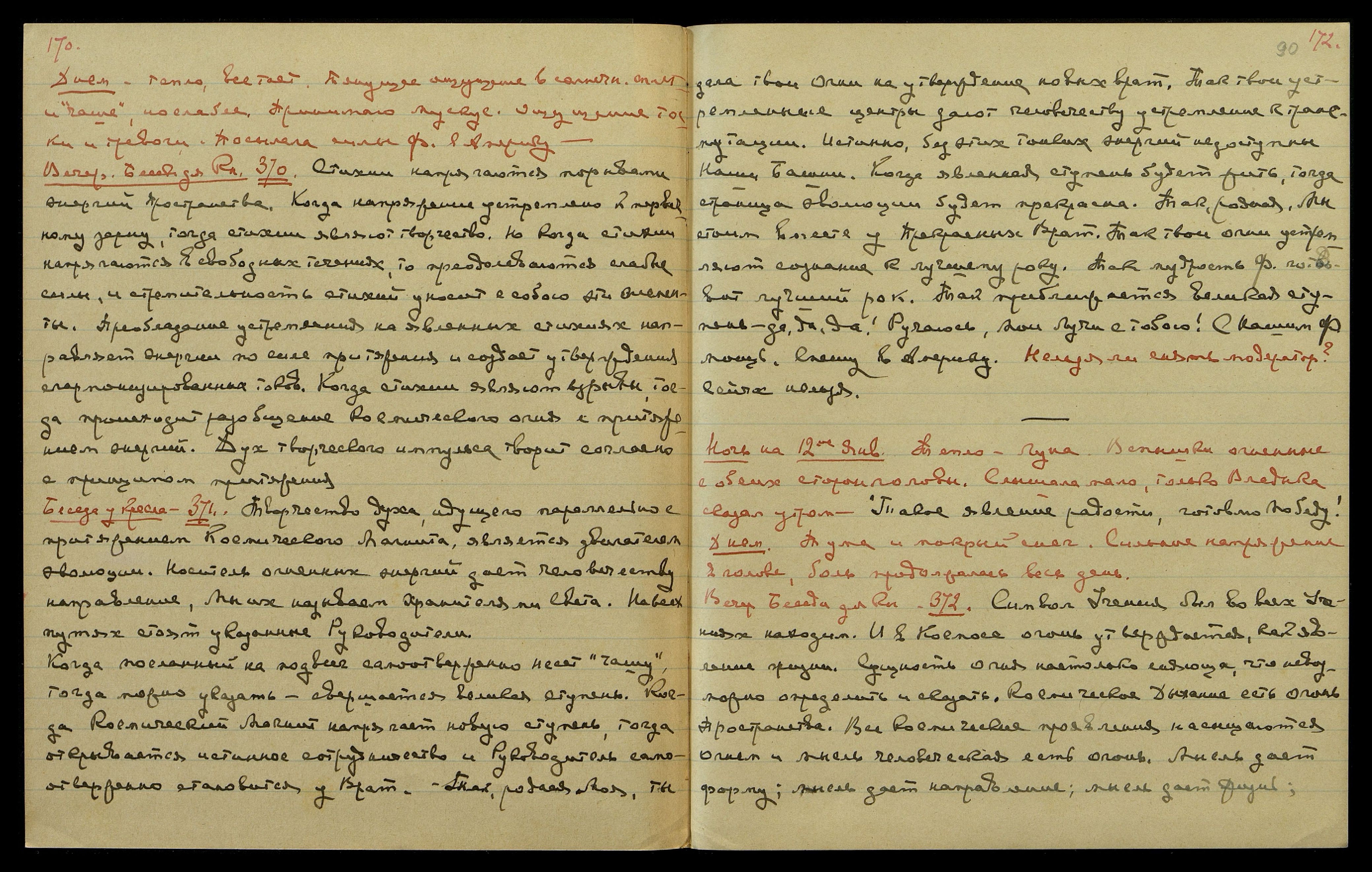 Ночь на 11-ое янв[аря]. Теплая, лунная, но туманная ночь. Приливы крови, душно. Много сине-серебряных звезд. Слышала, но очень трудно улавливать, одет модератор. Казалось, Сестра Ор[иола] просила Владыку о помощи, и Владыка говорил, что помощь эта нужна не нам, но сотрудникам нашим. Осталось воспоминание, что я была в Америке, говорила с Ч[арльзом]Крэном и его приятелем, незнакомым мне. Помню, как я сорвалась с большой высоты и летела вниз, увидела, точно бы мне подставили мою постель, и я проснулась, услышала слова Владыки – «Отвожу гром и молнии» - скоро – повернется…слышала еще, не записывала.