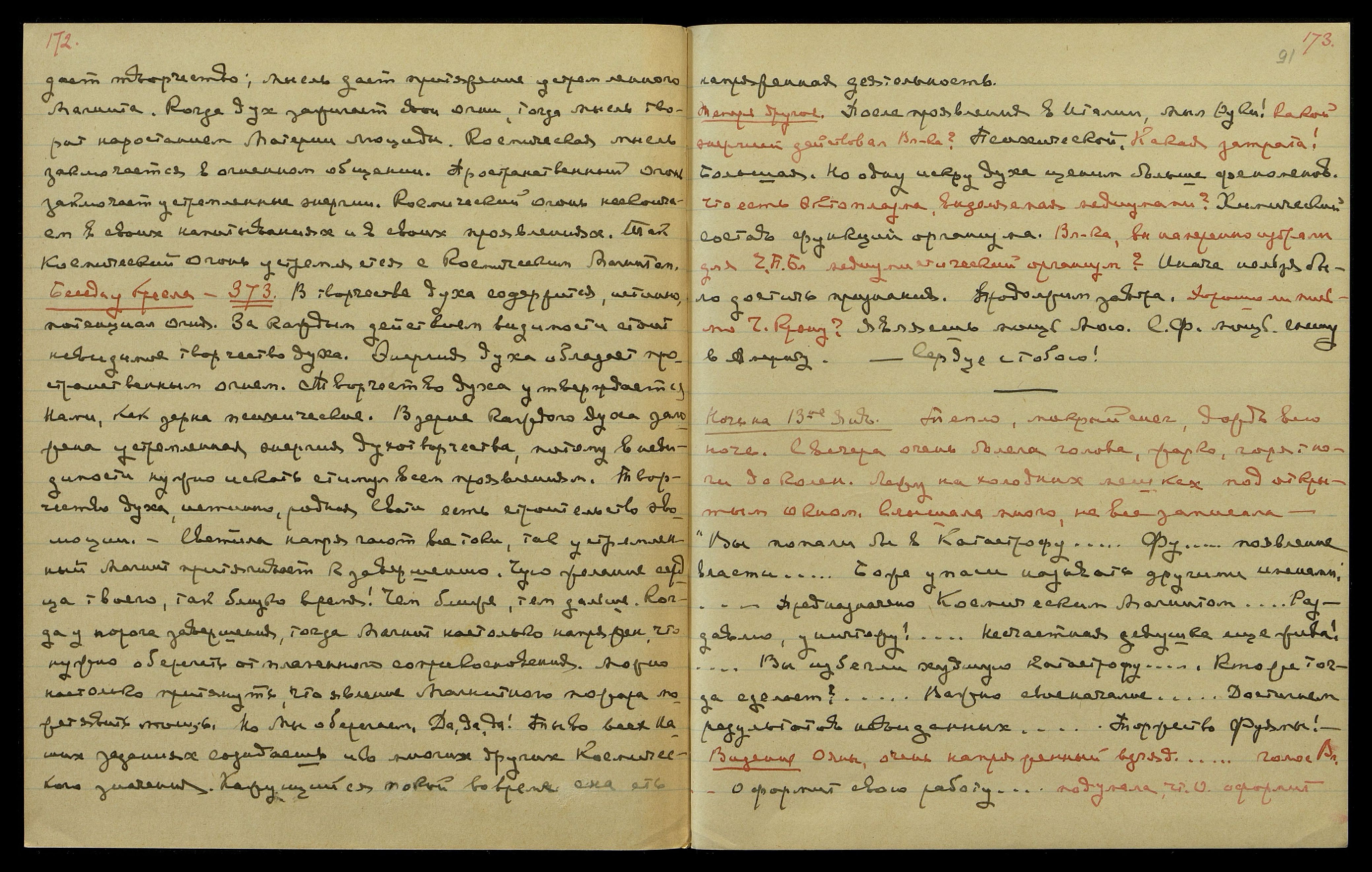 Ночь на 13-ое янв[аря]. Тепло, мокрый снег, дождь всю ночь. С вечера очень болела голова, жарко, горят ноги до колен. Лежу на холодных мешках под открытым окном. Слышала много, не все записала: «Вы попали бы в Катастрофу… Фу…появление власти… Боже упаси называть другими именами…Предназначено Космическим магнитом…Раздавлю, уничтожу!... Несчастная девушка еще жива!...Вы избегли худшую катастрофу… Кто же тогда сделает?... Важно своеначалие… Достигнем результатов невидимых… Торжество Фуямы!