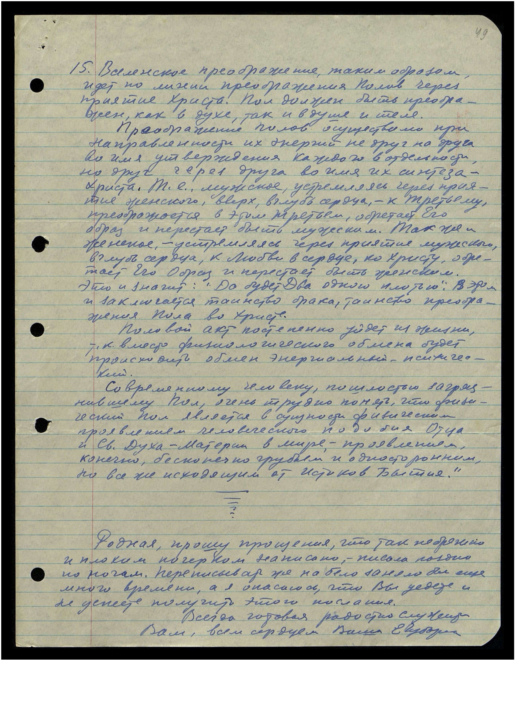 Когда пол-личность в нас направлен ко Христу, мы обретаем жизнь вечную. Когда пол в нас направлен к земле, к другому полу, а не к Третьему - Единому, мы обретаем распадение и смерть. Принять Иисуса Христа, как Господина души и тела - значит освободиться от пола...